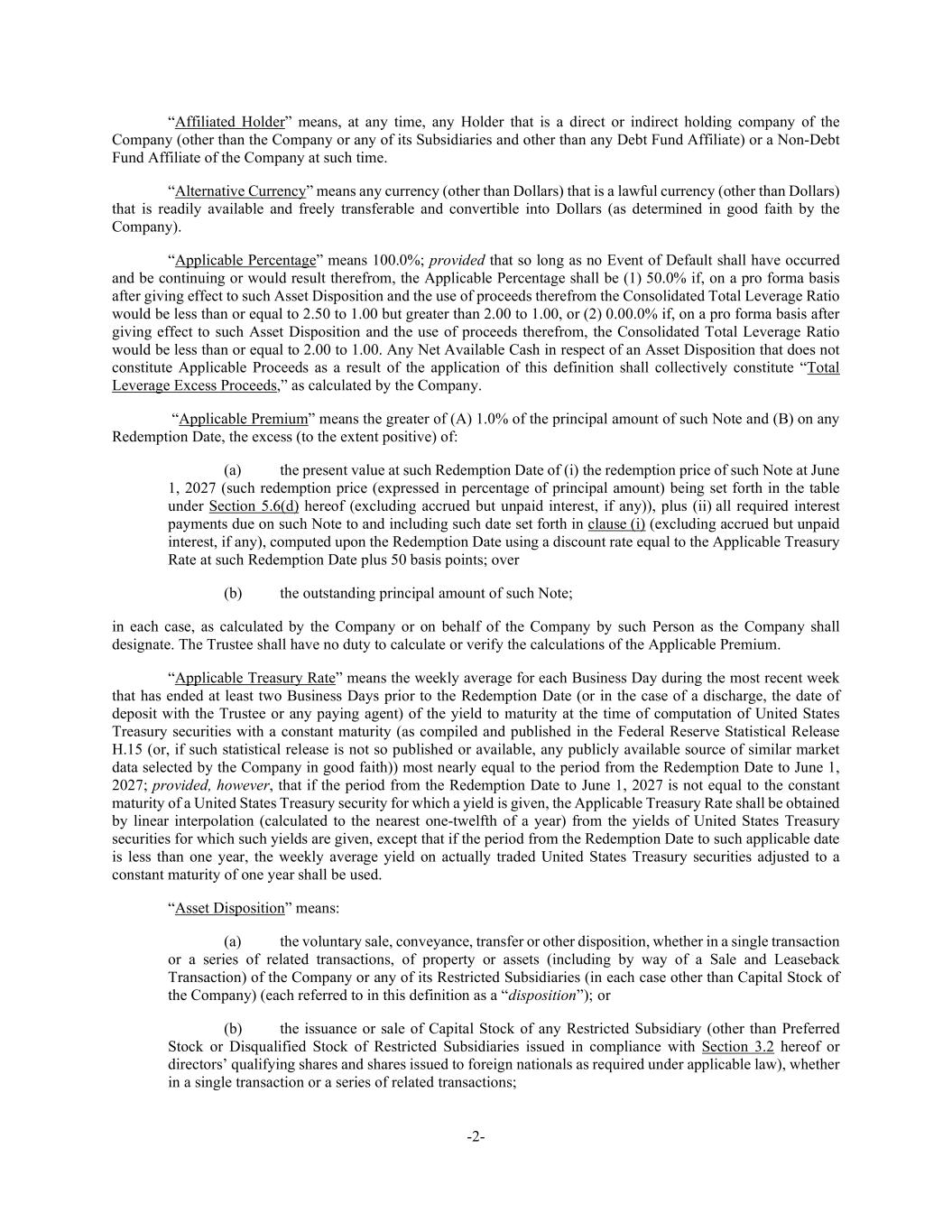 -2- “Affiliated Holder” means, at any time, any Holder that is a direct or indirect holding company of the Company (other than the Company or any of its Subsidiaries and other than any Debt Fund Affiliate) or a Non-Debt Fund Affiliate of the Company at such time. “Alternative Currency” means any currency (other than Dollars) that is a lawful currency (other than Dollars) that is readily available and freely transferable and convertible into Dollars (as determined in good faith by the Company). “Applicable Percentage” means 100.0%; provided that so long as no Event of Default shall have occurred and be continuing or would result therefrom, the Applicable Percentage shall be (1) 50.0% if, on a pro forma basis after giving effect to such Asset Disposition and the use of proceeds therefrom the Consolidated Total Leverage Ratio would be less than or equal to 2.50 to 1.00 but greater than 2.00 to 1.00, or (2) 0.00.0% if, on a pro forma basis after giving effect to such Asset Disposition and the use of proceeds therefrom, the Consolidated Total Leverage Ratio would be less than or equal to 2.00 to 1.00. Any Net Available Cash in respect of an Asset Disposition that does not constitute Applicable Proceeds as a result of the application of this definition shall collectively constitute “Total Leverage Excess Proceeds,” as calculated by the Company. “Applicable Premium” means the greater of (A) 1.0% of the principal amount of such Note and (B) on any Redemption Date, the excess (to the extent positive) of: (a) the present value at such Redemption Date of (i) the redemption price of such Note at June 1, 2027 (such redemption price (expressed in percentage of principal amount) being set forth in the table under Section 5.6(d) hereof (excluding accrued but unpaid interest, if any)), plus (ii) all required interest payments due on such Note to and including such date set forth in clause (i) (excluding accrued but unpaid interest, if any), computed upon the Redemption Date using a discount rate equal to the Applicable Treasury Rate at such Redemption Date plus 50 basis points; over (b) the outstanding principal amount of such Note; in each case, as calculated by the Company or on behalf of the Company by such Person as the Company shall designate. The Trustee shall have no duty to calculate or verify the calculations of the Applicable Premium. “Applicable Treasury Rate” means the weekly average for each Business Day during the most recent week that has ended at least two Business Days prior to the Redemption Date (or in the case of a discharge, the date of deposit with the Trustee or any paying agent) of the yield to maturity at the time of computation of United States Treasury securities with a constant maturity (as compiled and published in the Federal Reserve Statistical Release H.15 (or, if such statistical release is not so published or available, any publicly available source of similar market data selected by the Company in good faith)) most nearly equal to the period from the Redemption Date to June 1, 2027; provided, however, that if the period from the Redemption Date to June 1, 2027 is not equal to the constant maturity of a United States Treasury security for which a yield is given, the Applicable Treasury Rate shall be obtained by linear interpolation (calculated to the nearest one-twelfth of a year) from the yields of United States Treasury securities for which such yields are given, except that if the period from the Redemption Date to such applicable date is less than one year, the weekly average yield on actually traded United States Treasury securities adjusted to a constant maturity of one year shall be used. “Asset Disposition” means: (a) the voluntary sale, conveyance, transfer or other disposition, whether in a single transaction or a series of related transactions, of property or assets (including by way of a Sale and Leaseback Transaction) of the Company or any of its Restricted Subsidiaries (in each case other than Capital Stock of the Company) (each referred to in this definition as a “disposition”); or (b) the issuance or sale of Capital Stock of any Restricted Subsidiary (other than Preferred Stock or Disqualified Stock of Restricted Subsidiaries issued in compliance with Section 3.2 hereof or directors’ qualifying shares and shares issued to foreign nationals as required under applicable law), whether in a single transaction or a series of related transactions;
