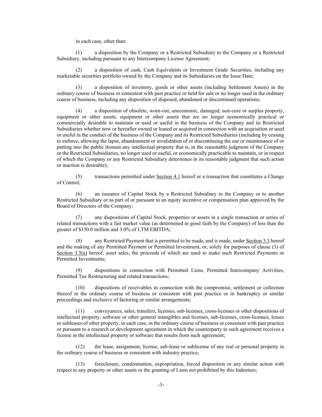 -3- in each case, other than: (1) a disposition by the Company or a Restricted Subsidiary to the Company or a Restricted Subsidiary, including pursuant to any Intercompany License Agreement; (2) a disposition of cash, Cash Equivalents or Investment Grade Securities, including any marketable securities portfolio owned by the Company and its Subsidiaries on the Issue Date; (3) a disposition of inventory, goods or other assets (including Settlement Assets) in the ordinary course of business or consistent with past practice or held for sale or no longer used in the ordinary course of business, including any disposition of disposed, abandoned or discontinued operations; (4) a disposition of obsolete, worn-out, uneconomic, damaged, non-core or surplus property, equipment or other assets, equipment or other assets that are no longer economically practical or commercially desirable to maintain or used or useful in the business of the Company and its Restricted Subsidiaries whether now or hereafter owned or leased or acquired in connection with an acquisition or used or useful in the conduct of the business of the Company and its Restricted Subsidiaries (including by ceasing to enforce, allowing the lapse, abandonment or invalidation of or discontinuing the use or maintenance of or putting into the public domain any intellectual property that is, in the reasonable judgment of the Company or the Restricted Subsidiaries, no longer used or useful, or economically practicable to maintain, or in respect of which the Company or any Restricted Subsidiary determines in its reasonable judgment that such action or inaction is desirable); (5) transactions permitted under Section 4.1 hereof or a transaction that constitutes a Change of Control; (6) an issuance of Capital Stock by a Restricted Subsidiary to the Company or to another Restricted Subsidiary or as part of or pursuant to an equity incentive or compensation plan approved by the Board of Directors of the Company; (7) any dispositions of Capital Stock, properties or assets in a single transaction or series of related transactions with a fair market value (as determined in good faith by the Company) of less than the greater of $150.0 million and 3.0% of LTM EBITDA; (8) any Restricted Payment that is permitted to be made, and is made, under Section 3.3 hereof and the making of any Permitted Payment or Permitted Investment, or, solely for purposes of clause (3) of Section 3.5(a) hereof, asset sales, the proceeds of which are used to make such Restricted Payments or Permitted Investments; (9) dispositions in connection with Permitted Liens, Permitted Intercompany Activities, Permitted Tax Restructuring and related transactions; (10) dispositions of receivables in connection with the compromise, settlement or collection thereof in the ordinary course of business or consistent with past practice or in bankruptcy or similar proceedings and exclusive of factoring or similar arrangements; (11) conveyances, sales, transfers, licenses, sub-licenses, cross-licenses or other dispositions of intellectual property, software or other general intangibles and licenses, sub-licenses, cross-licenses, leases or subleases of other property, in each case, in the ordinary course of business or consistent with past practice or pursuant to a research or development agreement in which the counterparty to such agreement receives a license in the intellectual property or software that results from such agreement; (12) the lease, assignment, license, sub-lease or sublicense of any real or personal property in the ordinary course of business or consistent with industry practice; (13) foreclosure, condemnation, expropriation, forced disposition or any similar action with respect to any property or other assets or the granting of Liens not prohibited by this Indenture;
