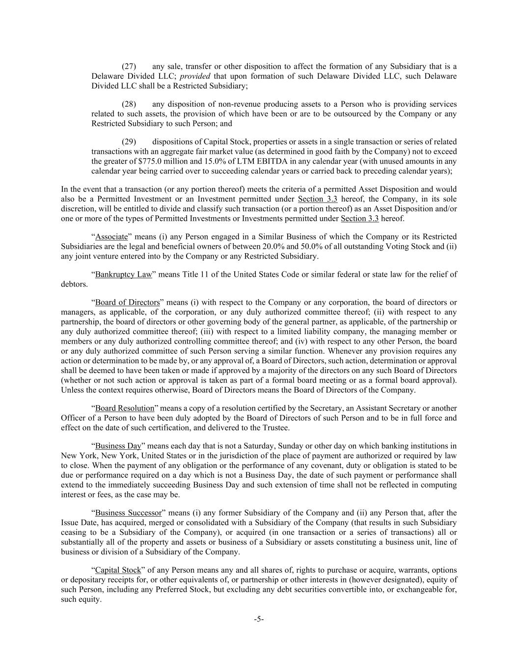 -5- (27) any sale, transfer or other disposition to affect the formation of any Subsidiary that is a Delaware Divided LLC; provided that upon formation of such Delaware Divided LLC, such Delaware Divided LLC shall be a Restricted Subsidiary; (28) any disposition of non-revenue producing assets to a Person who is providing services related to such assets, the provision of which have been or are to be outsourced by the Company or any Restricted Subsidiary to such Person; and (29) dispositions of Capital Stock, properties or assets in a single transaction or series of related transactions with an aggregate fair market value (as determined in good faith by the Company) not to exceed the greater of $775.0 million and 15.0% of LTM EBITDA in any calendar year (with unused amounts in any calendar year being carried over to succeeding calendar years or carried back to preceding calendar years); In the event that a transaction (or any portion thereof) meets the criteria of a permitted Asset Disposition and would also be a Permitted Investment or an Investment permitted under Section 3.3 hereof, the Company, in its sole discretion, will be entitled to divide and classify such transaction (or a portion thereof) as an Asset Disposition and/or one or more of the types of Permitted Investments or Investments permitted under Section 3.3 hereof. “Associate” means (i) any Person engaged in a Similar Business of which the Company or its Restricted Subsidiaries are the legal and beneficial owners of between 20.0% and 50.0% of all outstanding Voting Stock and (ii) any joint venture entered into by the Company or any Restricted Subsidiary. “Bankruptcy Law” means Title 11 of the United States Code or similar federal or state law for the relief of debtors. “Board of Directors” means (i) with respect to the Company or any corporation, the board of directors or managers, as applicable, of the corporation, or any duly authorized committee thereof; (ii) with respect to any partnership, the board of directors or other governing body of the general partner, as applicable, of the partnership or any duly authorized committee thereof; (iii) with respect to a limited liability company, the managing member or members or any duly authorized controlling committee thereof; and (iv) with respect to any other Person, the board or any duly authorized committee of such Person serving a similar function. Whenever any provision requires any action or determination to be made by, or any approval of, a Board of Directors, such action, determination or approval shall be deemed to have been taken or made if approved by a majority of the directors on any such Board of Directors (whether or not such action or approval is taken as part of a formal board meeting or as a formal board approval). Unless the context requires otherwise, Board of Directors means the Board of Directors of the Company. “Board Resolution” means a copy of a resolution certified by the Secretary, an Assistant Secretary or another Officer of a Person to have been duly adopted by the Board of Directors of such Person and to be in full force and effect on the date of such certification, and delivered to the Trustee. “Business Day” means each day that is not a Saturday, Sunday or other day on which banking institutions in New York, New York, United States or in the jurisdiction of the place of payment are authorized or required by law to close. When the payment of any obligation or the performance of any covenant, duty or obligation is stated to be due or performance required on a day which is not a Business Day, the date of such payment or performance shall extend to the immediately succeeding Business Day and such extension of time shall not be reflected in computing interest or fees, as the case may be. “Business Successor” means (i) any former Subsidiary of the Company and (ii) any Person that, after the Issue Date, has acquired, merged or consolidated with a Subsidiary of the Company (that results in such Subsidiary ceasing to be a Subsidiary of the Company), or acquired (in one transaction or a series of transactions) all or substantially all of the property and assets or business of a Subsidiary or assets constituting a business unit, line of business or division of a Subsidiary of the Company. “Capital Stock” of any Person means any and all shares of, rights to purchase or acquire, warrants, options or depositary receipts for, or other equivalents of, or partnership or other interests in (however designated), equity of such Person, including any Preferred Stock, but excluding any debt securities convertible into, or exchangeable for, such equity.