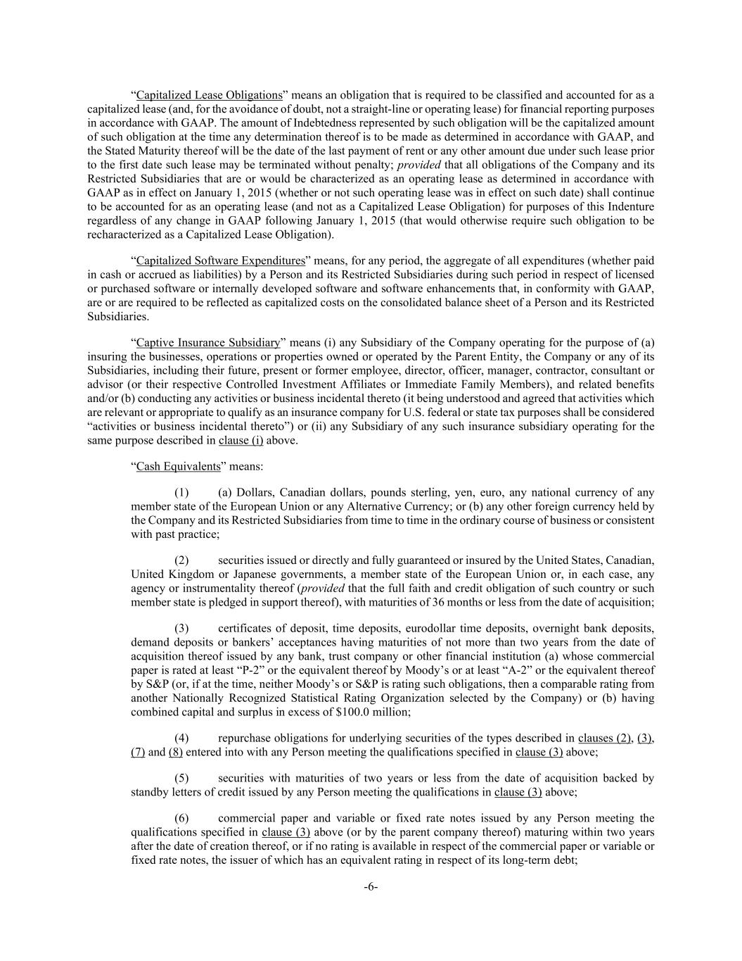 -6- “Capitalized Lease Obligations” means an obligation that is required to be classified and accounted for as a capitalized lease (and, for the avoidance of doubt, not a straight-line or operating lease) for financial reporting purposes in accordance with GAAP. The amount of Indebtedness represented by such obligation will be the capitalized amount of such obligation at the time any determination thereof is to be made as determined in accordance with GAAP, and the Stated Maturity thereof will be the date of the last payment of rent or any other amount due under such lease prior to the first date such lease may be terminated without penalty; provided that all obligations of the Company and its Restricted Subsidiaries that are or would be characterized as an operating lease as determined in accordance with GAAP as in effect on January 1, 2015 (whether or not such operating lease was in effect on such date) shall continue to be accounted for as an operating lease (and not as a Capitalized Lease Obligation) for purposes of this Indenture regardless of any change in GAAP following January 1, 2015 (that would otherwise require such obligation to be recharacterized as a Capitalized Lease Obligation). “Capitalized Software Expenditures” means, for any period, the aggregate of all expenditures (whether paid in cash or accrued as liabilities) by a Person and its Restricted Subsidiaries during such period in respect of licensed or purchased software or internally developed software and software enhancements that, in conformity with GAAP, are or are required to be reflected as capitalized costs on the consolidated balance sheet of a Person and its Restricted Subsidiaries. “Captive Insurance Subsidiary” means (i) any Subsidiary of the Company operating for the purpose of (a) insuring the businesses, operations or properties owned or operated by the Parent Entity, the Company or any of its Subsidiaries, including their future, present or former employee, director, officer, manager, contractor, consultant or advisor (or their respective Controlled Investment Affiliates or Immediate Family Members), and related benefits and/or (b) conducting any activities or business incidental thereto (it being understood and agreed that activities which are relevant or appropriate to qualify as an insurance company for U.S. federal or state tax purposes shall be considered “activities or business incidental thereto”) or (ii) any Subsidiary of any such insurance subsidiary operating for the same purpose described in clause (i) above. “Cash Equivalents” means: (1) (a) Dollars, Canadian dollars, pounds sterling, yen, euro, any national currency of any member state of the European Union or any Alternative Currency; or (b) any other foreign currency held by the Company and its Restricted Subsidiaries from time to time in the ordinary course of business or consistent with past practice; (2) securities issued or directly and fully guaranteed or insured by the United States, Canadian, United Kingdom or Japanese governments, a member state of the European Union or, in each case, any agency or instrumentality thereof (provided that the full faith and credit obligation of such country or such member state is pledged in support thereof), with maturities of 36 months or less from the date of acquisition; (3) certificates of deposit, time deposits, eurodollar time deposits, overnight bank deposits, demand deposits or bankers’ acceptances having maturities of not more than two years from the date of acquisition thereof issued by any bank, trust company or other financial institution (a) whose commercial paper is rated at least “P-2” or the equivalent thereof by Moody’s or at least “A-2” or the equivalent thereof by S&P (or, if at the time, neither Moody’s or S&P is rating such obligations, then a comparable rating from another Nationally Recognized Statistical Rating Organization selected by the Company) or (b) having combined capital and surplus in excess of $100.0 million; (4) repurchase obligations for underlying securities of the types described in clauses (2), (3), (7) and (8) entered into with any Person meeting the qualifications specified in clause (3) above; (5) securities with maturities of two years or less from the date of acquisition backed by standby letters of credit issued by any Person meeting the qualifications in clause (3) above; (6) commercial paper and variable or fixed rate notes issued by any Person meeting the qualifications specified in clause (3) above (or by the parent company thereof) maturing within two years after the date of creation thereof, or if no rating is available in respect of the commercial paper or variable or fixed rate notes, the issuer of which has an equivalent rating in respect of its long-term debt;