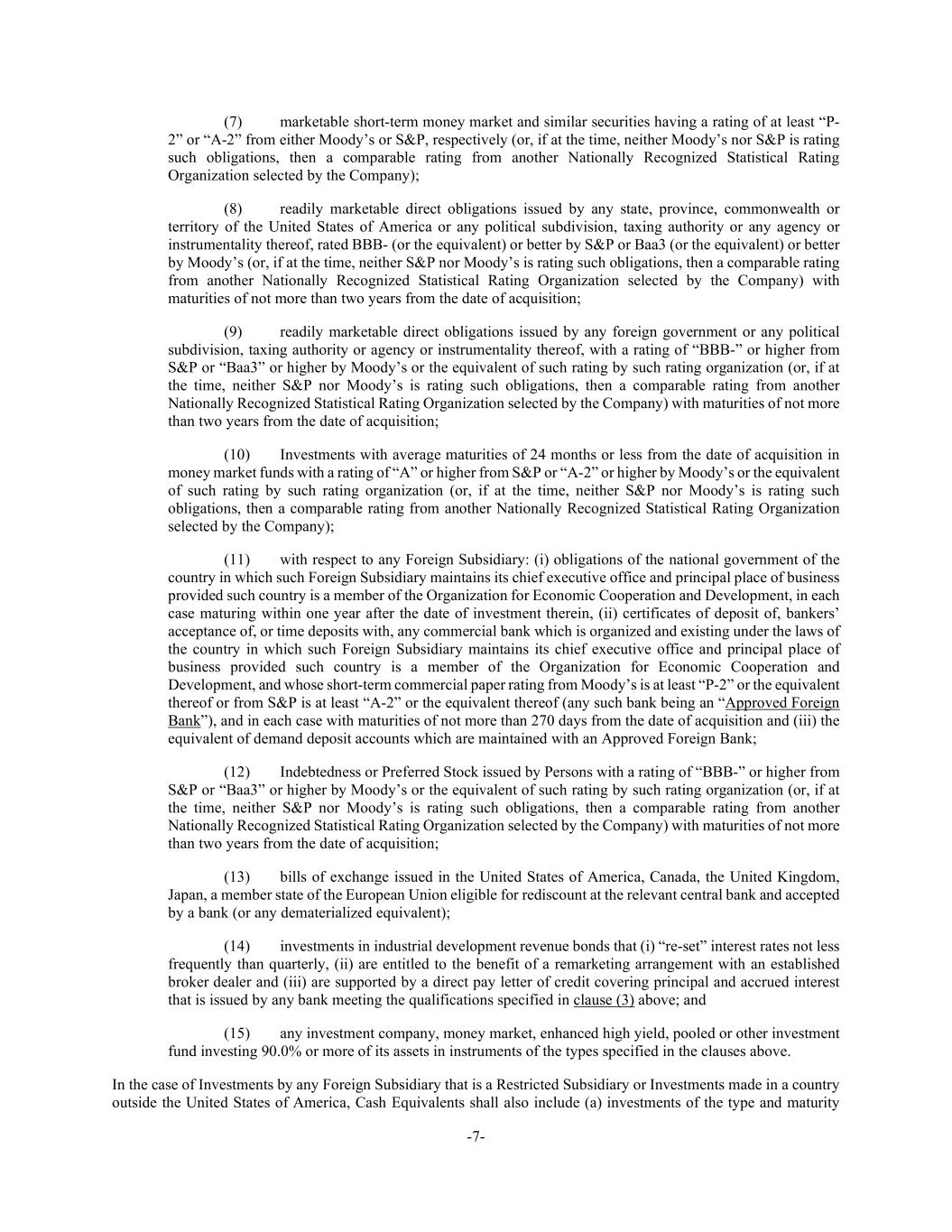 -7- (7) marketable short-term money market and similar securities having a rating of at least “P- 2” or “A-2” from either Moody’s or S&P, respectively (or, if at the time, neither Moody’s nor S&P is rating such obligations, then a comparable rating from another Nationally Recognized Statistical Rating Organization selected by the Company); (8) readily marketable direct obligations issued by any state, province, commonwealth or territory of the United States of America or any political subdivision, taxing authority or any agency or instrumentality thereof, rated BBB- (or the equivalent) or better by S&P or Baa3 (or the equivalent) or better by Moody’s (or, if at the time, neither S&P nor Moody’s is rating such obligations, then a comparable rating from another Nationally Recognized Statistical Rating Organization selected by the Company) with maturities of not more than two years from the date of acquisition; (9) readily marketable direct obligations issued by any foreign government or any political subdivision, taxing authority or agency or instrumentality thereof, with a rating of “BBB-” or higher from S&P or “Baa3” or higher by Moody’s or the equivalent of such rating by such rating organization (or, if at the time, neither S&P nor Moody’s is rating such obligations, then a comparable rating from another Nationally Recognized Statistical Rating Organization selected by the Company) with maturities of not more than two years from the date of acquisition; (10) Investments with average maturities of 24 months or less from the date of acquisition in money market funds with a rating of “A” or higher from S&P or “A-2” or higher by Moody’s or the equivalent of such rating by such rating organization (or, if at the time, neither S&P nor Moody’s is rating such obligations, then a comparable rating from another Nationally Recognized Statistical Rating Organization selected by the Company); (11) with respect to any Foreign Subsidiary: (i) obligations of the national government of the country in which such Foreign Subsidiary maintains its chief executive office and principal place of business provided such country is a member of the Organization for Economic Cooperation and Development, in each case maturing within one year after the date of investment therein, (ii) certificates of deposit of, bankers’ acceptance of, or time deposits with, any commercial bank which is organized and existing under the laws of the country in which such Foreign Subsidiary maintains its chief executive office and principal place of business provided such country is a member of the Organization for Economic Cooperation and Development, and whose short-term commercial paper rating from Moody’s is at least “P-2” or the equivalent thereof or from S&P is at least “A-2” or the equivalent thereof (any such bank being an “Approved Foreign Bank”), and in each case with maturities of not more than 270 days from the date of acquisition and (iii) the equivalent of demand deposit accounts which are maintained with an Approved Foreign Bank; (12) Indebtedness or Preferred Stock issued by Persons with a rating of “BBB-” or higher from S&P or “Baa3” or higher by Moody’s or the equivalent of such rating by such rating organization (or, if at the time, neither S&P nor Moody’s is rating such obligations, then a comparable rating from another Nationally Recognized Statistical Rating Organization selected by the Company) with maturities of not more than two years from the date of acquisition; (13) bills of exchange issued in the United States of America, Canada, the United Kingdom, Japan, a member state of the European Union eligible for rediscount at the relevant central bank and accepted by a bank (or any dematerialized equivalent); (14) investments in industrial development revenue bonds that (i) “re-set” interest rates not less frequently than quarterly, (ii) are entitled to the benefit of a remarketing arrangement with an established broker dealer and (iii) are supported by a direct pay letter of credit covering principal and accrued interest that is issued by any bank meeting the qualifications specified in clause (3) above; and (15) any investment company, money market, enhanced high yield, pooled or other investment fund investing 90.0% or more of its assets in instruments of the types specified in the clauses above. In the case of Investments by any Foreign Subsidiary that is a Restricted Subsidiary or Investments made in a country outside the United States of America, Cash Equivalents shall also include (a) investments of the type and maturity