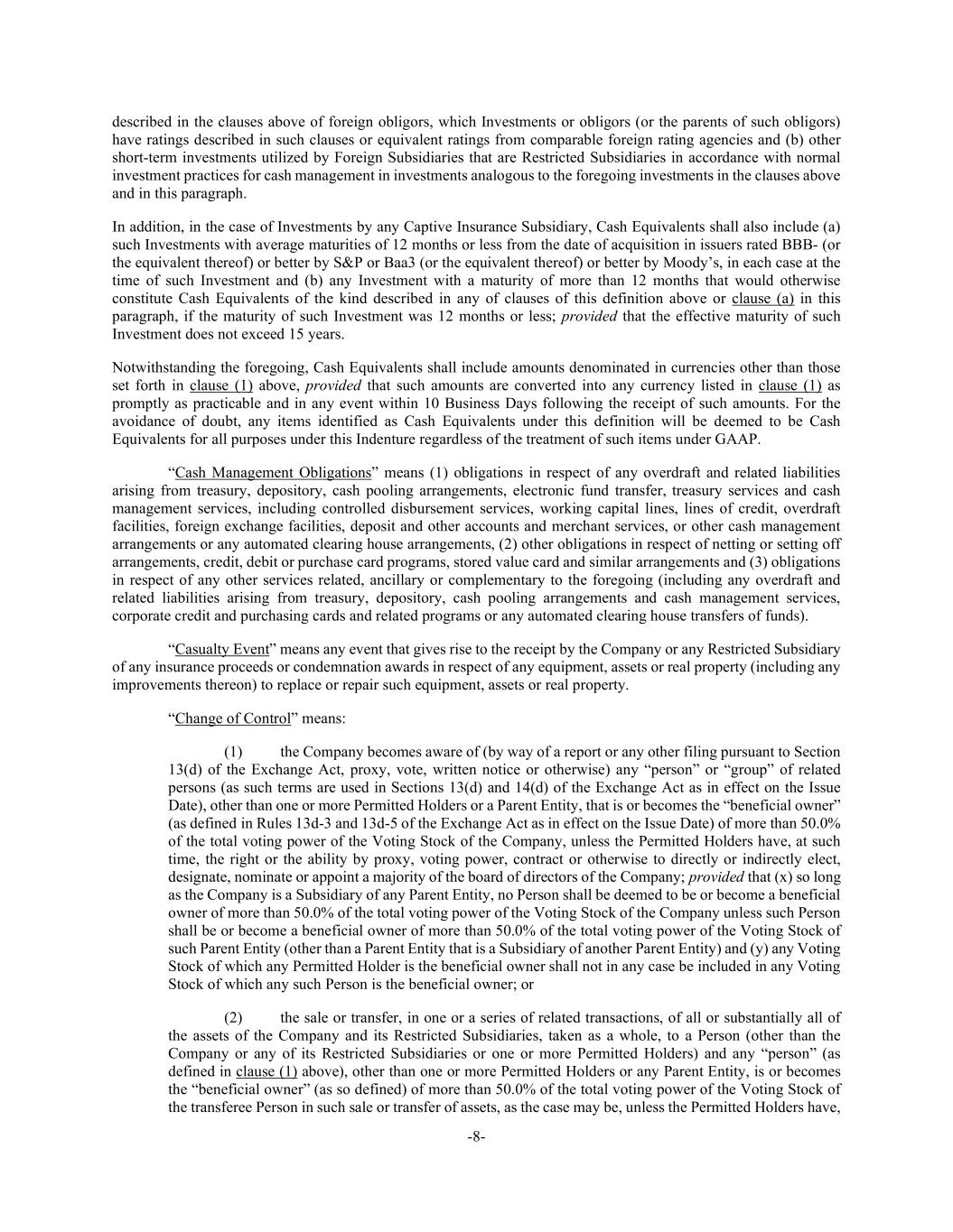 -8- described in the clauses above of foreign obligors, which Investments or obligors (or the parents of such obligors) have ratings described in such clauses or equivalent ratings from comparable foreign rating agencies and (b) other short-term investments utilized by Foreign Subsidiaries that are Restricted Subsidiaries in accordance with normal investment practices for cash management in investments analogous to the foregoing investments in the clauses above and in this paragraph. In addition, in the case of Investments by any Captive Insurance Subsidiary, Cash Equivalents shall also include (a) such Investments with average maturities of 12 months or less from the date of acquisition in issuers rated BBB- (or the equivalent thereof) or better by S&P or Baa3 (or the equivalent thereof) or better by Moody’s, in each case at the time of such Investment and (b) any Investment with a maturity of more than 12 months that would otherwise constitute Cash Equivalents of the kind described in any of clauses of this definition above or clause (a) in this paragraph, if the maturity of such Investment was 12 months or less; provided that the effective maturity of such Investment does not exceed 15 years. Notwithstanding the foregoing, Cash Equivalents shall include amounts denominated in currencies other than those set forth in clause (1) above, provided that such amounts are converted into any currency listed in clause (1) as promptly as practicable and in any event within 10 Business Days following the receipt of such amounts. For the avoidance of doubt, any items identified as Cash Equivalents under this definition will be deemed to be Cash Equivalents for all purposes under this Indenture regardless of the treatment of such items under GAAP. “Cash Management Obligations” means (1) obligations in respect of any overdraft and related liabilities arising from treasury, depository, cash pooling arrangements, electronic fund transfer, treasury services and cash management services, including controlled disbursement services, working capital lines, lines of credit, overdraft facilities, foreign exchange facilities, deposit and other accounts and merchant services, or other cash management arrangements or any automated clearing house arrangements, (2) other obligations in respect of netting or setting off arrangements, credit, debit or purchase card programs, stored value card and similar arrangements and (3) obligations in respect of any other services related, ancillary or complementary to the foregoing (including any overdraft and related liabilities arising from treasury, depository, cash pooling arrangements and cash management services, corporate credit and purchasing cards and related programs or any automated clearing house transfers of funds). “Casualty Event” means any event that gives rise to the receipt by the Company or any Restricted Subsidiary of any insurance proceeds or condemnation awards in respect of any equipment, assets or real property (including any improvements thereon) to replace or repair such equipment, assets or real property. “Change of Control” means: (1) the Company becomes aware of (by way of a report or any other filing pursuant to Section 13(d) of the Exchange Act, proxy, vote, written notice or otherwise) any “person” or “group” of related persons (as such terms are used in Sections 13(d) and 14(d) of the Exchange Act as in effect on the Issue Date), other than one or more Permitted Holders or a Parent Entity, that is or becomes the “beneficial owner” (as defined in Rules 13d-3 and 13d-5 of the Exchange Act as in effect on the Issue Date) of more than 50.0% of the total voting power of the Voting Stock of the Company, unless the Permitted Holders have, at such time, the right or the ability by proxy, voting power, contract or otherwise to directly or indirectly elect, designate, nominate or appoint a majority of the board of directors of the Company; provided that (x) so long as the Company is a Subsidiary of any Parent Entity, no Person shall be deemed to be or become a beneficial owner of more than 50.0% of the total voting power of the Voting Stock of the Company unless such Person shall be or become a beneficial owner of more than 50.0% of the total voting power of the Voting Stock of such Parent Entity (other than a Parent Entity that is a Subsidiary of another Parent Entity) and (y) any Voting Stock of which any Permitted Holder is the beneficial owner shall not in any case be included in any Voting Stock of which any such Person is the beneficial owner; or (2) the sale or transfer, in one or a series of related transactions, of all or substantially all of the assets of the Company and its Restricted Subsidiaries, taken as a whole, to a Person (other than the Company or any of its Restricted Subsidiaries or one or more Permitted Holders) and any “person” (as defined in clause (1) above), other than one or more Permitted Holders or any Parent Entity, is or becomes the “beneficial owner” (as so defined) of more than 50.0% of the total voting power of the Voting Stock of the transferee Person in such sale or transfer of assets, as the case may be, unless the Permitted Holders have,