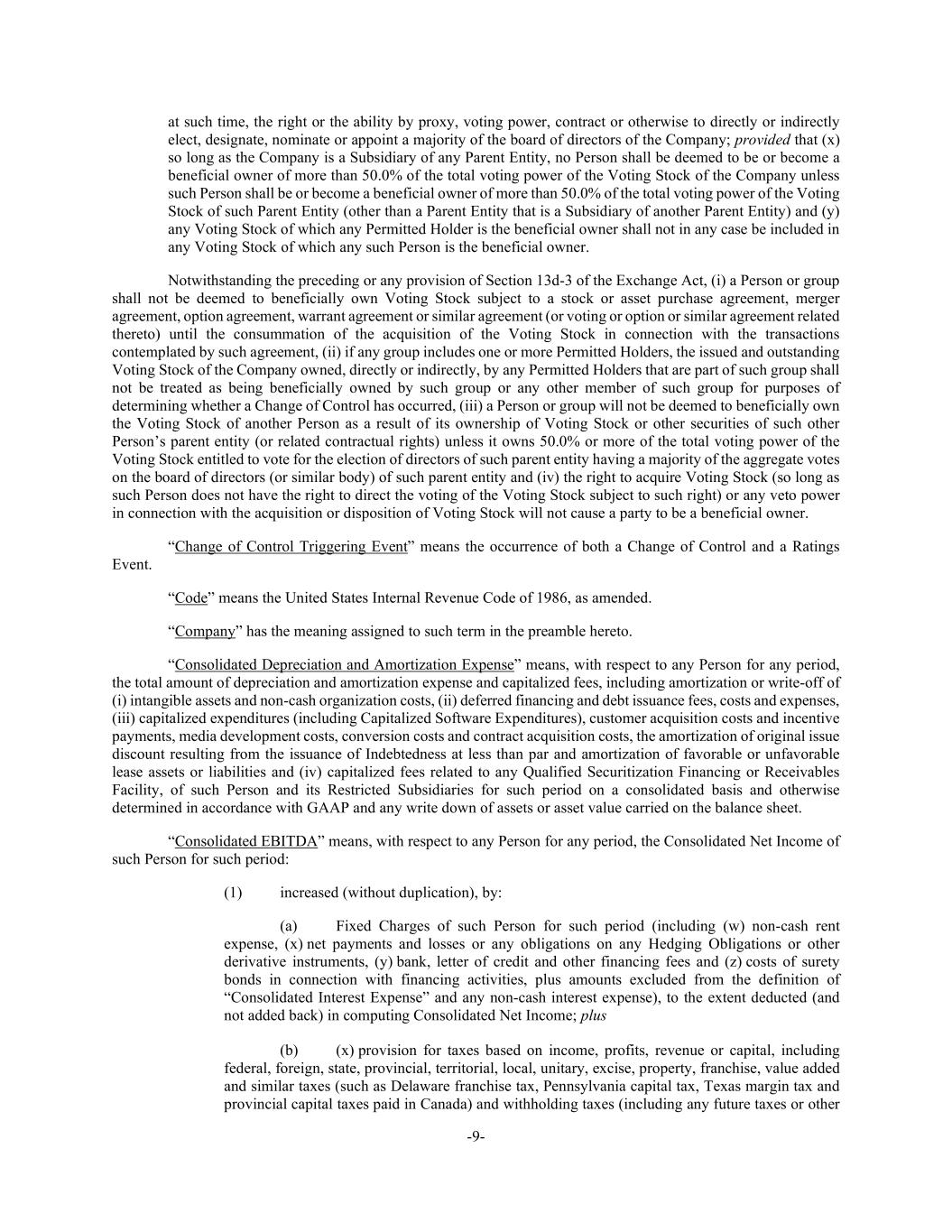 -9- at such time, the right or the ability by proxy, voting power, contract or otherwise to directly or indirectly elect, designate, nominate or appoint a majority of the board of directors of the Company; provided that (x) so long as the Company is a Subsidiary of any Parent Entity, no Person shall be deemed to be or become a beneficial owner of more than 50.0% of the total voting power of the Voting Stock of the Company unless such Person shall be or become a beneficial owner of more than 50.0% of the total voting power of the Voting Stock of such Parent Entity (other than a Parent Entity that is a Subsidiary of another Parent Entity) and (y) any Voting Stock of which any Permitted Holder is the beneficial owner shall not in any case be included in any Voting Stock of which any such Person is the beneficial owner. Notwithstanding the preceding or any provision of Section 13d-3 of the Exchange Act, (i) a Person or group shall not be deemed to beneficially own Voting Stock subject to a stock or asset purchase agreement, merger agreement, option agreement, warrant agreement or similar agreement (or voting or option or similar agreement related thereto) until the consummation of the acquisition of the Voting Stock in connection with the transactions contemplated by such agreement, (ii) if any group includes one or more Permitted Holders, the issued and outstanding Voting Stock of the Company owned, directly or indirectly, by any Permitted Holders that are part of such group shall not be treated as being beneficially owned by such group or any other member of such group for purposes of determining whether a Change of Control has occurred, (iii) a Person or group will not be deemed to beneficially own the Voting Stock of another Person as a result of its ownership of Voting Stock or other securities of such other Person’s parent entity (or related contractual rights) unless it owns 50.0% or more of the total voting power of the Voting Stock entitled to vote for the election of directors of such parent entity having a majority of the aggregate votes on the board of directors (or similar body) of such parent entity and (iv) the right to acquire Voting Stock (so long as such Person does not have the right to direct the voting of the Voting Stock subject to such right) or any veto power in connection with the acquisition or disposition of Voting Stock will not cause a party to be a beneficial owner. “Change of Control Triggering Event” means the occurrence of both a Change of Control and a Ratings Event. “Code” means the United States Internal Revenue Code of 1986, as amended. “Company” has the meaning assigned to such term in the preamble hereto. “Consolidated Depreciation and Amortization Expense” means, with respect to any Person for any period, the total amount of depreciation and amortization expense and capitalized fees, including amortization or write-off of (i) intangible assets and non-cash organization costs, (ii) deferred financing and debt issuance fees, costs and expenses, (iii) capitalized expenditures (including Capitalized Software Expenditures), customer acquisition costs and incentive payments, media development costs, conversion costs and contract acquisition costs, the amortization of original issue discount resulting from the issuance of Indebtedness at less than par and amortization of favorable or unfavorable lease assets or liabilities and (iv) capitalized fees related to any Qualified Securitization Financing or Receivables Facility, of such Person and its Restricted Subsidiaries for such period on a consolidated basis and otherwise determined in accordance with GAAP and any write down of assets or asset value carried on the balance sheet. “Consolidated EBITDA” means, with respect to any Person for any period, the Consolidated Net Income of such Person for such period: (1) increased (without duplication), by: (a) Fixed Charges of such Person for such period (including (w) non-cash rent expense, (x) net payments and losses or any obligations on any Hedging Obligations or other derivative instruments, (y) bank, letter of credit and other financing fees and (z) costs of surety bonds in connection with financing activities, plus amounts excluded from the definition of “Consolidated Interest Expense” and any non-cash interest expense), to the extent deducted (and not added back) in computing Consolidated Net Income; plus (b) (x) provision for taxes based on income, profits, revenue or capital, including federal, foreign, state, provincial, territorial, local, unitary, excise, property, franchise, value added and similar taxes (such as Delaware franchise tax, Pennsylvania capital tax, Texas margin tax and provincial capital taxes paid in Canada) and withholding taxes (including any future taxes or other