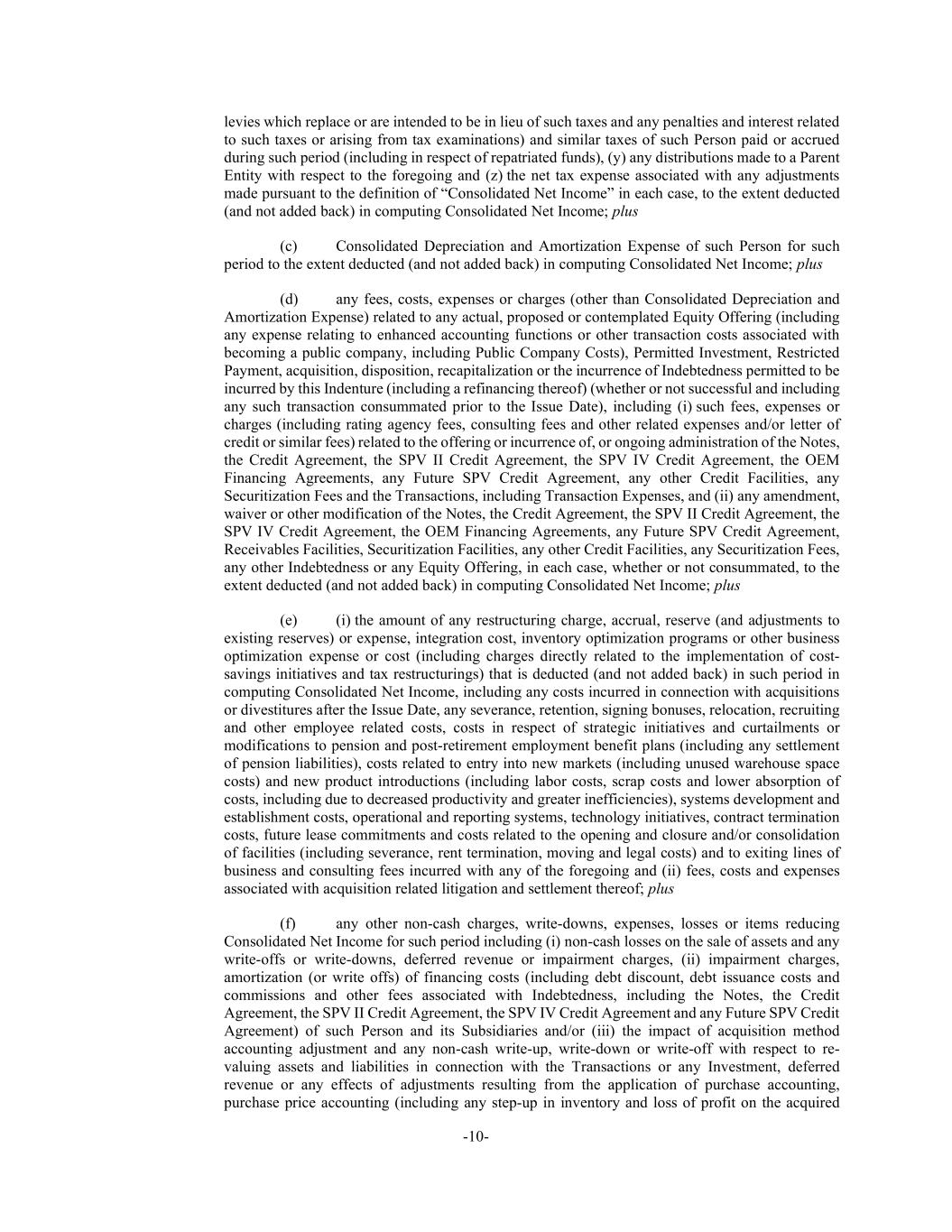 -10- levies which replace or are intended to be in lieu of such taxes and any penalties and interest related to such taxes or arising from tax examinations) and similar taxes of such Person paid or accrued during such period (including in respect of repatriated funds), (y) any distributions made to a Parent Entity with respect to the foregoing and (z) the net tax expense associated with any adjustments made pursuant to the definition of “Consolidated Net Income” in each case, to the extent deducted (and not added back) in computing Consolidated Net Income; plus (c) Consolidated Depreciation and Amortization Expense of such Person for such period to the extent deducted (and not added back) in computing Consolidated Net Income; plus (d) any fees, costs, expenses or charges (other than Consolidated Depreciation and Amortization Expense) related to any actual, proposed or contemplated Equity Offering (including any expense relating to enhanced accounting functions or other transaction costs associated with becoming a public company, including Public Company Costs), Permitted Investment, Restricted Payment, acquisition, disposition, recapitalization or the incurrence of Indebtedness permitted to be incurred by this Indenture (including a refinancing thereof) (whether or not successful and including any such transaction consummated prior to the Issue Date), including (i) such fees, expenses or charges (including rating agency fees, consulting fees and other related expenses and/or letter of credit or similar fees) related to the offering or incurrence of, or ongoing administration of the Notes, the Credit Agreement, the SPV II Credit Agreement, the SPV IV Credit Agreement, the OEM Financing Agreements, any Future SPV Credit Agreement, any other Credit Facilities, any Securitization Fees and the Transactions, including Transaction Expenses, and (ii) any amendment, waiver or other modification of the Notes, the Credit Agreement, the SPV II Credit Agreement, the SPV IV Credit Agreement, the OEM Financing Agreements, any Future SPV Credit Agreement, Receivables Facilities, Securitization Facilities, any other Credit Facilities, any Securitization Fees, any other Indebtedness or any Equity Offering, in each case, whether or not consummated, to the extent deducted (and not added back) in computing Consolidated Net Income; plus (e) (i) the amount of any restructuring charge, accrual, reserve (and adjustments to existing reserves) or expense, integration cost, inventory optimization programs or other business optimization expense or cost (including charges directly related to the implementation of cost- savings initiatives and tax restructurings) that is deducted (and not added back) in such period in computing Consolidated Net Income, including any costs incurred in connection with acquisitions or divestitures after the Issue Date, any severance, retention, signing bonuses, relocation, recruiting and other employee related costs, costs in respect of strategic initiatives and curtailments or modifications to pension and post-retirement employment benefit plans (including any settlement of pension liabilities), costs related to entry into new markets (including unused warehouse space costs) and new product introductions (including labor costs, scrap costs and lower absorption of costs, including due to decreased productivity and greater inefficiencies), systems development and establishment costs, operational and reporting systems, technology initiatives, contract termination costs, future lease commitments and costs related to the opening and closure and/or consolidation of facilities (including severance, rent termination, moving and legal costs) and to exiting lines of business and consulting fees incurred with any of the foregoing and (ii) fees, costs and expenses associated with acquisition related litigation and settlement thereof; plus (f) any other non-cash charges, write-downs, expenses, losses or items reducing Consolidated Net Income for such period including (i) non-cash losses on the sale of assets and any write-offs or write-downs, deferred revenue or impairment charges, (ii) impairment charges, amortization (or write offs) of financing costs (including debt discount, debt issuance costs and commissions and other fees associated with Indebtedness, including the Notes, the Credit Agreement, the SPV II Credit Agreement, the SPV IV Credit Agreement and any Future SPV Credit Agreement) of such Person and its Subsidiaries and/or (iii) the impact of acquisition method accounting adjustment and any non-cash write-up, write-down or write-off with respect to re- valuing assets and liabilities in connection with the Transactions or any Investment, deferred revenue or any effects of adjustments resulting from the application of purchase accounting, purchase price accounting (including any step-up in inventory and loss of profit on the acquired