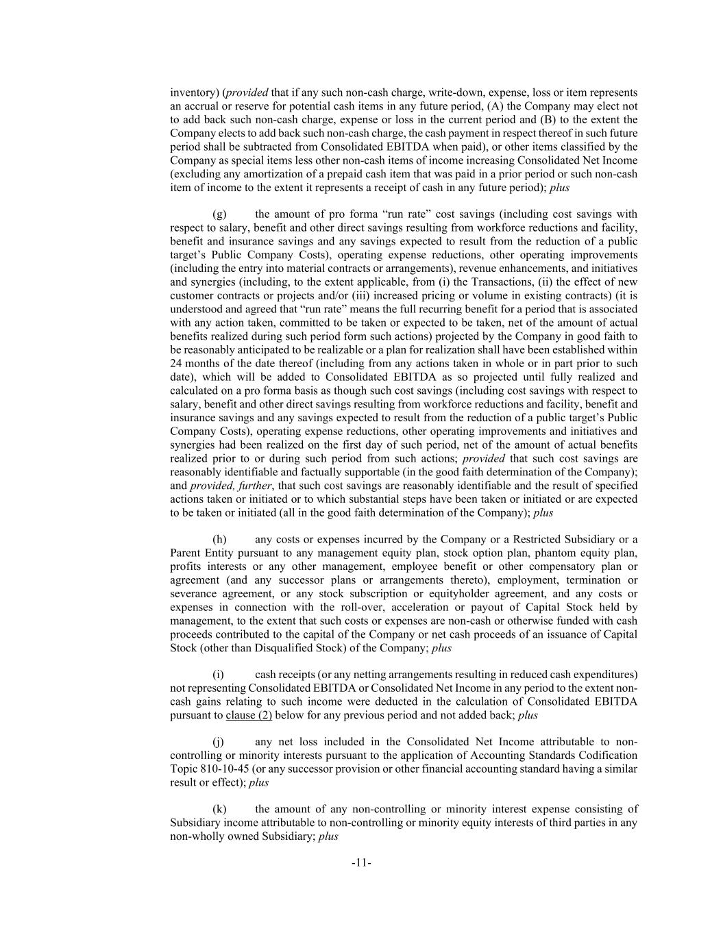 -11- inventory) (provided that if any such non-cash charge, write-down, expense, loss or item represents an accrual or reserve for potential cash items in any future period, (A) the Company may elect not to add back such non-cash charge, expense or loss in the current period and (B) to the extent the Company elects to add back such non-cash charge, the cash payment in respect thereof in such future period shall be subtracted from Consolidated EBITDA when paid), or other items classified by the Company as special items less other non-cash items of income increasing Consolidated Net Income (excluding any amortization of a prepaid cash item that was paid in a prior period or such non-cash item of income to the extent it represents a receipt of cash in any future period); plus (g) the amount of pro forma “run rate” cost savings (including cost savings with respect to salary, benefit and other direct savings resulting from workforce reductions and facility, benefit and insurance savings and any savings expected to result from the reduction of a public target’s Public Company Costs), operating expense reductions, other operating improvements (including the entry into material contracts or arrangements), revenue enhancements, and initiatives and synergies (including, to the extent applicable, from (i) the Transactions, (ii) the effect of new customer contracts or projects and/or (iii) increased pricing or volume in existing contracts) (it is understood and agreed that “run rate” means the full recurring benefit for a period that is associated with any action taken, committed to be taken or expected to be taken, net of the amount of actual benefits realized during such period form such actions) projected by the Company in good faith to be reasonably anticipated to be realizable or a plan for realization shall have been established within 24 months of the date thereof (including from any actions taken in whole or in part prior to such date), which will be added to Consolidated EBITDA as so projected until fully realized and calculated on a pro forma basis as though such cost savings (including cost savings with respect to salary, benefit and other direct savings resulting from workforce reductions and facility, benefit and insurance savings and any savings expected to result from the reduction of a public target’s Public Company Costs), operating expense reductions, other operating improvements and initiatives and synergies had been realized on the first day of such period, net of the amount of actual benefits realized prior to or during such period from such actions; provided that such cost savings are reasonably identifiable and factually supportable (in the good faith determination of the Company); and provided, further, that such cost savings are reasonably identifiable and the result of specified actions taken or initiated or to which substantial steps have been taken or initiated or are expected to be taken or initiated (all in the good faith determination of the Company); plus (h) any costs or expenses incurred by the Company or a Restricted Subsidiary or a Parent Entity pursuant to any management equity plan, stock option plan, phantom equity plan, profits interests or any other management, employee benefit or other compensatory plan or agreement (and any successor plans or arrangements thereto), employment, termination or severance agreement, or any stock subscription or equityholder agreement, and any costs or expenses in connection with the roll-over, acceleration or payout of Capital Stock held by management, to the extent that such costs or expenses are non-cash or otherwise funded with cash proceeds contributed to the capital of the Company or net cash proceeds of an issuance of Capital Stock (other than Disqualified Stock) of the Company; plus (i) cash receipts (or any netting arrangements resulting in reduced cash expenditures) not representing Consolidated EBITDA or Consolidated Net Income in any period to the extent non- cash gains relating to such income were deducted in the calculation of Consolidated EBITDA pursuant to clause (2) below for any previous period and not added back; plus (j) any net loss included in the Consolidated Net Income attributable to non- controlling or minority interests pursuant to the application of Accounting Standards Codification Topic 810-10-45 (or any successor provision or other financial accounting standard having a similar result or effect); plus (k) the amount of any non-controlling or minority interest expense consisting of Subsidiary income attributable to non-controlling or minority equity interests of third parties in any non-wholly owned Subsidiary; plus