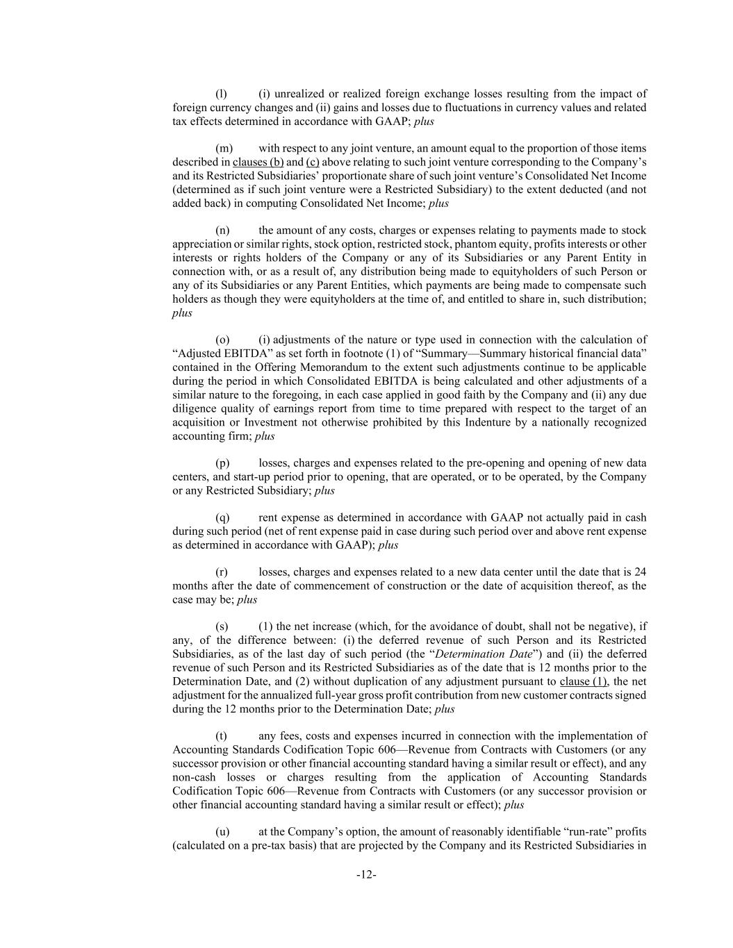 -12- (l) (i) unrealized or realized foreign exchange losses resulting from the impact of foreign currency changes and (ii) gains and losses due to fluctuations in currency values and related tax effects determined in accordance with GAAP; plus (m) with respect to any joint venture, an amount equal to the proportion of those items described in clauses (b) and (c) above relating to such joint venture corresponding to the Company’s and its Restricted Subsidiaries’ proportionate share of such joint venture’s Consolidated Net Income (determined as if such joint venture were a Restricted Subsidiary) to the extent deducted (and not added back) in computing Consolidated Net Income; plus (n) the amount of any costs, charges or expenses relating to payments made to stock appreciation or similar rights, stock option, restricted stock, phantom equity, profits interests or other interests or rights holders of the Company or any of its Subsidiaries or any Parent Entity in connection with, or as a result of, any distribution being made to equityholders of such Person or any of its Subsidiaries or any Parent Entities, which payments are being made to compensate such holders as though they were equityholders at the time of, and entitled to share in, such distribution; plus (o) (i) adjustments of the nature or type used in connection with the calculation of “Adjusted EBITDA” as set forth in footnote (1) of “Summary—Summary historical financial data” contained in the Offering Memorandum to the extent such adjustments continue to be applicable during the period in which Consolidated EBITDA is being calculated and other adjustments of a similar nature to the foregoing, in each case applied in good faith by the Company and (ii) any due diligence quality of earnings report from time to time prepared with respect to the target of an acquisition or Investment not otherwise prohibited by this Indenture by a nationally recognized accounting firm; plus (p) losses, charges and expenses related to the pre-opening and opening of new data centers, and start-up period prior to opening, that are operated, or to be operated, by the Company or any Restricted Subsidiary; plus (q) rent expense as determined in accordance with GAAP not actually paid in cash during such period (net of rent expense paid in case during such period over and above rent expense as determined in accordance with GAAP); plus (r) losses, charges and expenses related to a new data center until the date that is 24 months after the date of commencement of construction or the date of acquisition thereof, as the case may be; plus (s) (1) the net increase (which, for the avoidance of doubt, shall not be negative), if any, of the difference between: (i) the deferred revenue of such Person and its Restricted Subsidiaries, as of the last day of such period (the “Determination Date”) and (ii) the deferred revenue of such Person and its Restricted Subsidiaries as of the date that is 12 months prior to the Determination Date, and (2) without duplication of any adjustment pursuant to clause (1), the net adjustment for the annualized full-year gross profit contribution from new customer contracts signed during the 12 months prior to the Determination Date; plus (t) any fees, costs and expenses incurred in connection with the implementation of Accounting Standards Codification Topic 606—Revenue from Contracts with Customers (or any successor provision or other financial accounting standard having a similar result or effect), and any non-cash losses or charges resulting from the application of Accounting Standards Codification Topic 606—Revenue from Contracts with Customers (or any successor provision or other financial accounting standard having a similar result or effect); plus (u) at the Company’s option, the amount of reasonably identifiable “run-rate” profits (calculated on a pre-tax basis) that are projected by the Company and its Restricted Subsidiaries in