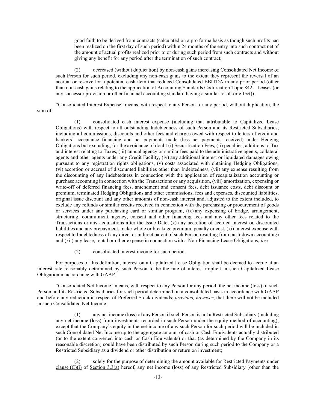 -13- good faith to be derived from contracts (calculated on a pro forma basis as though such profits had been realized on the first day of such period) within 24 months of the entry into such contract net of the amount of actual profits realized prior to or during such period from such contracts and without giving any benefit for any period after the termination of such contract; (2) decreased (without duplication) by non-cash gains increasing Consolidated Net Income of such Person for such period, excluding any non-cash gains to the extent they represent the reversal of an accrual or reserve for a potential cash item that reduced Consolidated EBITDA in any prior period (other than non-cash gains relating to the application of Accounting Standards Codification Topic 842—Leases (or any successor provision or other financial accounting standard having a similar result or effect)). “Consolidated Interest Expense” means, with respect to any Person for any period, without duplication, the sum of: (1) consolidated cash interest expense (including that attributable to Capitalized Lease Obligations) with respect to all outstanding Indebtedness of such Person and its Restricted Subsidiaries, including all commissions, discounts and other fees and charges owed with respect to letters of credit and bankers’ acceptance financing and net payments made (less net payments received) under Hedging Obligations but excluding, for the avoidance of doubt (i) Securitization Fees, (ii) penalties, additions to Tax and interest relating to Taxes, (iii) annual agency or similar fees paid to the administrative agents, collateral agents and other agents under any Credit Facility, (iv) any additional interest or liquidated damages owing pursuant to any registration rights obligations, (v) costs associated with obtaining Hedging Obligations, (vi) accretion or accrual of discounted liabilities other than Indebtedness, (vii) any expense resulting from the discounting of any Indebtedness in connection with the application of recapitalization accounting or purchase accounting in connection with the Transactions or any acquisition, (viii) amortization, expensing or write-off of deferred financing fees, amendment and consent fees, debt issuance costs, debt discount or premium, terminated Hedging Obligations and other commissions, fees and expenses, discounted liabilities, original issue discount and any other amounts of non-cash interest and, adjusted to the extent included, to exclude any refunds or similar credits received in connection with the purchasing or procurement of goods or services under any purchasing card or similar program, (ix) any expensing of bridge, arrangement, structuring, commitment, agency, consent and other financing fees and any other fees related to the Transactions or any acquisitions after the Issue Date, (x) any accretion of accrued interest on discounted liabilities and any prepayment, make-whole or breakage premium, penalty or cost, (xi) interest expense with respect to Indebtedness of any direct or indirect parent of such Person resulting from push-down accounting) and (xii) any lease, rental or other expense in connection with a Non-Financing Lease Obligations; less (2) consolidated interest income for such period. For purposes of this definition, interest on a Capitalized Lease Obligation shall be deemed to accrue at an interest rate reasonably determined by such Person to be the rate of interest implicit in such Capitalized Lease Obligation in accordance with GAAP. “Consolidated Net Income” means, with respect to any Person for any period, the net income (loss) of such Person and its Restricted Subsidiaries for such period determined on a consolidated basis in accordance with GAAP and before any reduction in respect of Preferred Stock dividends; provided, however, that there will not be included in such Consolidated Net Income: (1) any net income (loss) of any Person if such Person is not a Restricted Subsidiary (including any net income (loss) from investments recorded in such Person under the equity method of accounting), except that the Company’s equity in the net income of any such Person for such period will be included in such Consolidated Net Income up to the aggregate amount of cash or Cash Equivalents actually distributed (or to the extent converted into cash or Cash Equivalents) or that (as determined by the Company in its reasonable discretion) could have been distributed by such Person during such period to the Company or a Restricted Subsidiary as a dividend or other distribution or return on investment; (2) solely for the purpose of determining the amount available for Restricted Payments under clause (C)(i) of Section 3.3(a) hereof, any net income (loss) of any Restricted Subsidiary (other than the