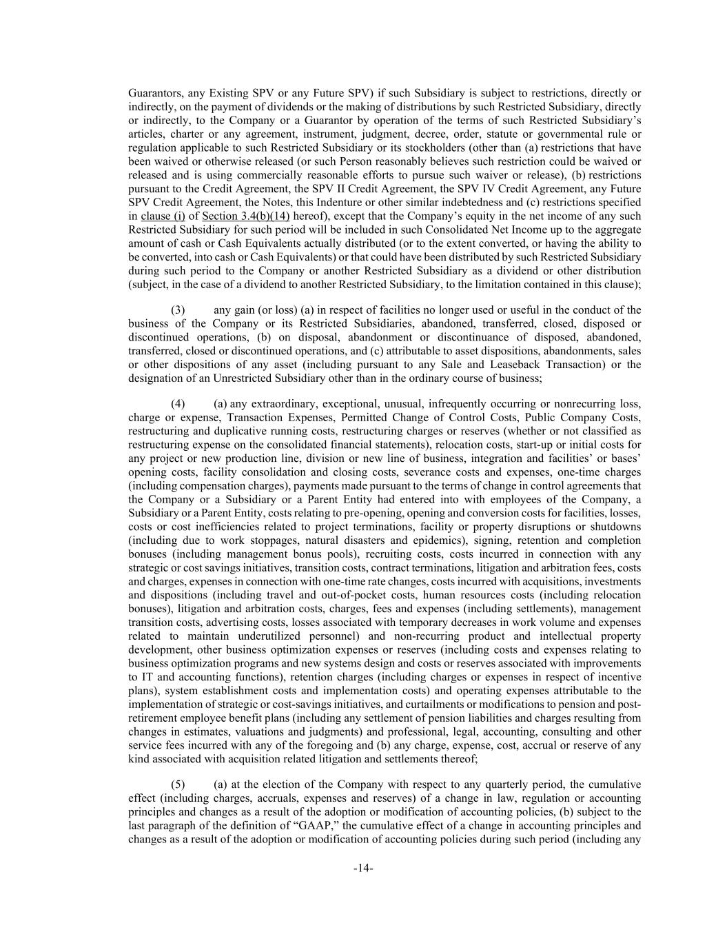 -14- Guarantors, any Existing SPV or any Future SPV) if such Subsidiary is subject to restrictions, directly or indirectly, on the payment of dividends or the making of distributions by such Restricted Subsidiary, directly or indirectly, to the Company or a Guarantor by operation of the terms of such Restricted Subsidiary’s articles, charter or any agreement, instrument, judgment, decree, order, statute or governmental rule or regulation applicable to such Restricted Subsidiary or its stockholders (other than (a) restrictions that have been waived or otherwise released (or such Person reasonably believes such restriction could be waived or released and is using commercially reasonable efforts to pursue such waiver or release), (b) restrictions pursuant to the Credit Agreement, the SPV II Credit Agreement, the SPV IV Credit Agreement, any Future SPV Credit Agreement, the Notes, this Indenture or other similar indebtedness and (c) restrictions specified in clause (i) of Section 3.4(b)(14) hereof), except that the Company’s equity in the net income of any such Restricted Subsidiary for such period will be included in such Consolidated Net Income up to the aggregate amount of cash or Cash Equivalents actually distributed (or to the extent converted, or having the ability to be converted, into cash or Cash Equivalents) or that could have been distributed by such Restricted Subsidiary during such period to the Company or another Restricted Subsidiary as a dividend or other distribution (subject, in the case of a dividend to another Restricted Subsidiary, to the limitation contained in this clause); (3) any gain (or loss) (a) in respect of facilities no longer used or useful in the conduct of the business of the Company or its Restricted Subsidiaries, abandoned, transferred, closed, disposed or discontinued operations, (b) on disposal, abandonment or discontinuance of disposed, abandoned, transferred, closed or discontinued operations, and (c) attributable to asset dispositions, abandonments, sales or other dispositions of any asset (including pursuant to any Sale and Leaseback Transaction) or the designation of an Unrestricted Subsidiary other than in the ordinary course of business; (4) (a) any extraordinary, exceptional, unusual, infrequently occurring or nonrecurring loss, charge or expense, Transaction Expenses, Permitted Change of Control Costs, Public Company Costs, restructuring and duplicative running costs, restructuring charges or reserves (whether or not classified as restructuring expense on the consolidated financial statements), relocation costs, start-up or initial costs for any project or new production line, division or new line of business, integration and facilities’ or bases’ opening costs, facility consolidation and closing costs, severance costs and expenses, one-time charges (including compensation charges), payments made pursuant to the terms of change in control agreements that the Company or a Subsidiary or a Parent Entity had entered into with employees of the Company, a Subsidiary or a Parent Entity, costs relating to pre-opening, opening and conversion costs for facilities, losses, costs or cost inefficiencies related to project terminations, facility or property disruptions or shutdowns (including due to work stoppages, natural disasters and epidemics), signing, retention and completion bonuses (including management bonus pools), recruiting costs, costs incurred in connection with any strategic or cost savings initiatives, transition costs, contract terminations, litigation and arbitration fees, costs and charges, expenses in connection with one-time rate changes, costs incurred with acquisitions, investments and dispositions (including travel and out-of-pocket costs, human resources costs (including relocation bonuses), litigation and arbitration costs, charges, fees and expenses (including settlements), management transition costs, advertising costs, losses associated with temporary decreases in work volume and expenses related to maintain underutilized personnel) and non-recurring product and intellectual property development, other business optimization expenses or reserves (including costs and expenses relating to business optimization programs and new systems design and costs or reserves associated with improvements to IT and accounting functions), retention charges (including charges or expenses in respect of incentive plans), system establishment costs and implementation costs) and operating expenses attributable to the implementation of strategic or cost-savings initiatives, and curtailments or modifications to pension and post- retirement employee benefit plans (including any settlement of pension liabilities and charges resulting from changes in estimates, valuations and judgments) and professional, legal, accounting, consulting and other service fees incurred with any of the foregoing and (b) any charge, expense, cost, accrual or reserve of any kind associated with acquisition related litigation and settlements thereof; (5) (a) at the election of the Company with respect to any quarterly period, the cumulative effect (including charges, accruals, expenses and reserves) of a change in law, regulation or accounting principles and changes as a result of the adoption or modification of accounting policies, (b) subject to the last paragraph of the definition of “GAAP,” the cumulative effect of a change in accounting principles and changes as a result of the adoption or modification of accounting policies during such period (including any