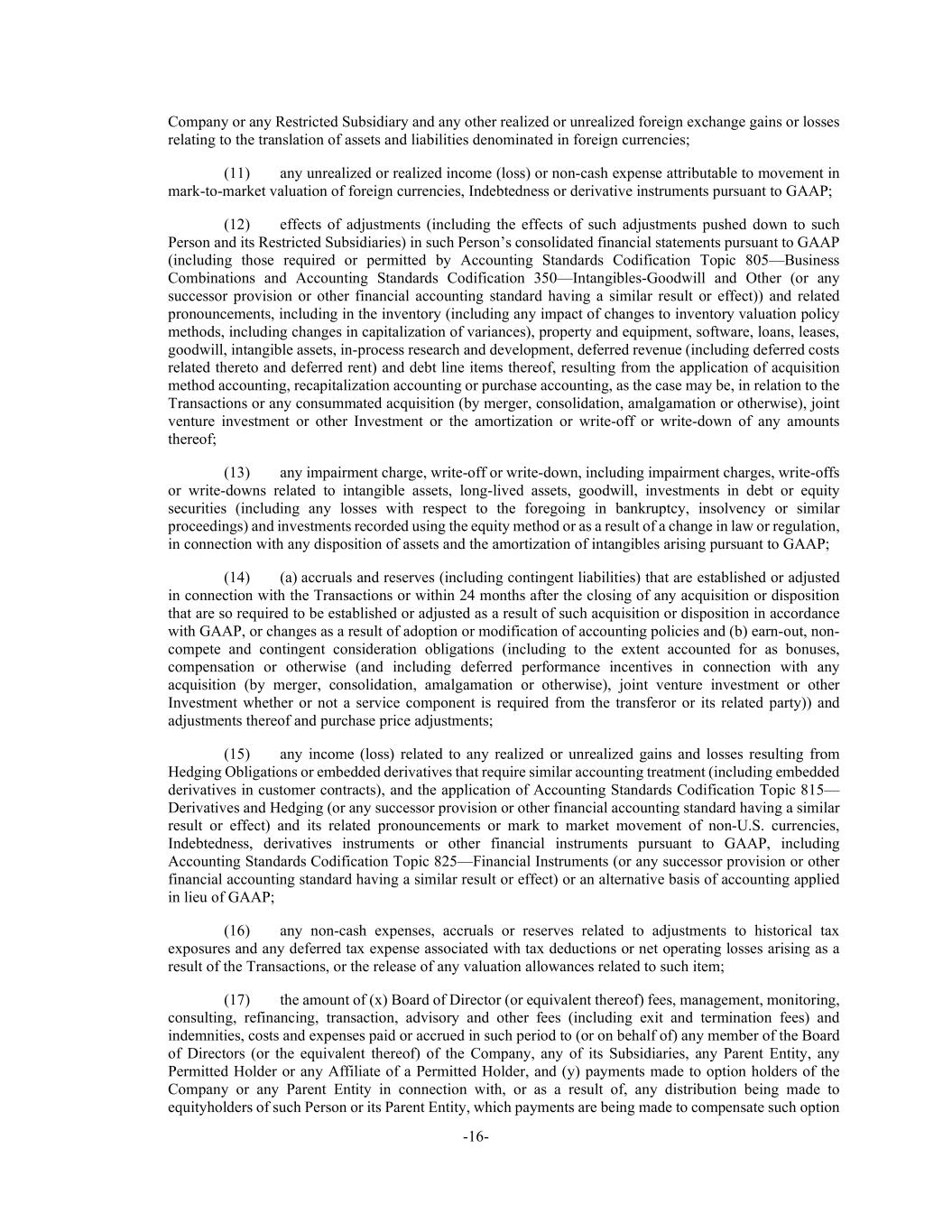 -16- Company or any Restricted Subsidiary and any other realized or unrealized foreign exchange gains or losses relating to the translation of assets and liabilities denominated in foreign currencies; (11) any unrealized or realized income (loss) or non-cash expense attributable to movement in mark-to-market valuation of foreign currencies, Indebtedness or derivative instruments pursuant to GAAP; (12) effects of adjustments (including the effects of such adjustments pushed down to such Person and its Restricted Subsidiaries) in such Person’s consolidated financial statements pursuant to GAAP (including those required or permitted by Accounting Standards Codification Topic 805—Business Combinations and Accounting Standards Codification 350—Intangibles-Goodwill and Other (or any successor provision or other financial accounting standard having a similar result or effect)) and related pronouncements, including in the inventory (including any impact of changes to inventory valuation policy methods, including changes in capitalization of variances), property and equipment, software, loans, leases, goodwill, intangible assets, in-process research and development, deferred revenue (including deferred costs related thereto and deferred rent) and debt line items thereof, resulting from the application of acquisition method accounting, recapitalization accounting or purchase accounting, as the case may be, in relation to the Transactions or any consummated acquisition (by merger, consolidation, amalgamation or otherwise), joint venture investment or other Investment or the amortization or write-off or write-down of any amounts thereof; (13) any impairment charge, write-off or write-down, including impairment charges, write-offs or write-downs related to intangible assets, long-lived assets, goodwill, investments in debt or equity securities (including any losses with respect to the foregoing in bankruptcy, insolvency or similar proceedings) and investments recorded using the equity method or as a result of a change in law or regulation, in connection with any disposition of assets and the amortization of intangibles arising pursuant to GAAP; (14) (a) accruals and reserves (including contingent liabilities) that are established or adjusted in connection with the Transactions or within 24 months after the closing of any acquisition or disposition that are so required to be established or adjusted as a result of such acquisition or disposition in accordance with GAAP, or changes as a result of adoption or modification of accounting policies and (b) earn-out, non- compete and contingent consideration obligations (including to the extent accounted for as bonuses, compensation or otherwise (and including deferred performance incentives in connection with any acquisition (by merger, consolidation, amalgamation or otherwise), joint venture investment or other Investment whether or not a service component is required from the transferor or its related party)) and adjustments thereof and purchase price adjustments; (15) any income (loss) related to any realized or unrealized gains and losses resulting from Hedging Obligations or embedded derivatives that require similar accounting treatment (including embedded derivatives in customer contracts), and the application of Accounting Standards Codification Topic 815— Derivatives and Hedging (or any successor provision or other financial accounting standard having a similar result or effect) and its related pronouncements or mark to market movement of non-U.S. currencies, Indebtedness, derivatives instruments or other financial instruments pursuant to GAAP, including Accounting Standards Codification Topic 825—Financial Instruments (or any successor provision or other financial accounting standard having a similar result or effect) or an alternative basis of accounting applied in lieu of GAAP; (16) any non-cash expenses, accruals or reserves related to adjustments to historical tax exposures and any deferred tax expense associated with tax deductions or net operating losses arising as a result of the Transactions, or the release of any valuation allowances related to such item; (17) the amount of (x) Board of Director (or equivalent thereof) fees, management, monitoring, consulting, refinancing, transaction, advisory and other fees (including exit and termination fees) and indemnities, costs and expenses paid or accrued in such period to (or on behalf of) any member of the Board of Directors (or the equivalent thereof) of the Company, any of its Subsidiaries, any Parent Entity, any Permitted Holder or any Affiliate of a Permitted Holder, and (y) payments made to option holders of the Company or any Parent Entity in connection with, or as a result of, any distribution being made to equityholders of such Person or its Parent Entity, which payments are being made to compensate such option
