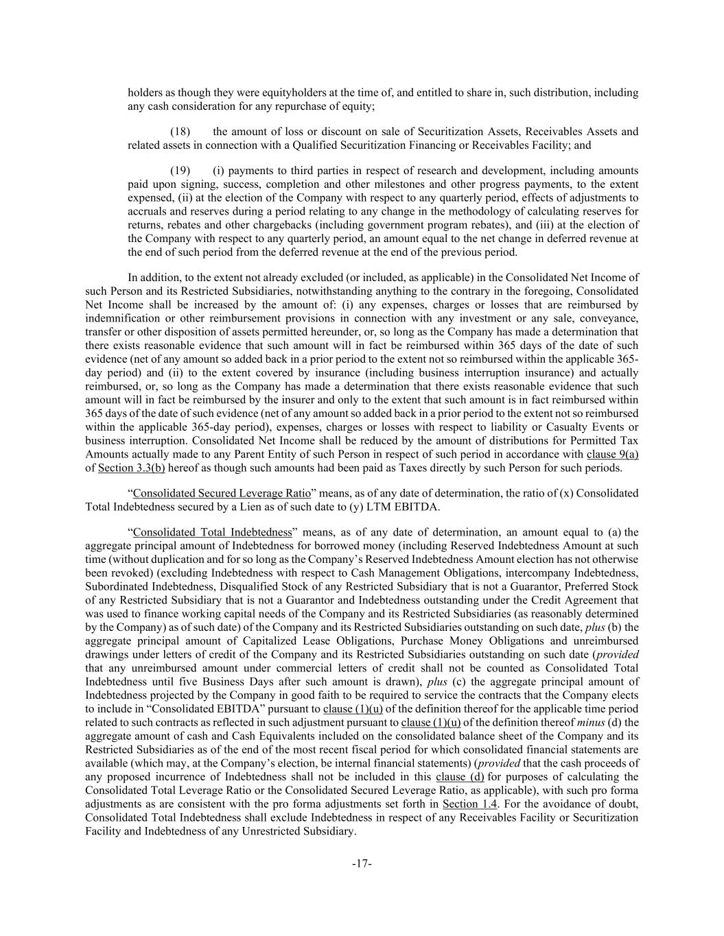 -17- holders as though they were equityholders at the time of, and entitled to share in, such distribution, including any cash consideration for any repurchase of equity; (18) the amount of loss or discount on sale of Securitization Assets, Receivables Assets and related assets in connection with a Qualified Securitization Financing or Receivables Facility; and (19) (i) payments to third parties in respect of research and development, including amounts paid upon signing, success, completion and other milestones and other progress payments, to the extent expensed, (ii) at the election of the Company with respect to any quarterly period, effects of adjustments to accruals and reserves during a period relating to any change in the methodology of calculating reserves for returns, rebates and other chargebacks (including government program rebates), and (iii) at the election of the Company with respect to any quarterly period, an amount equal to the net change in deferred revenue at the end of such period from the deferred revenue at the end of the previous period. In addition, to the extent not already excluded (or included, as applicable) in the Consolidated Net Income of such Person and its Restricted Subsidiaries, notwithstanding anything to the contrary in the foregoing, Consolidated Net Income shall be increased by the amount of: (i) any expenses, charges or losses that are reimbursed by indemnification or other reimbursement provisions in connection with any investment or any sale, conveyance, transfer or other disposition of assets permitted hereunder, or, so long as the Company has made a determination that there exists reasonable evidence that such amount will in fact be reimbursed within 365 days of the date of such evidence (net of any amount so added back in a prior period to the extent not so reimbursed within the applicable 365- day period) and (ii) to the extent covered by insurance (including business interruption insurance) and actually reimbursed, or, so long as the Company has made a determination that there exists reasonable evidence that such amount will in fact be reimbursed by the insurer and only to the extent that such amount is in fact reimbursed within 365 days of the date of such evidence (net of any amount so added back in a prior period to the extent not so reimbursed within the applicable 365-day period), expenses, charges or losses with respect to liability or Casualty Events or business interruption. Consolidated Net Income shall be reduced by the amount of distributions for Permitted Tax Amounts actually made to any Parent Entity of such Person in respect of such period in accordance with clause 9(a) of Section 3.3(b) hereof as though such amounts had been paid as Taxes directly by such Person for such periods. “Consolidated Secured Leverage Ratio” means, as of any date of determination, the ratio of (x) Consolidated Total Indebtedness secured by a Lien as of such date to (y) LTM EBITDA. “Consolidated Total Indebtedness” means, as of any date of determination, an amount equal to (a) the aggregate principal amount of Indebtedness for borrowed money (including Reserved Indebtedness Amount at such time (without duplication and for so long as the Company’s Reserved Indebtedness Amount election has not otherwise been revoked) (excluding Indebtedness with respect to Cash Management Obligations, intercompany Indebtedness, Subordinated Indebtedness, Disqualified Stock of any Restricted Subsidiary that is not a Guarantor, Preferred Stock of any Restricted Subsidiary that is not a Guarantor and Indebtedness outstanding under the Credit Agreement that was used to finance working capital needs of the Company and its Restricted Subsidiaries (as reasonably determined by the Company) as of such date) of the Company and its Restricted Subsidiaries outstanding on such date, plus (b) the aggregate principal amount of Capitalized Lease Obligations, Purchase Money Obligations and unreimbursed drawings under letters of credit of the Company and its Restricted Subsidiaries outstanding on such date (provided that any unreimbursed amount under commercial letters of credit shall not be counted as Consolidated Total Indebtedness until five Business Days after such amount is drawn), plus (c) the aggregate principal amount of Indebtedness projected by the Company in good faith to be required to service the contracts that the Company elects to include in “Consolidated EBITDA” pursuant to clause (1)(u) of the definition thereof for the applicable time period related to such contracts as reflected in such adjustment pursuant to clause (1)(u) of the definition thereof minus (d) the aggregate amount of cash and Cash Equivalents included on the consolidated balance sheet of the Company and its Restricted Subsidiaries as of the end of the most recent fiscal period for which consolidated financial statements are available (which may, at the Company’s election, be internal financial statements) (provided that the cash proceeds of any proposed incurrence of Indebtedness shall not be included in this clause (d) for purposes of calculating the Consolidated Total Leverage Ratio or the Consolidated Secured Leverage Ratio, as applicable), with such pro forma adjustments as are consistent with the pro forma adjustments set forth in Section 1.4. For the avoidance of doubt, Consolidated Total Indebtedness shall exclude Indebtedness in respect of any Receivables Facility or Securitization Facility and Indebtedness of any Unrestricted Subsidiary.