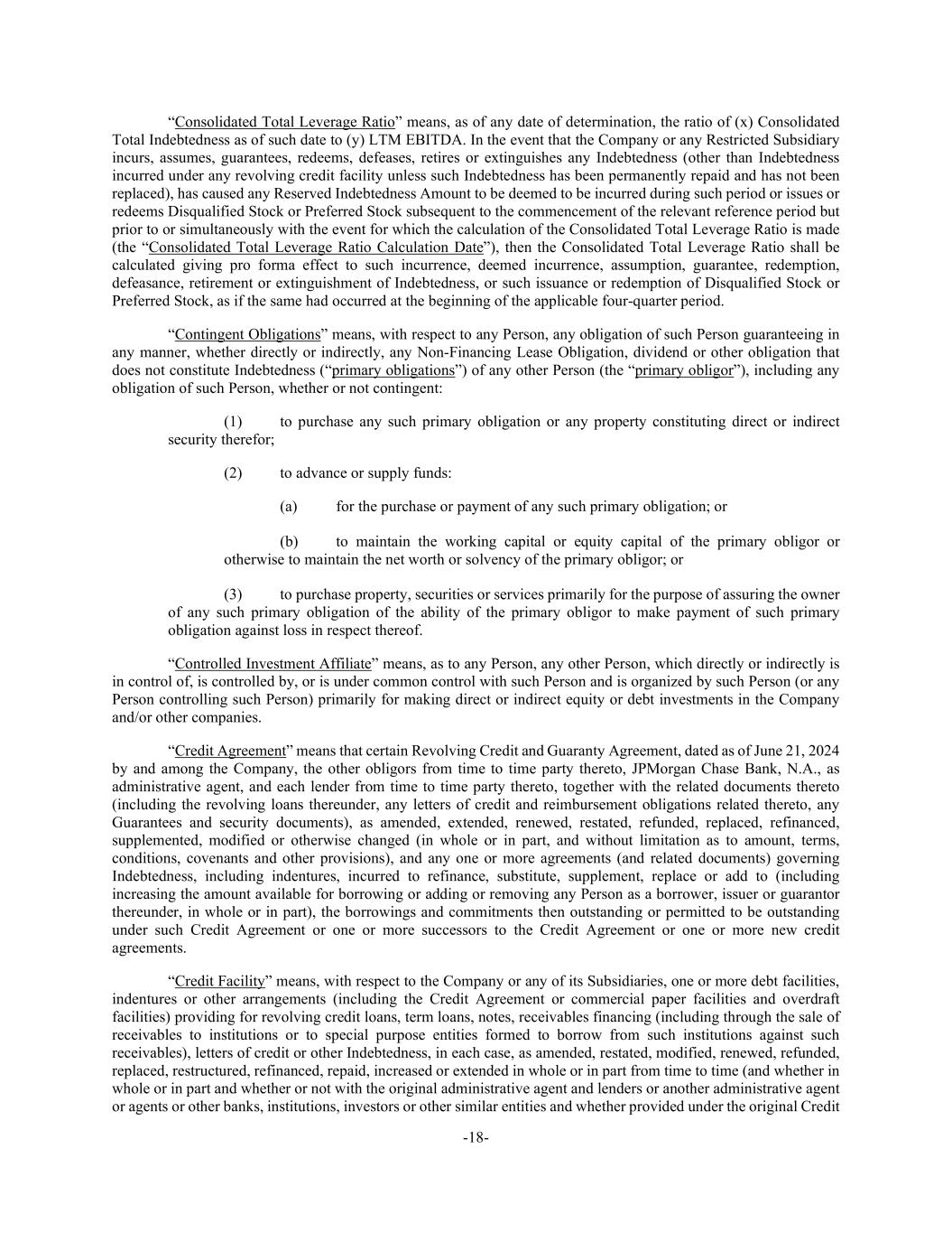 -18- “Consolidated Total Leverage Ratio” means, as of any date of determination, the ratio of (x) Consolidated Total Indebtedness as of such date to (y) LTM EBITDA. In the event that the Company or any Restricted Subsidiary incurs, assumes, guarantees, redeems, defeases, retires or extinguishes any Indebtedness (other than Indebtedness incurred under any revolving credit facility unless such Indebtedness has been permanently repaid and has not been replaced), has caused any Reserved Indebtedness Amount to be deemed to be incurred during such period or issues or redeems Disqualified Stock or Preferred Stock subsequent to the commencement of the relevant reference period but prior to or simultaneously with the event for which the calculation of the Consolidated Total Leverage Ratio is made (the “Consolidated Total Leverage Ratio Calculation Date”), then the Consolidated Total Leverage Ratio shall be calculated giving pro forma effect to such incurrence, deemed incurrence, assumption, guarantee, redemption, defeasance, retirement or extinguishment of Indebtedness, or such issuance or redemption of Disqualified Stock or Preferred Stock, as if the same had occurred at the beginning of the applicable four-quarter period. “Contingent Obligations” means, with respect to any Person, any obligation of such Person guaranteeing in any manner, whether directly or indirectly, any Non-Financing Lease Obligation, dividend or other obligation that does not constitute Indebtedness (“primary obligations”) of any other Person (the “primary obligor”), including any obligation of such Person, whether or not contingent: (1) to purchase any such primary obligation or any property constituting direct or indirect security therefor; (2) to advance or supply funds: (a) for the purchase or payment of any such primary obligation; or (b) to maintain the working capital or equity capital of the primary obligor or otherwise to maintain the net worth or solvency of the primary obligor; or (3) to purchase property, securities or services primarily for the purpose of assuring the owner of any such primary obligation of the ability of the primary obligor to make payment of such primary obligation against loss in respect thereof. “Controlled Investment Affiliate” means, as to any Person, any other Person, which directly or indirectly is in control of, is controlled by, or is under common control with such Person and is organized by such Person (or any Person controlling such Person) primarily for making direct or indirect equity or debt investments in the Company and/or other companies. “Credit Agreement” means that certain Revolving Credit and Guaranty Agreement, dated as of June 21, 2024 by and among the Company, the other obligors from time to time party thereto, JPMorgan Chase Bank, N.A., as administrative agent, and each lender from time to time party thereto, together with the related documents thereto (including the revolving loans thereunder, any letters of credit and reimbursement obligations related thereto, any Guarantees and security documents), as amended, extended, renewed, restated, refunded, replaced, refinanced, supplemented, modified or otherwise changed (in whole or in part, and without limitation as to amount, terms, conditions, covenants and other provisions), and any one or more agreements (and related documents) governing Indebtedness, including indentures, incurred to refinance, substitute, supplement, replace or add to (including increasing the amount available for borrowing or adding or removing any Person as a borrower, issuer or guarantor thereunder, in whole or in part), the borrowings and commitments then outstanding or permitted to be outstanding under such Credit Agreement or one or more successors to the Credit Agreement or one or more new credit agreements. “Credit Facility” means, with respect to the Company or any of its Subsidiaries, one or more debt facilities, indentures or other arrangements (including the Credit Agreement or commercial paper facilities and overdraft facilities) providing for revolving credit loans, term loans, notes, receivables financing (including through the sale of receivables to institutions or to special purpose entities formed to borrow from such institutions against such receivables), letters of credit or other Indebtedness, in each case, as amended, restated, modified, renewed, refunded, replaced, restructured, refinanced, repaid, increased or extended in whole or in part from time to time (and whether in whole or in part and whether or not with the original administrative agent and lenders or another administrative agent or agents or other banks, institutions, investors or other similar entities and whether provided under the original Credit