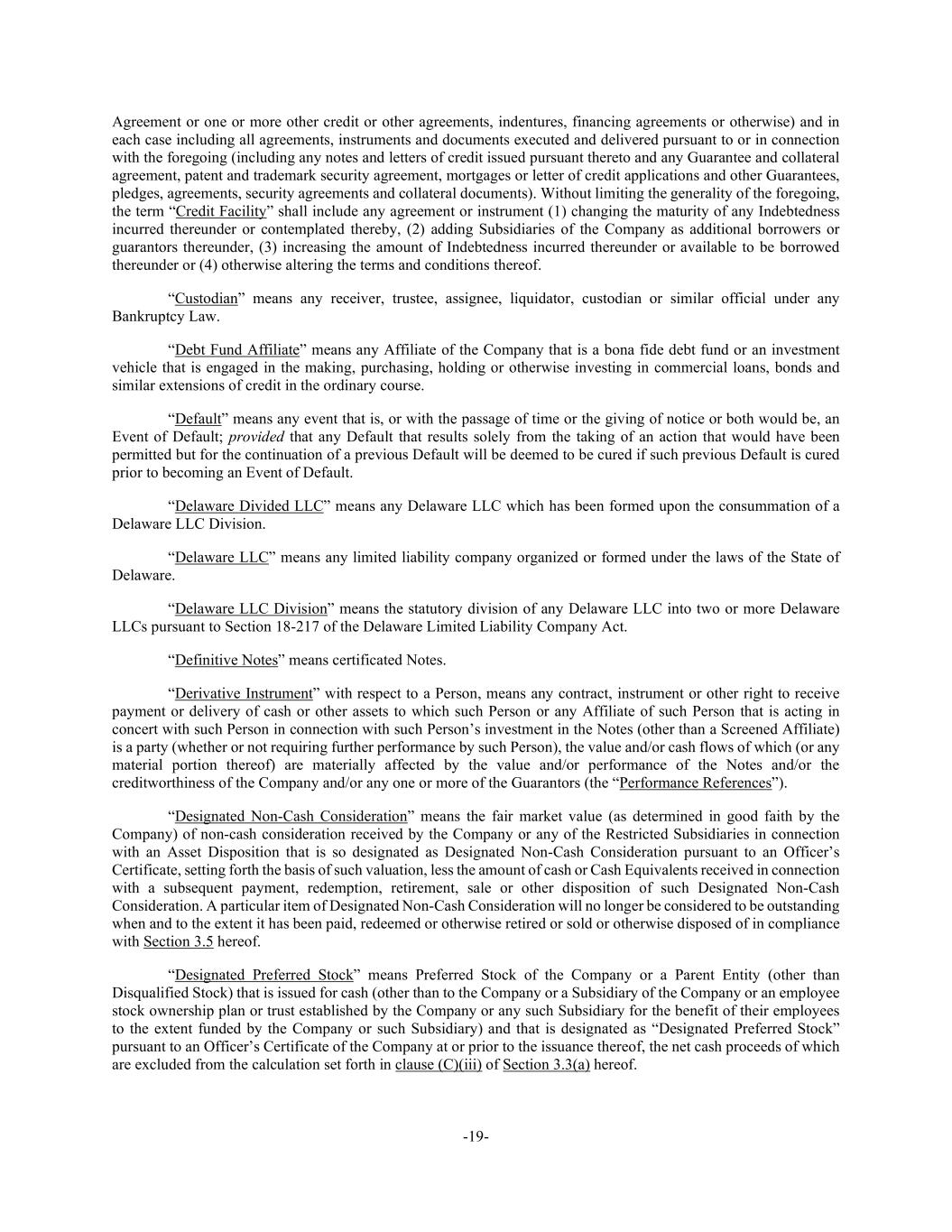 -19- Agreement or one or more other credit or other agreements, indentures, financing agreements or otherwise) and in each case including all agreements, instruments and documents executed and delivered pursuant to or in connection with the foregoing (including any notes and letters of credit issued pursuant thereto and any Guarantee and collateral agreement, patent and trademark security agreement, mortgages or letter of credit applications and other Guarantees, pledges, agreements, security agreements and collateral documents). Without limiting the generality of the foregoing, the term “Credit Facility” shall include any agreement or instrument (1) changing the maturity of any Indebtedness incurred thereunder or contemplated thereby, (2) adding Subsidiaries of the Company as additional borrowers or guarantors thereunder, (3) increasing the amount of Indebtedness incurred thereunder or available to be borrowed thereunder or (4) otherwise altering the terms and conditions thereof. “Custodian” means any receiver, trustee, assignee, liquidator, custodian or similar official under any Bankruptcy Law. “Debt Fund Affiliate” means any Affiliate of the Company that is a bona fide debt fund or an investment vehicle that is engaged in the making, purchasing, holding or otherwise investing in commercial loans, bonds and similar extensions of credit in the ordinary course. “Default” means any event that is, or with the passage of time or the giving of notice or both would be, an Event of Default; provided that any Default that results solely from the taking of an action that would have been permitted but for the continuation of a previous Default will be deemed to be cured if such previous Default is cured prior to becoming an Event of Default. “Delaware Divided LLC” means any Delaware LLC which has been formed upon the consummation of a Delaware LLC Division. “Delaware LLC” means any limited liability company organized or formed under the laws of the State of Delaware. “Delaware LLC Division” means the statutory division of any Delaware LLC into two or more Delaware LLCs pursuant to Section 18-217 of the Delaware Limited Liability Company Act. “Definitive Notes” means certificated Notes. “Derivative Instrument” with respect to a Person, means any contract, instrument or other right to receive payment or delivery of cash or other assets to which such Person or any Affiliate of such Person that is acting in concert with such Person in connection with such Person’s investment in the Notes (other than a Screened Affiliate) is a party (whether or not requiring further performance by such Person), the value and/or cash flows of which (or any material portion thereof) are materially affected by the value and/or performance of the Notes and/or the creditworthiness of the Company and/or any one or more of the Guarantors (the “Performance References”). “Designated Non-Cash Consideration” means the fair market value (as determined in good faith by the Company) of non-cash consideration received by the Company or any of the Restricted Subsidiaries in connection with an Asset Disposition that is so designated as Designated Non-Cash Consideration pursuant to an Officer’s Certificate, setting forth the basis of such valuation, less the amount of cash or Cash Equivalents received in connection with a subsequent payment, redemption, retirement, sale or other disposition of such Designated Non-Cash Consideration. A particular item of Designated Non-Cash Consideration will no longer be considered to be outstanding when and to the extent it has been paid, redeemed or otherwise retired or sold or otherwise disposed of in compliance with Section 3.5 hereof. “Designated Preferred Stock” means Preferred Stock of the Company or a Parent Entity (other than Disqualified Stock) that is issued for cash (other than to the Company or a Subsidiary of the Company or an employee stock ownership plan or trust established by the Company or any such Subsidiary for the benefit of their employees to the extent funded by the Company or such Subsidiary) and that is designated as “Designated Preferred Stock” pursuant to an Officer’s Certificate of the Company at or prior to the issuance thereof, the net cash proceeds of which are excluded from the calculation set forth in clause (C)(iii) of Section 3.3(a) hereof.