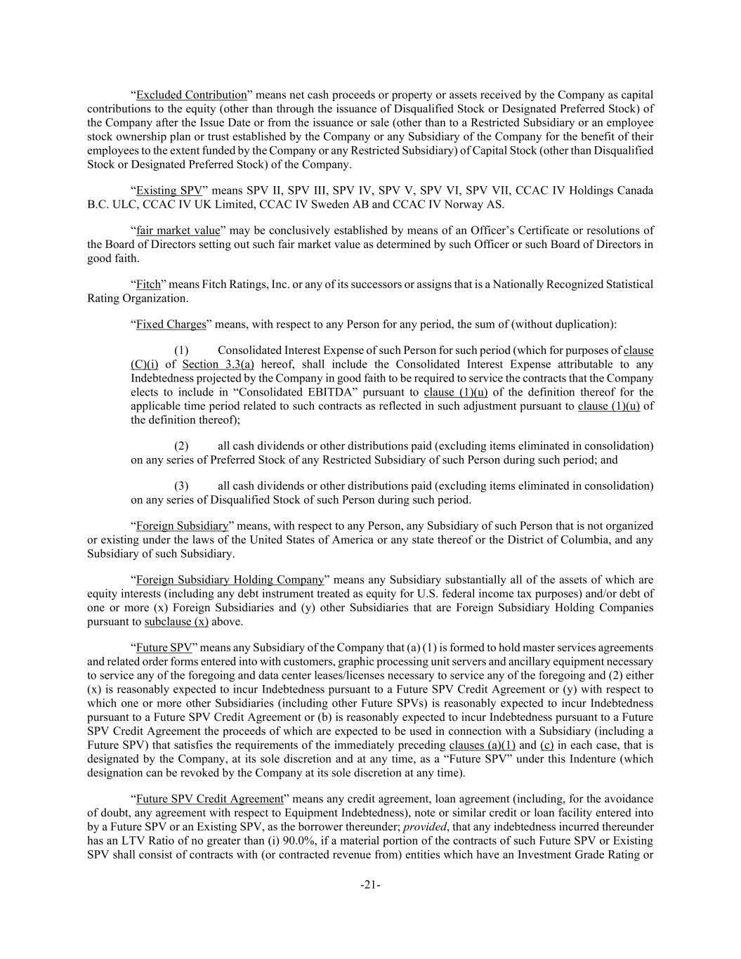 -21- “Excluded Contribution” means net cash proceeds or property or assets received by the Company as capital contributions to the equity (other than through the issuance of Disqualified Stock or Designated Preferred Stock) of the Company after the Issue Date or from the issuance or sale (other than to a Restricted Subsidiary or an employee stock ownership plan or trust established by the Company or any Subsidiary of the Company for the benefit of their employees to the extent funded by the Company or any Restricted Subsidiary) of Capital Stock (other than Disqualified Stock or Designated Preferred Stock) of the Company. “Existing SPV” means SPV II, SPV III, SPV IV, SPV V, SPV VI, SPV VII, CCAC IV Holdings Canada B.C. ULC, CCAC IV UK Limited, CCAC IV Sweden AB and CCAC IV Norway AS. “fair market value” may be conclusively established by means of an Officer’s Certificate or resolutions of the Board of Directors setting out such fair market value as determined by such Officer or such Board of Directors in good faith. “Fitch” means Fitch Ratings, Inc. or any of its successors or assigns that is a Nationally Recognized Statistical Rating Organization. “Fixed Charges” means, with respect to any Person for any period, the sum of (without duplication): (1) Consolidated Interest Expense of such Person for such period (which for purposes of clause (C)(i) of Section 3.3(a) hereof, shall include the Consolidated Interest Expense attributable to any Indebtedness projected by the Company in good faith to be required to service the contracts that the Company elects to include in “Consolidated EBITDA” pursuant to clause (1)(u) of the definition thereof for the applicable time period related to such contracts as reflected in such adjustment pursuant to clause (1)(u) of the definition thereof); (2) all cash dividends or other distributions paid (excluding items eliminated in consolidation) on any series of Preferred Stock of any Restricted Subsidiary of such Person during such period; and (3) all cash dividends or other distributions paid (excluding items eliminated in consolidation) on any series of Disqualified Stock of such Person during such period. “Foreign Subsidiary” means, with respect to any Person, any Subsidiary of such Person that is not organized or existing under the laws of the United States of America or any state thereof or the District of Columbia, and any Subsidiary of such Subsidiary. “Foreign Subsidiary Holding Company” means any Subsidiary substantially all of the assets of which are equity interests (including any debt instrument treated as equity for U.S. federal income tax purposes) and/or debt of one or more (x) Foreign Subsidiaries and (y) other Subsidiaries that are Foreign Subsidiary Holding Companies pursuant to subclause (x) above. “Future SPV” means any Subsidiary of the Company that (a) (1) is formed to hold master services agreements and related order forms entered into with customers, graphic processing unit servers and ancillary equipment necessary to service any of the foregoing and data center leases/licenses necessary to service any of the foregoing and (2) either (x) is reasonably expected to incur Indebtedness pursuant to a Future SPV Credit Agreement or (y) with respect to which one or more other Subsidiaries (including other Future SPVs) is reasonably expected to incur Indebtedness pursuant to a Future SPV Credit Agreement or (b) is reasonably expected to incur Indebtedness pursuant to a Future SPV Credit Agreement the proceeds of which are expected to be used in connection with a Subsidiary (including a Future SPV) that satisfies the requirements of the immediately preceding clauses (a)(1) and (c) in each case, that is designated by the Company, at its sole discretion and at any time, as a “Future SPV” under this Indenture (which designation can be revoked by the Company at its sole discretion at any time). “Future SPV Credit Agreement” means any credit agreement, loan agreement (including, for the avoidance of doubt, any agreement with respect to Equipment Indebtedness), note or similar credit or loan facility entered into by a Future SPV or an Existing SPV, as the borrower thereunder; provided, that any indebtedness incurred thereunder has an LTV Ratio of no greater than (i) 90.0%, if a material portion of the contracts of such Future SPV or Existing SPV shall consist of contracts with (or contracted revenue from) entities which have an Investment Grade Rating or