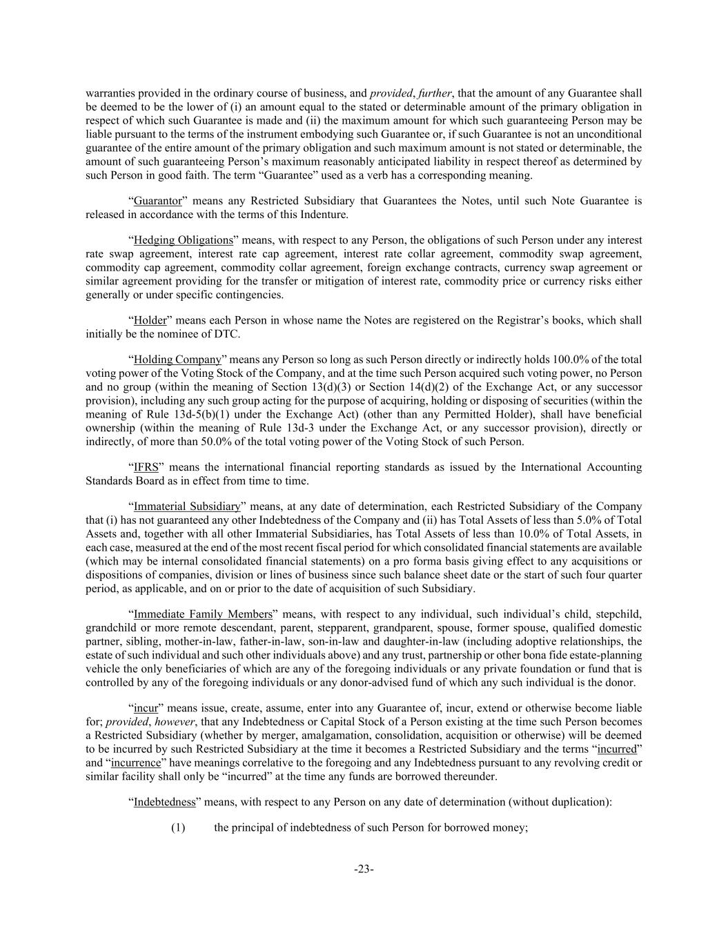 -23- warranties provided in the ordinary course of business, and provided, further, that the amount of any Guarantee shall be deemed to be the lower of (i) an amount equal to the stated or determinable amount of the primary obligation in respect of which such Guarantee is made and (ii) the maximum amount for which such guaranteeing Person may be liable pursuant to the terms of the instrument embodying such Guarantee or, if such Guarantee is not an unconditional guarantee of the entire amount of the primary obligation and such maximum amount is not stated or determinable, the amount of such guaranteeing Person’s maximum reasonably anticipated liability in respect thereof as determined by such Person in good faith. The term “Guarantee” used as a verb has a corresponding meaning. “Guarantor” means any Restricted Subsidiary that Guarantees the Notes, until such Note Guarantee is released in accordance with the terms of this Indenture. “Hedging Obligations” means, with respect to any Person, the obligations of such Person under any interest rate swap agreement, interest rate cap agreement, interest rate collar agreement, commodity swap agreement, commodity cap agreement, commodity collar agreement, foreign exchange contracts, currency swap agreement or similar agreement providing for the transfer or mitigation of interest rate, commodity price or currency risks either generally or under specific contingencies. “Holder” means each Person in whose name the Notes are registered on the Registrar’s books, which shall initially be the nominee of DTC. “Holding Company” means any Person so long as such Person directly or indirectly holds 100.0% of the total voting power of the Voting Stock of the Company, and at the time such Person acquired such voting power, no Person and no group (within the meaning of Section 13(d)(3) or Section 14(d)(2) of the Exchange Act, or any successor provision), including any such group acting for the purpose of acquiring, holding or disposing of securities (within the meaning of Rule 13d-5(b)(1) under the Exchange Act) (other than any Permitted Holder), shall have beneficial ownership (within the meaning of Rule 13d-3 under the Exchange Act, or any successor provision), directly or indirectly, of more than 50.0% of the total voting power of the Voting Stock of such Person. “IFRS” means the international financial reporting standards as issued by the International Accounting Standards Board as in effect from time to time. “Immaterial Subsidiary” means, at any date of determination, each Restricted Subsidiary of the Company that (i) has not guaranteed any other Indebtedness of the Company and (ii) has Total Assets of less than 5.0% of Total Assets and, together with all other Immaterial Subsidiaries, has Total Assets of less than 10.0% of Total Assets, in each case, measured at the end of the most recent fiscal period for which consolidated financial statements are available (which may be internal consolidated financial statements) on a pro forma basis giving effect to any acquisitions or dispositions of companies, division or lines of business since such balance sheet date or the start of such four quarter period, as applicable, and on or prior to the date of acquisition of such Subsidiary. “Immediate Family Members” means, with respect to any individual, such individual’s child, stepchild, grandchild or more remote descendant, parent, stepparent, grandparent, spouse, former spouse, qualified domestic partner, sibling, mother-in-law, father-in-law, son-in-law and daughter-in-law (including adoptive relationships, the estate of such individual and such other individuals above) and any trust, partnership or other bona fide estate-planning vehicle the only beneficiaries of which are any of the foregoing individuals or any private foundation or fund that is controlled by any of the foregoing individuals or any donor-advised fund of which any such individual is the donor. “incur” means issue, create, assume, enter into any Guarantee of, incur, extend or otherwise become liable for; provided, however, that any Indebtedness or Capital Stock of a Person existing at the time such Person becomes a Restricted Subsidiary (whether by merger, amalgamation, consolidation, acquisition or otherwise) will be deemed to be incurred by such Restricted Subsidiary at the time it becomes a Restricted Subsidiary and the terms “incurred” and “incurrence” have meanings correlative to the foregoing and any Indebtedness pursuant to any revolving credit or similar facility shall only be “incurred” at the time any funds are borrowed thereunder. “Indebtedness” means, with respect to any Person on any date of determination (without duplication): (1) the principal of indebtedness of such Person for borrowed money;