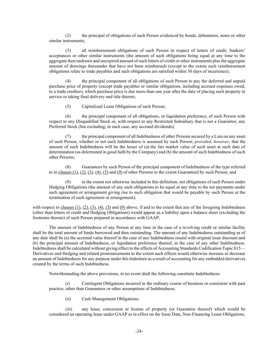 -24- (2) the principal of obligations of such Person evidenced by bonds, debentures, notes or other similar instruments; (3) all reimbursement obligations of such Person in respect of letters of credit, bankers’ acceptances or other similar instruments (the amount of such obligations being equal at any time to the aggregate then undrawn and unexpired amount of such letters of credit or other instruments plus the aggregate amount of drawings thereunder that have not been reimbursed) (except to the extent such reimbursement obligations relate to trade payables and such obligations are satisfied within 30 days of incurrence); (4) the principal component of all obligations of such Person to pay the deferred and unpaid purchase price of property (except trade payables or similar obligations, including accrued expenses owed, to a trade creditor), which purchase price is due more than one year after the date of placing such property in service or taking final delivery and title thereto; (5) Capitalized Lease Obligations of such Person; (6) the principal component of all obligations, or liquidation preference, of such Person with respect to any Disqualified Stock or, with respect to any Restricted Subsidiary that is not a Guarantor, any Preferred Stock (but excluding, in each case, any accrued dividends); (7) the principal component of all Indebtedness of other Persons secured by a Lien on any asset of such Person, whether or not such Indebtedness is assumed by such Person; provided, however, that the amount of such Indebtedness will be the lesser of (a) the fair market value of such asset at such date of determination (as determined in good faith by the Company) and (b) the amount of such Indebtedness of such other Persons; (8) Guarantees by such Person of the principal component of Indebtedness of the type referred to in clauses (1), (2), (3), (4), (5) and (9) of other Persons to the extent Guaranteed by such Person; and (9) to the extent not otherwise included in this definition, net obligations of such Person under Hedging Obligations (the amount of any such obligations to be equal at any time to the net payments under such agreement or arrangement giving rise to such obligation that would be payable by such Person at the termination of such agreement or arrangement); with respect to clauses (1), (2), (3), (4), (5) and (9) above, if and to the extent that any of the foregoing Indebtedness (other than letters of credit and Hedging Obligations) would appear as a liability upon a balance sheet (excluding the footnotes thereto) of such Person prepared in accordance with GAAP; The amount of Indebtedness of any Person at any time in the case of a revolving credit or similar facility shall be the total amount of funds borrowed and then outstanding. The amount of any Indebtedness outstanding as of any date shall be (a) the accreted value thereof in the case of any Indebtedness issued with original issue discount and (b) the principal amount of Indebtedness, or liquidation preference thereof, in the case of any other Indebtedness. Indebtedness shall be calculated without giving effect to the effects of Accounting Standards Codification Topic 815— Derivatives and Hedging and related pronouncements to the extent such effects would otherwise increase or decrease an amount of Indebtedness for any purpose under this Indenture as a result of accounting for any embedded derivatives created by the terms of such Indebtedness. Notwithstanding the above provisions, in no event shall the following constitute Indebtedness: (i) Contingent Obligations incurred in the ordinary course of business or consistent with past practice, other than Guarantees or other assumptions of Indebtedness; (ii) Cash Management Obligations; (iii) any lease, concession or license of property (or Guarantee thereof) which would be considered an operating lease under GAAP as in effect on the Issue Date, Non-Financing Lease Obligations,