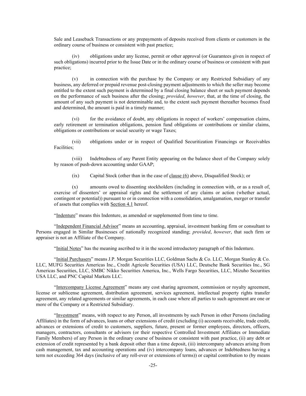 -25- Sale and Leaseback Transactions or any prepayments of deposits received from clients or customers in the ordinary course of business or consistent with past practice; (iv) obligations under any license, permit or other approval (or Guarantees given in respect of such obligations) incurred prior to the Issue Date or in the ordinary course of business or consistent with past practice; (v) in connection with the purchase by the Company or any Restricted Subsidiary of any business, any deferred or prepaid revenue post-closing payment adjustments to which the seller may become entitled to the extent such payment is determined by a final closing balance sheet or such payment depends on the performance of such business after the closing; provided, however, that, at the time of closing, the amount of any such payment is not determinable and, to the extent such payment thereafter becomes fixed and determined, the amount is paid in a timely manner; (vi) for the avoidance of doubt, any obligations in respect of workers’ compensation claims, early retirement or termination obligations, pension fund obligations or contributions or similar claims, obligations or contributions or social security or wage Taxes; (vii) obligations under or in respect of Qualified Securitization Financings or Receivables Facilities; (viii) Indebtedness of any Parent Entity appearing on the balance sheet of the Company solely by reason of push-down accounting under GAAP; (ix) Capital Stock (other than in the case of clause (6) above, Disqualified Stock); or (x) amounts owed to dissenting stockholders (including in connection with, or as a result of, exercise of dissenters’ or appraisal rights and the settlement of any claims or action (whether actual, contingent or potential)) pursuant to or in connection with a consolidation, amalgamation, merger or transfer of assets that complies with Section 4.1 hereof. “Indenture” means this Indenture, as amended or supplemented from time to time. “Independent Financial Advisor” means an accounting, appraisal, investment banking firm or consultant to Persons engaged in Similar Businesses of nationally recognized standing; provided, however, that such firm or appraiser is not an Affiliate of the Company. “Initial Notes” has the meaning ascribed to it in the second introductory paragraph of this Indenture. “Initial Purchasers” means J.P. Morgan Securities LLC, Goldman Sachs & Co. LLC, Morgan Stanley & Co. LLC, MUFG Securities Americas Inc., Credit Agricole Securities (USA) LLC, Deutsche Bank Securities Inc., SG Americas Securities, LLC, SMBC Nikko Securities America, Inc., Wells Fargo Securities, LLC, Mizuho Securities USA LLC, and PNC Capital Markets LLC. “Intercompany License Agreement” means any cost sharing agreement, commission or royalty agreement, license or sublicense agreement, distribution agreement, services agreement, intellectual property rights transfer agreement, any related agreements or similar agreements, in each case where all parties to such agreement are one or more of the Company or a Restricted Subsidiary. “Investment” means, with respect to any Person, all investments by such Person in other Persons (including Affiliates) in the form of advances, loans or other extensions of credit (excluding (i) accounts receivable, trade credit, advances or extensions of credit to customers, suppliers, future, present or former employees, directors, officers, managers, contractors, consultants or advisors (or their respective Controlled Investment Affiliates or Immediate Family Members) of any Person in the ordinary course of business or consistent with past practice, (ii) any debt or extension of credit represented by a bank deposit other than a time deposit, (iii) intercompany advances arising from cash management, tax and accounting operations and (iv) intercompany loans, advances or Indebtedness having a term not exceeding 364 days (inclusive of any roll-over or extensions of terms)) or capital contribution to (by means