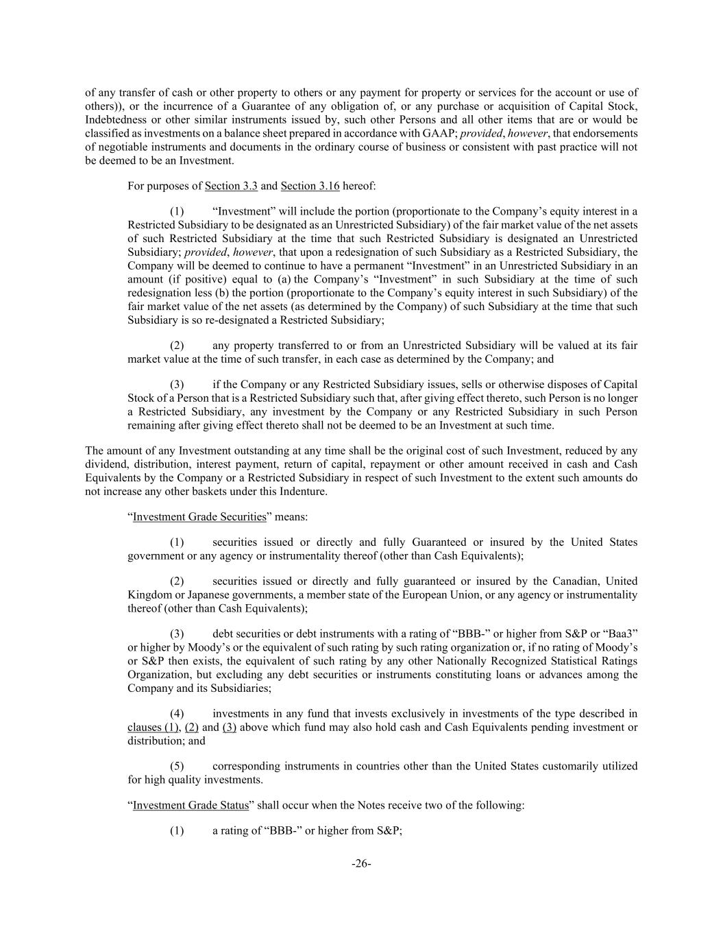 -26- of any transfer of cash or other property to others or any payment for property or services for the account or use of others)), or the incurrence of a Guarantee of any obligation of, or any purchase or acquisition of Capital Stock, Indebtedness or other similar instruments issued by, such other Persons and all other items that are or would be classified as investments on a balance sheet prepared in accordance with GAAP; provided, however, that endorsements of negotiable instruments and documents in the ordinary course of business or consistent with past practice will not be deemed to be an Investment. For purposes of Section 3.3 and Section 3.16 hereof: (1) “Investment” will include the portion (proportionate to the Company’s equity interest in a Restricted Subsidiary to be designated as an Unrestricted Subsidiary) of the fair market value of the net assets of such Restricted Subsidiary at the time that such Restricted Subsidiary is designated an Unrestricted Subsidiary; provided, however, that upon a redesignation of such Subsidiary as a Restricted Subsidiary, the Company will be deemed to continue to have a permanent “Investment” in an Unrestricted Subsidiary in an amount (if positive) equal to (a) the Company’s “Investment” in such Subsidiary at the time of such redesignation less (b) the portion (proportionate to the Company’s equity interest in such Subsidiary) of the fair market value of the net assets (as determined by the Company) of such Subsidiary at the time that such Subsidiary is so re-designated a Restricted Subsidiary; (2) any property transferred to or from an Unrestricted Subsidiary will be valued at its fair market value at the time of such transfer, in each case as determined by the Company; and (3) if the Company or any Restricted Subsidiary issues, sells or otherwise disposes of Capital Stock of a Person that is a Restricted Subsidiary such that, after giving effect thereto, such Person is no longer a Restricted Subsidiary, any investment by the Company or any Restricted Subsidiary in such Person remaining after giving effect thereto shall not be deemed to be an Investment at such time. The amount of any Investment outstanding at any time shall be the original cost of such Investment, reduced by any dividend, distribution, interest payment, return of capital, repayment or other amount received in cash and Cash Equivalents by the Company or a Restricted Subsidiary in respect of such Investment to the extent such amounts do not increase any other baskets under this Indenture. “Investment Grade Securities” means: (1) securities issued or directly and fully Guaranteed or insured by the United States government or any agency or instrumentality thereof (other than Cash Equivalents); (2) securities issued or directly and fully guaranteed or insured by the Canadian, United Kingdom or Japanese governments, a member state of the European Union, or any agency or instrumentality thereof (other than Cash Equivalents); (3) debt securities or debt instruments with a rating of “BBB-” or higher from S&P or “Baa3” or higher by Moody’s or the equivalent of such rating by such rating organization or, if no rating of Moody’s or S&P then exists, the equivalent of such rating by any other Nationally Recognized Statistical Ratings Organization, but excluding any debt securities or instruments constituting loans or advances among the Company and its Subsidiaries; (4) investments in any fund that invests exclusively in investments of the type described in clauses (1), (2) and (3) above which fund may also hold cash and Cash Equivalents pending investment or distribution; and (5) corresponding instruments in countries other than the United States customarily utilized for high quality investments. “Investment Grade Status” shall occur when the Notes receive two of the following: (1) a rating of “BBB-” or higher from S&P;