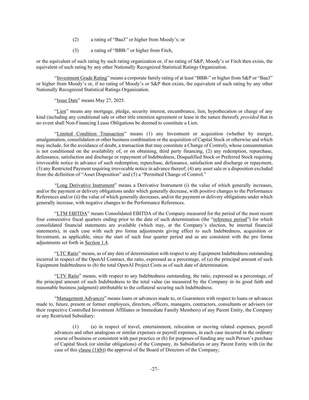 -27- (2) a rating of “Baa3” or higher from Moody’s; or (3) a rating of “BBB-” or higher from Fitch, or the equivalent of such rating by such rating organization or, if no rating of S&P, Moody’s or Fitch then exists, the equivalent of such rating by any other Nationally Recognized Statistical Ratings Organization. “Investment Grade Rating” means a corporate family rating of at least “BBB-” or higher from S&P or “Baa3” or higher from Moody’s or, if no rating of Moody’s or S&P then exists, the equivalent of such rating by any other Nationally Recognized Statistical Ratings Organization. “Issue Date” means May 27, 2025. “Lien” means any mortgage, pledge, security interest, encumbrance, lien, hypothecation or charge of any kind (including any conditional sale or other title retention agreement or lease in the nature thereof); provided that in no event shall Non-Financing Lease Obligations be deemed to constitute a Lien. “Limited Condition Transaction” means (1) any Investment or acquisition (whether by merger, amalgamation, consolidation or other business combination or the acquisition of Capital Stock or otherwise and which may include, for the avoidance of doubt, a transaction that may constitute a Change of Control), whose consummation is not conditioned on the availability of, or on obtaining, third party financing, (2) any redemption, repurchase, defeasance, satisfaction and discharge or repayment of Indebtedness, Disqualified Stock or Preferred Stock requiring irrevocable notice in advance of such redemption, repurchase, defeasance, satisfaction and discharge or repayment, (3) any Restricted Payment requiring irrevocable notice in advance thereof; (4) any asset sale or a disposition excluded from the definition of “Asset Disposition” and (5) a “Permitted Change of Control.” “Long Derivative Instrument” means a Derivative Instrument (i) the value of which generally increases, and/or the payment or delivery obligations under which generally decrease, with positive changes to the Performance References and/or (ii) the value of which generally decreases, and/or the payment or delivery obligations under which generally increase, with negative changes to the Performance References. “LTM EBITDA” means Consolidated EBITDA of the Company measured for the period of the most recent four consecutive fiscal quarters ending prior to the date of such determination (the “reference period”) for which consolidated financial statements are available (which may, at the Company’s election, be internal financial statements), in each case with such pro forma adjustments giving effect to such Indebtedness, acquisition or Investment, as applicable, since the start of such four quarter period and as are consistent with the pro forma adjustments set forth in Section 1.4. “LTC Ratio” means, as of any date of determination with respect to any Equipment Indebtedness outstanding incurred in respect of the OpenAI Contract, the ratio, expressed as a percentage, of (a) the principal amount of such Equipment Indebtedness to (b) the total OpenAI Project Costs as of such date of determination. “LTV Ratio” means, with respect to any Indebtedness outstanding, the ratio, expressed as a percentage, of the principal amount of such Indebtedness to the total value (as measured by the Company in its good faith and reasonable business judgment) attributable to the collateral securing such Indebtedness. “Management Advances” means loans or advances made to, or Guarantees with respect to loans or advances made to, future, present or former employees, directors, officers, managers, contractors, consultants or advisors (or their respective Controlled Investment Affiliates or Immediate Family Members) of any Parent Entity, the Company or any Restricted Subsidiary: (1) (a) in respect of travel, entertainment, relocation or moving related expenses, payroll advances and other analogous or similar expenses or payroll expenses, in each case incurred in the ordinary course of business or consistent with past practice or (b) for purposes of funding any such Person’s purchase of Capital Stock (or similar obligations) of the Company, its Subsidiaries or any Parent Entity with (in the case of this clause (1)(b)) the approval of the Board of Directors of the Company;