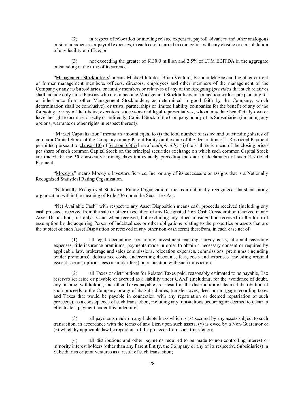 -28- (2) in respect of relocation or moving related expenses, payroll advances and other analogous or similar expenses or payroll expenses, in each case incurred in connection with any closing or consolidation of any facility or office; or (3) not exceeding the greater of $130.0 million and 2.5% of LTM EBITDA in the aggregate outstanding at the time of incurrence. “Management Stockholders” means Michael Intrator, Brian Venturo, Brannin McBee and the other current or former management members, officers, directors, employees and other members of the management of the Company or any its Subsidiaries, or family members or relatives of any of the foregoing (provided that such relatives shall include only those Persons who are or become Management Stockholders in connection with estate planning for or inheritance from other Management Stockholders, as determined in good faith by the Company, which determination shall be conclusive), or trusts, partnerships or limited liability companies for the benefit of any of the foregoing, or any of their heirs, executors, successors and legal representatives, who at any date beneficially own or have the right to acquire, directly or indirectly, Capital Stock of the Company or any of its Subsidiaries (including any options, warrants or other rights in respect thereof). “Market Capitalization” means an amount equal to (i) the total number of issued and outstanding shares of common Capital Stock of the Company or any Parent Entity on the date of the declaration of a Restricted Payment permitted pursuant to clause (10) of Section 3.3(b) hereof multiplied by (ii) the arithmetic mean of the closing prices per share of such common Capital Stock on the principal securities exchange on which such common Capital Stock are traded for the 30 consecutive trading days immediately preceding the date of declaration of such Restricted Payment. “Moody’s” means Moody’s Investors Service, Inc. or any of its successors or assigns that is a Nationally Recognized Statistical Rating Organization. “Nationally Recognized Statistical Rating Organization” means a nationally recognized statistical rating organization within the meaning of Rule 436 under the Securities Act. “Net Available Cash” with respect to any Asset Disposition means cash proceeds received (including any cash proceeds received from the sale or other disposition of any Designated Non-Cash Consideration received in any Asset Disposition, but only as and when received, but excluding any other consideration received in the form of assumption by the acquiring Person of Indebtedness or other obligations relating to the properties or assets that are the subject of such Asset Disposition or received in any other non-cash form) therefrom, in each case net of: (1) all legal, accounting, consulting, investment banking, survey costs, title and recording expenses, title insurance premiums, payments made in order to obtain a necessary consent or required by applicable law, brokerage and sales commissions, relocation expenses, commissions, premiums (including tender premiums), defeasance costs, underwriting discounts, fees, costs and expenses (including original issue discount, upfront fees or similar fees) in connection with such transaction; (2) all Taxes or distributions for Related Taxes paid, reasonably estimated to be payable, Tax reserves set aside or payable or accrued as a liability under GAAP (including, for the avoidance of doubt, any income, withholding and other Taxes payable as a result of the distribution or deemed distribution of such proceeds to the Company or any of its Subsidiaries, transfer taxes, deed or mortgage recording taxes and Taxes that would be payable in connection with any repatriation or deemed repatriation of such proceeds), as a consequence of such transaction, including any transactions occurring or deemed to occur to effectuate a payment under this Indenture; (3) all payments made on any Indebtedness which is (x) secured by any assets subject to such transaction, in accordance with the terms of any Lien upon such assets, (y) is owed by a Non-Guarantor or (z) which by applicable law be repaid out of the proceeds from such transaction; (4) all distributions and other payments required to be made to non-controlling interest or minority interest holders (other than any Parent Entity, the Company or any of its respective Subsidiaries) in Subsidiaries or joint ventures as a result of such transaction;