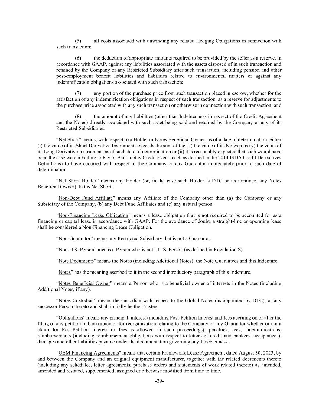 -29- (5) all costs associated with unwinding any related Hedging Obligations in connection with such transaction; (6) the deduction of appropriate amounts required to be provided by the seller as a reserve, in accordance with GAAP, against any liabilities associated with the assets disposed of in such transaction and retained by the Company or any Restricted Subsidiary after such transaction, including pension and other post-employment benefit liabilities and liabilities related to environmental matters or against any indemnification obligations associated with such transaction; (7) any portion of the purchase price from such transaction placed in escrow, whether for the satisfaction of any indemnification obligations in respect of such transaction, as a reserve for adjustments to the purchase price associated with any such transaction or otherwise in connection with such transaction; and (8) the amount of any liabilities (other than Indebtedness in respect of the Credit Agreement and the Notes) directly associated with such asset being sold and retained by the Company or any of its Restricted Subsidiaries. “Net Short” means, with respect to a Holder or Notes Beneficial Owner, as of a date of determination, either (i) the value of its Short Derivative Instruments exceeds the sum of the (x) the value of its Notes plus (y) the value of its Long Derivative Instruments as of such date of determination or (ii) it is reasonably expected that such would have been the case were a Failure to Pay or Bankruptcy Credit Event (each as defined in the 2014 ISDA Credit Derivatives Definitions) to have occurred with respect to the Company or any Guarantor immediately prior to such date of determination. “Net Short Holder” means any Holder (or, in the case such Holder is DTC or its nominee, any Notes Beneficial Owner) that is Net Short. “Non-Debt Fund Affiliate” means any Affiliate of the Company other than (a) the Company or any Subsidiary of the Company, (b) any Debt Fund Affiliates and (c) any natural person. “Non-Financing Lease Obligation” means a lease obligation that is not required to be accounted for as a financing or capital lease in accordance with GAAP. For the avoidance of doubt, a straight-line or operating lease shall be considered a Non-Financing Lease Obligation. “Non-Guarantor” means any Restricted Subsidiary that is not a Guarantor. “Non-U.S. Person” means a Person who is not a U.S. Person (as defined in Regulation S). “Note Documents” means the Notes (including Additional Notes), the Note Guarantees and this Indenture. “Notes” has the meaning ascribed to it in the second introductory paragraph of this Indenture. “Notes Beneficial Owner” means a Person who is a beneficial owner of interests in the Notes (including Additional Notes, if any). “Notes Custodian” means the custodian with respect to the Global Notes (as appointed by DTC), or any successor Person thereto and shall initially be the Trustee. “Obligations” means any principal, interest (including Post-Petition Interest and fees accruing on or after the filing of any petition in bankruptcy or for reorganization relating to the Company or any Guarantor whether or not a claim for Post-Petition Interest or fees is allowed in such proceedings), penalties, fees, indemnifications, reimbursements (including reimbursement obligations with respect to letters of credit and bankers’ acceptances), damages and other liabilities payable under the documentation governing any Indebtedness. “OEM Financing Agreements” means that certain Framework Lease Agreement, dated August 30, 2023, by and between the Company and an original equipment manufacturer, together with the related documents thereto (including any schedules, letter agreements, purchase orders and statements of work related thereto) as amended, amended and restated, supplemented, assigned or otherwise modified from time to time.