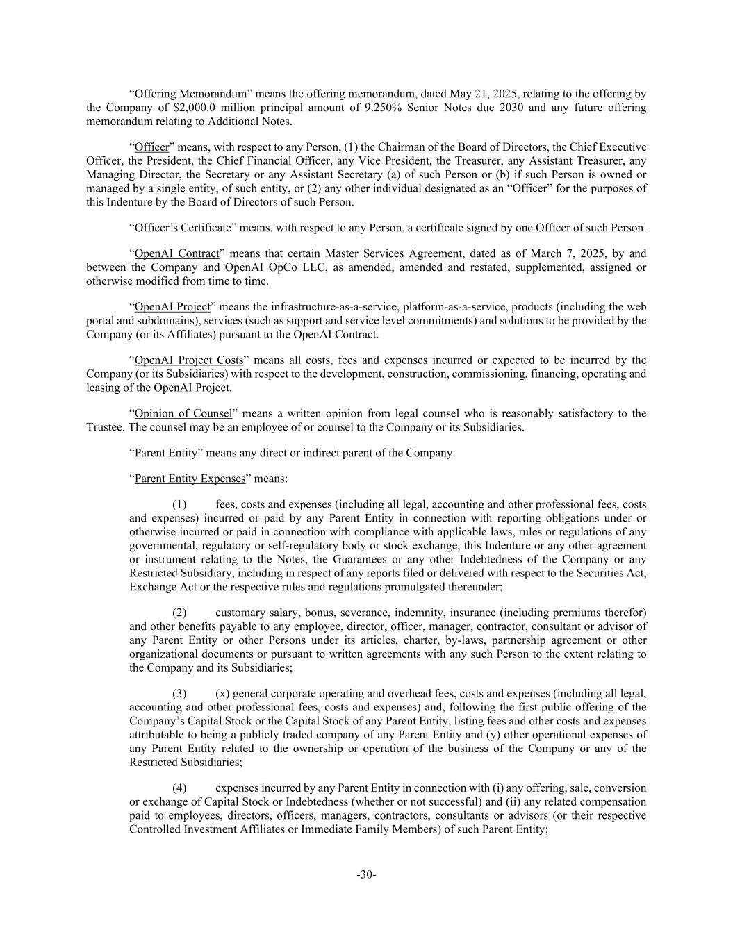 -30- “Offering Memorandum” means the offering memorandum, dated May 21, 2025, relating to the offering by the Company of $2,000.0 million principal amount of 9.250% Senior Notes due 2030 and any future offering memorandum relating to Additional Notes. “Officer” means, with respect to any Person, (1) the Chairman of the Board of Directors, the Chief Executive Officer, the President, the Chief Financial Officer, any Vice President, the Treasurer, any Assistant Treasurer, any Managing Director, the Secretary or any Assistant Secretary (a) of such Person or (b) if such Person is owned or managed by a single entity, of such entity, or (2) any other individual designated as an “Officer” for the purposes of this Indenture by the Board of Directors of such Person. “Officer’s Certificate” means, with respect to any Person, a certificate signed by one Officer of such Person. “OpenAI Contract” means that certain Master Services Agreement, dated as of March 7, 2025, by and between the Company and OpenAI OpCo LLC, as amended, amended and restated, supplemented, assigned or otherwise modified from time to time. “OpenAI Project” means the infrastructure-as-a-service, platform-as-a-service, products (including the web portal and subdomains), services (such as support and service level commitments) and solutions to be provided by the Company (or its Affiliates) pursuant to the OpenAI Contract. “OpenAI Project Costs” means all costs, fees and expenses incurred or expected to be incurred by the Company (or its Subsidiaries) with respect to the development, construction, commissioning, financing, operating and leasing of the OpenAI Project. “Opinion of Counsel” means a written opinion from legal counsel who is reasonably satisfactory to the Trustee. The counsel may be an employee of or counsel to the Company or its Subsidiaries. “Parent Entity” means any direct or indirect parent of the Company. “Parent Entity Expenses” means: (1) fees, costs and expenses (including all legal, accounting and other professional fees, costs and expenses) incurred or paid by any Parent Entity in connection with reporting obligations under or otherwise incurred or paid in connection with compliance with applicable laws, rules or regulations of any governmental, regulatory or self-regulatory body or stock exchange, this Indenture or any other agreement or instrument relating to the Notes, the Guarantees or any other Indebtedness of the Company or any Restricted Subsidiary, including in respect of any reports filed or delivered with respect to the Securities Act, Exchange Act or the respective rules and regulations promulgated thereunder; (2) customary salary, bonus, severance, indemnity, insurance (including premiums therefor) and other benefits payable to any employee, director, officer, manager, contractor, consultant or advisor of any Parent Entity or other Persons under its articles, charter, by-laws, partnership agreement or other organizational documents or pursuant to written agreements with any such Person to the extent relating to the Company and its Subsidiaries; (3) (x) general corporate operating and overhead fees, costs and expenses (including all legal, accounting and other professional fees, costs and expenses) and, following the first public offering of the Company’s Capital Stock or the Capital Stock of any Parent Entity, listing fees and other costs and expenses attributable to being a publicly traded company of any Parent Entity and (y) other operational expenses of any Parent Entity related to the ownership or operation of the business of the Company or any of the Restricted Subsidiaries; (4) expenses incurred by any Parent Entity in connection with (i) any offering, sale, conversion or exchange of Capital Stock or Indebtedness (whether or not successful) and (ii) any related compensation paid to employees, directors, officers, managers, contractors, consultants or advisors (or their respective Controlled Investment Affiliates or Immediate Family Members) of such Parent Entity;