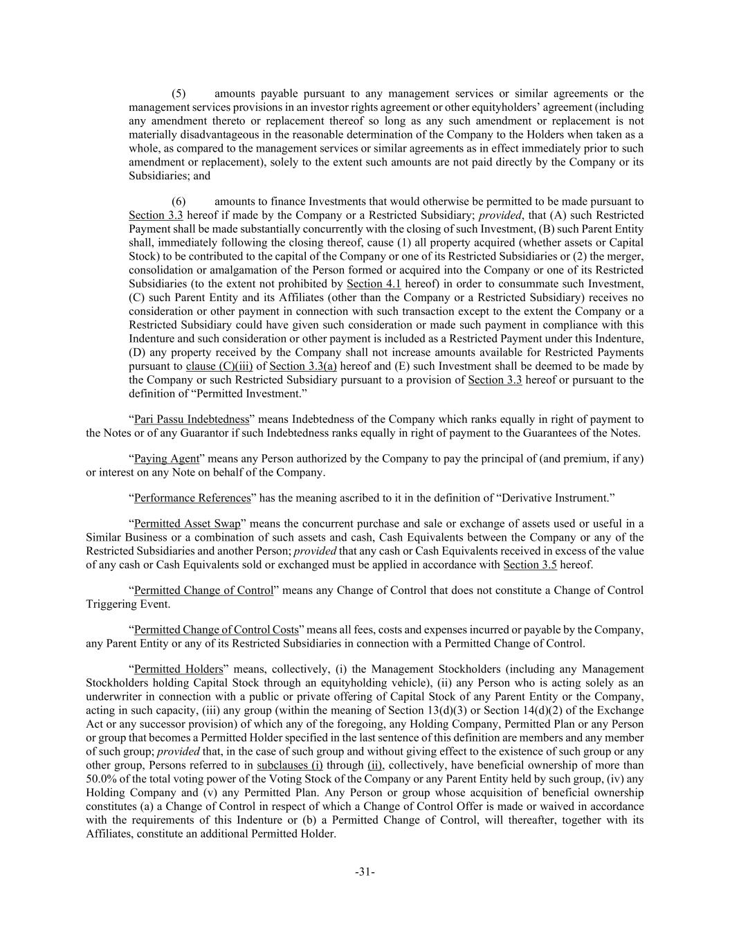 -31- (5) amounts payable pursuant to any management services or similar agreements or the management services provisions in an investor rights agreement or other equityholders’ agreement (including any amendment thereto or replacement thereof so long as any such amendment or replacement is not materially disadvantageous in the reasonable determination of the Company to the Holders when taken as a whole, as compared to the management services or similar agreements as in effect immediately prior to such amendment or replacement), solely to the extent such amounts are not paid directly by the Company or its Subsidiaries; and (6) amounts to finance Investments that would otherwise be permitted to be made pursuant to Section 3.3 hereof if made by the Company or a Restricted Subsidiary; provided, that (A) such Restricted Payment shall be made substantially concurrently with the closing of such Investment, (B) such Parent Entity shall, immediately following the closing thereof, cause (1) all property acquired (whether assets or Capital Stock) to be contributed to the capital of the Company or one of its Restricted Subsidiaries or (2) the merger, consolidation or amalgamation of the Person formed or acquired into the Company or one of its Restricted Subsidiaries (to the extent not prohibited by Section 4.1 hereof) in order to consummate such Investment, (C) such Parent Entity and its Affiliates (other than the Company or a Restricted Subsidiary) receives no consideration or other payment in connection with such transaction except to the extent the Company or a Restricted Subsidiary could have given such consideration or made such payment in compliance with this Indenture and such consideration or other payment is included as a Restricted Payment under this Indenture, (D) any property received by the Company shall not increase amounts available for Restricted Payments pursuant to clause (C)(iii) of Section 3.3(a) hereof and (E) such Investment shall be deemed to be made by the Company or such Restricted Subsidiary pursuant to a provision of Section 3.3 hereof or pursuant to the definition of “Permitted Investment.” “Pari Passu Indebtedness” means Indebtedness of the Company which ranks equally in right of payment to the Notes or of any Guarantor if such Indebtedness ranks equally in right of payment to the Guarantees of the Notes. “Paying Agent” means any Person authorized by the Company to pay the principal of (and premium, if any) or interest on any Note on behalf of the Company. “Performance References” has the meaning ascribed to it in the definition of “Derivative Instrument.” “Permitted Asset Swap” means the concurrent purchase and sale or exchange of assets used or useful in a Similar Business or a combination of such assets and cash, Cash Equivalents between the Company or any of the Restricted Subsidiaries and another Person; provided that any cash or Cash Equivalents received in excess of the value of any cash or Cash Equivalents sold or exchanged must be applied in accordance with Section 3.5 hereof. “Permitted Change of Control” means any Change of Control that does not constitute a Change of Control Triggering Event. “Permitted Change of Control Costs” means all fees, costs and expenses incurred or payable by the Company, any Parent Entity or any of its Restricted Subsidiaries in connection with a Permitted Change of Control. “Permitted Holders” means, collectively, (i) the Management Stockholders (including any Management Stockholders holding Capital Stock through an equityholding vehicle), (ii) any Person who is acting solely as an underwriter in connection with a public or private offering of Capital Stock of any Parent Entity or the Company, acting in such capacity, (iii) any group (within the meaning of Section 13(d)(3) or Section 14(d)(2) of the Exchange Act or any successor provision) of which any of the foregoing, any Holding Company, Permitted Plan or any Person or group that becomes a Permitted Holder specified in the last sentence of this definition are members and any member of such group; provided that, in the case of such group and without giving effect to the existence of such group or any other group, Persons referred to in subclauses (i) through (ii), collectively, have beneficial ownership of more than 50.0% of the total voting power of the Voting Stock of the Company or any Parent Entity held by such group, (iv) any Holding Company and (v) any Permitted Plan. Any Person or group whose acquisition of beneficial ownership constitutes (a) a Change of Control in respect of which a Change of Control Offer is made or waived in accordance with the requirements of this Indenture or (b) a Permitted Change of Control, will thereafter, together with its Affiliates, constitute an additional Permitted Holder.