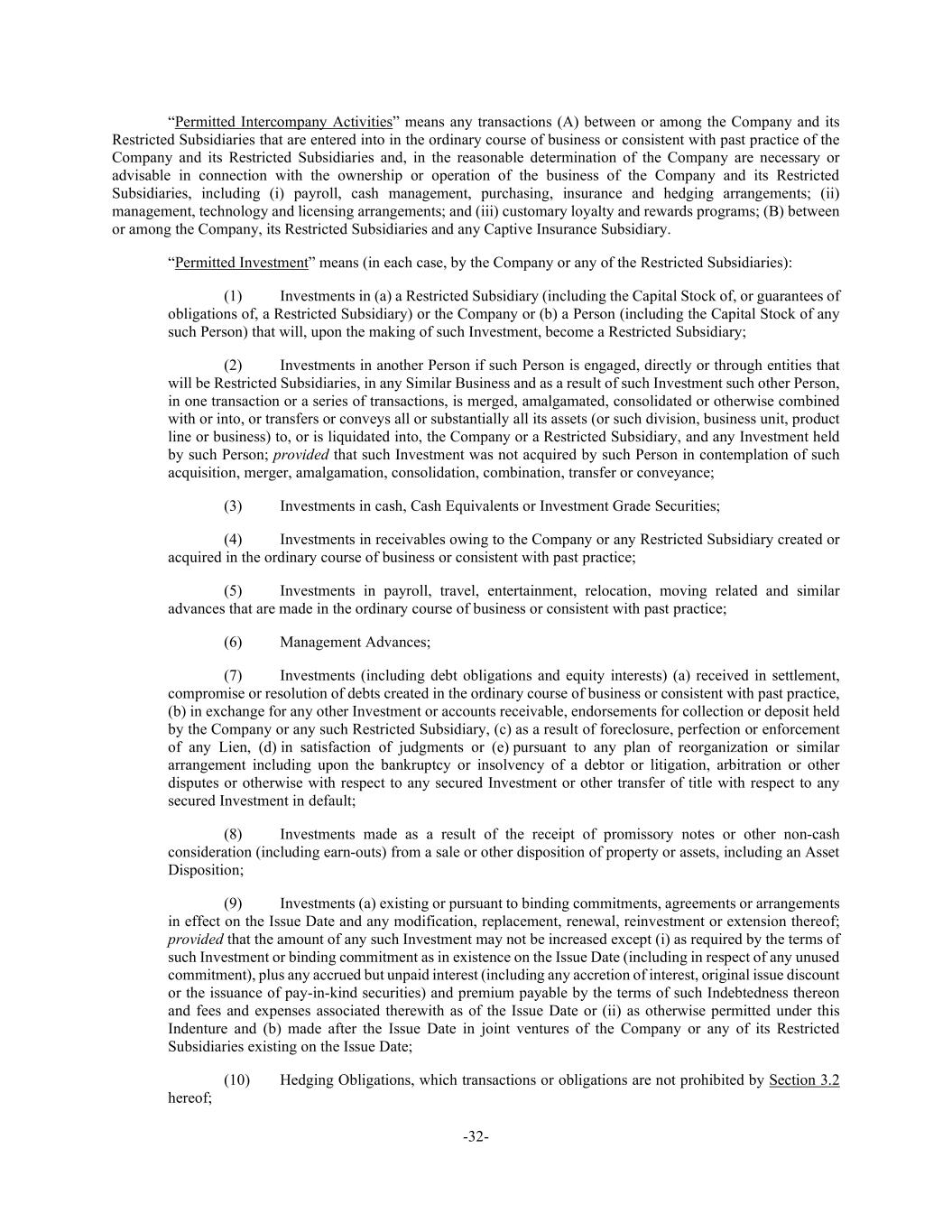 -32- “Permitted Intercompany Activities” means any transactions (A) between or among the Company and its Restricted Subsidiaries that are entered into in the ordinary course of business or consistent with past practice of the Company and its Restricted Subsidiaries and, in the reasonable determination of the Company are necessary or advisable in connection with the ownership or operation of the business of the Company and its Restricted Subsidiaries, including (i) payroll, cash management, purchasing, insurance and hedging arrangements; (ii) management, technology and licensing arrangements; and (iii) customary loyalty and rewards programs; (B) between or among the Company, its Restricted Subsidiaries and any Captive Insurance Subsidiary. “Permitted Investment” means (in each case, by the Company or any of the Restricted Subsidiaries): (1) Investments in (a) a Restricted Subsidiary (including the Capital Stock of, or guarantees of obligations of, a Restricted Subsidiary) or the Company or (b) a Person (including the Capital Stock of any such Person) that will, upon the making of such Investment, become a Restricted Subsidiary; (2) Investments in another Person if such Person is engaged, directly or through entities that will be Restricted Subsidiaries, in any Similar Business and as a result of such Investment such other Person, in one transaction or a series of transactions, is merged, amalgamated, consolidated or otherwise combined with or into, or transfers or conveys all or substantially all its assets (or such division, business unit, product line or business) to, or is liquidated into, the Company or a Restricted Subsidiary, and any Investment held by such Person; provided that such Investment was not acquired by such Person in contemplation of such acquisition, merger, amalgamation, consolidation, combination, transfer or conveyance; (3) Investments in cash, Cash Equivalents or Investment Grade Securities; (4) Investments in receivables owing to the Company or any Restricted Subsidiary created or acquired in the ordinary course of business or consistent with past practice; (5) Investments in payroll, travel, entertainment, relocation, moving related and similar advances that are made in the ordinary course of business or consistent with past practice; (6) Management Advances; (7) Investments (including debt obligations and equity interests) (a) received in settlement, compromise or resolution of debts created in the ordinary course of business or consistent with past practice, (b) in exchange for any other Investment or accounts receivable, endorsements for collection or deposit held by the Company or any such Restricted Subsidiary, (c) as a result of foreclosure, perfection or enforcement of any Lien, (d) in satisfaction of judgments or (e) pursuant to any plan of reorganization or similar arrangement including upon the bankruptcy or insolvency of a debtor or litigation, arbitration or other disputes or otherwise with respect to any secured Investment or other transfer of title with respect to any secured Investment in default; (8) Investments made as a result of the receipt of promissory notes or other non-cash consideration (including earn-outs) from a sale or other disposition of property or assets, including an Asset Disposition; (9) Investments (a) existing or pursuant to binding commitments, agreements or arrangements in effect on the Issue Date and any modification, replacement, renewal, reinvestment or extension thereof; provided that the amount of any such Investment may not be increased except (i) as required by the terms of such Investment or binding commitment as in existence on the Issue Date (including in respect of any unused commitment), plus any accrued but unpaid interest (including any accretion of interest, original issue discount or the issuance of pay-in-kind securities) and premium payable by the terms of such Indebtedness thereon and fees and expenses associated therewith as of the Issue Date or (ii) as otherwise permitted under this Indenture and (b) made after the Issue Date in joint ventures of the Company or any of its Restricted Subsidiaries existing on the Issue Date; (10) Hedging Obligations, which transactions or obligations are not prohibited by Section 3.2 hereof;