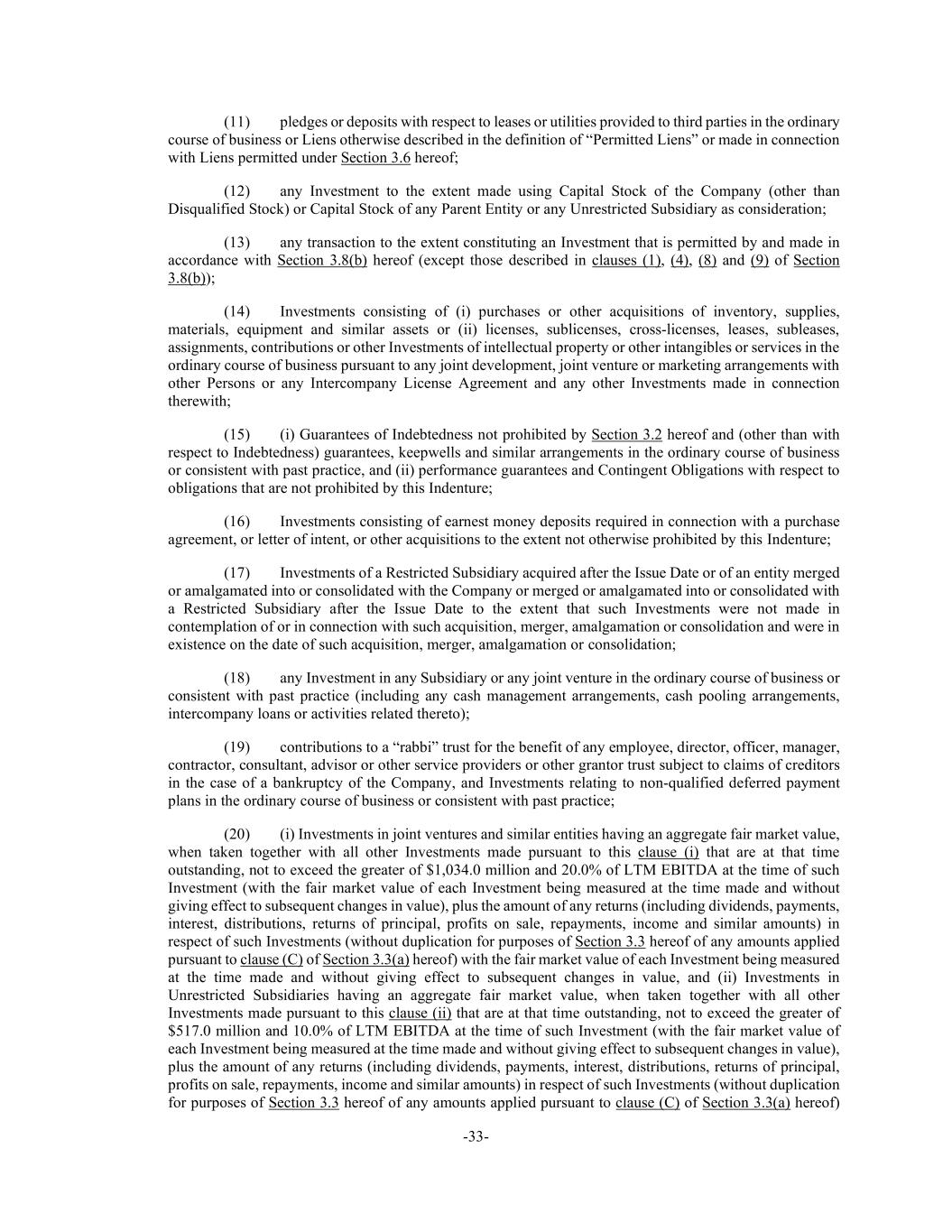 -33- (11) pledges or deposits with respect to leases or utilities provided to third parties in the ordinary course of business or Liens otherwise described in the definition of “Permitted Liens” or made in connection with Liens permitted under Section 3.6 hereof; (12) any Investment to the extent made using Capital Stock of the Company (other than Disqualified Stock) or Capital Stock of any Parent Entity or any Unrestricted Subsidiary as consideration; (13) any transaction to the extent constituting an Investment that is permitted by and made in accordance with Section 3.8(b) hereof (except those described in clauses (1), (4), (8) and (9) of Section 3.8(b)); (14) Investments consisting of (i) purchases or other acquisitions of inventory, supplies, materials, equipment and similar assets or (ii) licenses, sublicenses, cross-licenses, leases, subleases, assignments, contributions or other Investments of intellectual property or other intangibles or services in the ordinary course of business pursuant to any joint development, joint venture or marketing arrangements with other Persons or any Intercompany License Agreement and any other Investments made in connection therewith; (15) (i) Guarantees of Indebtedness not prohibited by Section 3.2 hereof and (other than with respect to Indebtedness) guarantees, keepwells and similar arrangements in the ordinary course of business or consistent with past practice, and (ii) performance guarantees and Contingent Obligations with respect to obligations that are not prohibited by this Indenture; (16) Investments consisting of earnest money deposits required in connection with a purchase agreement, or letter of intent, or other acquisitions to the extent not otherwise prohibited by this Indenture; (17) Investments of a Restricted Subsidiary acquired after the Issue Date or of an entity merged or amalgamated into or consolidated with the Company or merged or amalgamated into or consolidated with a Restricted Subsidiary after the Issue Date to the extent that such Investments were not made in contemplation of or in connection with such acquisition, merger, amalgamation or consolidation and were in existence on the date of such acquisition, merger, amalgamation or consolidation; (18) any Investment in any Subsidiary or any joint venture in the ordinary course of business or consistent with past practice (including any cash management arrangements, cash pooling arrangements, intercompany loans or activities related thereto); (19) contributions to a “rabbi” trust for the benefit of any employee, director, officer, manager, contractor, consultant, advisor or other service providers or other grantor trust subject to claims of creditors in the case of a bankruptcy of the Company, and Investments relating to non-qualified deferred payment plans in the ordinary course of business or consistent with past practice; (20) (i) Investments in joint ventures and similar entities having an aggregate fair market value, when taken together with all other Investments made pursuant to this clause (i) that are at that time outstanding, not to exceed the greater of $1,034.0 million and 20.0% of LTM EBITDA at the time of such Investment (with the fair market value of each Investment being measured at the time made and without giving effect to subsequent changes in value), plus the amount of any returns (including dividends, payments, interest, distributions, returns of principal, profits on sale, repayments, income and similar amounts) in respect of such Investments (without duplication for purposes of Section 3.3 hereof of any amounts applied pursuant to clause (C) of Section 3.3(a) hereof) with the fair market value of each Investment being measured at the time made and without giving effect to subsequent changes in value, and (ii) Investments in Unrestricted Subsidiaries having an aggregate fair market value, when taken together with all other Investments made pursuant to this clause (ii) that are at that time outstanding, not to exceed the greater of $517.0 million and 10.0% of LTM EBITDA at the time of such Investment (with the fair market value of each Investment being measured at the time made and without giving effect to subsequent changes in value), plus the amount of any returns (including dividends, payments, interest, distributions, returns of principal, profits on sale, repayments, income and similar amounts) in respect of such Investments (without duplication for purposes of Section 3.3 hereof of any amounts applied pursuant to clause (C) of Section 3.3(a) hereof)