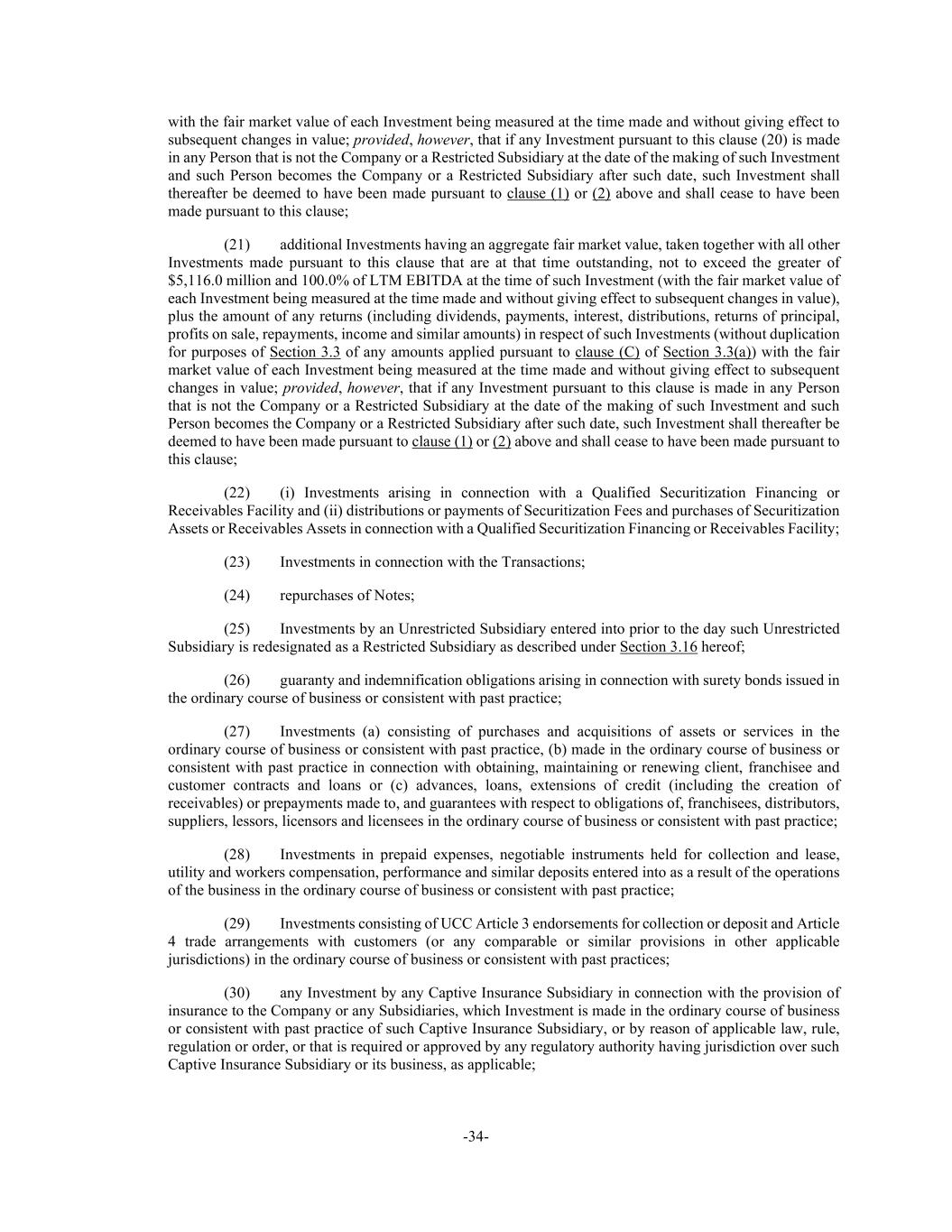 -34- with the fair market value of each Investment being measured at the time made and without giving effect to subsequent changes in value; provided, however, that if any Investment pursuant to this clause (20) is made in any Person that is not the Company or a Restricted Subsidiary at the date of the making of such Investment and such Person becomes the Company or a Restricted Subsidiary after such date, such Investment shall thereafter be deemed to have been made pursuant to clause (1) or (2) above and shall cease to have been made pursuant to this clause; (21) additional Investments having an aggregate fair market value, taken together with all other Investments made pursuant to this clause that are at that time outstanding, not to exceed the greater of $5,116.0 million and 100.0% of LTM EBITDA at the time of such Investment (with the fair market value of each Investment being measured at the time made and without giving effect to subsequent changes in value), plus the amount of any returns (including dividends, payments, interest, distributions, returns of principal, profits on sale, repayments, income and similar amounts) in respect of such Investments (without duplication for purposes of Section 3.3 of any amounts applied pursuant to clause (C) of Section 3.3(a)) with the fair market value of each Investment being measured at the time made and without giving effect to subsequent changes in value; provided, however, that if any Investment pursuant to this clause is made in any Person that is not the Company or a Restricted Subsidiary at the date of the making of such Investment and such Person becomes the Company or a Restricted Subsidiary after such date, such Investment shall thereafter be deemed to have been made pursuant to clause (1) or (2) above and shall cease to have been made pursuant to this clause; (22) (i) Investments arising in connection with a Qualified Securitization Financing or Receivables Facility and (ii) distributions or payments of Securitization Fees and purchases of Securitization Assets or Receivables Assets in connection with a Qualified Securitization Financing or Receivables Facility; (23) Investments in connection with the Transactions; (24) repurchases of Notes; (25) Investments by an Unrestricted Subsidiary entered into prior to the day such Unrestricted Subsidiary is redesignated as a Restricted Subsidiary as described under Section 3.16 hereof; (26) guaranty and indemnification obligations arising in connection with surety bonds issued in the ordinary course of business or consistent with past practice; (27) Investments (a) consisting of purchases and acquisitions of assets or services in the ordinary course of business or consistent with past practice, (b) made in the ordinary course of business or consistent with past practice in connection with obtaining, maintaining or renewing client, franchisee and customer contracts and loans or (c) advances, loans, extensions of credit (including the creation of receivables) or prepayments made to, and guarantees with respect to obligations of, franchisees, distributors, suppliers, lessors, licensors and licensees in the ordinary course of business or consistent with past practice; (28) Investments in prepaid expenses, negotiable instruments held for collection and lease, utility and workers compensation, performance and similar deposits entered into as a result of the operations of the business in the ordinary course of business or consistent with past practice; (29) Investments consisting of UCC Article 3 endorsements for collection or deposit and Article 4 trade arrangements with customers (or any comparable or similar provisions in other applicable jurisdictions) in the ordinary course of business or consistent with past practices; (30) any Investment by any Captive Insurance Subsidiary in connection with the provision of insurance to the Company or any Subsidiaries, which Investment is made in the ordinary course of business or consistent with past practice of such Captive Insurance Subsidiary, or by reason of applicable law, rule, regulation or order, or that is required or approved by any regulatory authority having jurisdiction over such Captive Insurance Subsidiary or its business, as applicable;