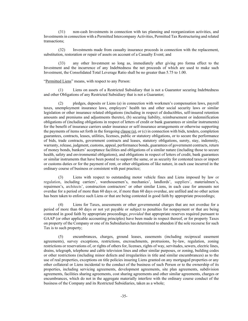 -35- (31) non-cash Investments in connection with tax planning and reorganization activities, and Investments in connection with a Permitted Intercompany Activities, Permitted Tax Restructuring and related transactions; (32) Investments made from casualty insurance proceeds in connection with the replacement, substitution, restoration or repair of assets on account of a Casualty Event; and (33) any other Investment so long as, immediately after giving pro forma effect to the Investment and the incurrence of any Indebtedness the net proceeds of which are used to make such Investment, the Consolidated Total Leverage Ratio shall be no greater than 5.75 to 1.00. “Permitted Liens” means, with respect to any Person: (1) Liens on assets of a Restricted Subsidiary that is not a Guarantor securing Indebtedness and other Obligations of any Restricted Subsidiary that is not a Guarantor; (2) pledges, deposits or Liens (a) in connection with workmen’s compensation laws, payroll taxes, unemployment insurance laws, employers’ health tax and other social security laws or similar legislation or other insurance related obligations (including in respect of deductibles, self-insured retention amounts and premiums and adjustments thereto), (b) securing liability, reimbursement or indemnification obligations of (including obligations in respect of letters of credit or bank guarantees or similar instruments) for the benefit of insurance carriers under insurance or self-insurance arrangements or otherwise supporting the payments of items set forth in the foregoing clause (a), or (c) in connection with bids, tenders, completion guarantees, contracts, leases, utilities, licenses, public or statutory obligations, or to secure the performance of bids, trade contracts, government contracts and leases, statutory obligations, surety, stay, indemnity, warranty, release, judgment, customs, appeal, performance bonds, guarantees of government contracts, return of money bonds, bankers’ acceptance facilities and obligations of a similar nature (including those to secure health, safety and environmental obligations), and obligations in respect of letters of credit, bank guarantees or similar instruments that have been posted to support the same, or as security for contested taxes or import or customs duties or for the payment of rent, or other obligations of like nature, in each case incurred in the ordinary course of business or consistent with past practice; (3) Liens with respect to outstanding motor vehicle fines and Liens imposed by law or regulation, including carriers’, warehousemen’s, mechanics’, landlords’, suppliers’, materialmen’s, repairmen’s, architects’, construction contractors’ or other similar Liens, in each case for amounts not overdue for a period of more than 60 days or, if more than 60 days overdue, are unfiled and no other action has been taken to enforce such Liens or that are being contested in good faith by appropriate proceedings; (4) Liens for Taxes, assessments or other governmental charges that are not overdue for a period of more than 60 days or not yet payable or subject to penalties for nonpayment or that are being contested in good faith by appropriate proceedings; provided that appropriate reserves required pursuant to GAAP (or other applicable accounting principles) have been made in respect thereof, or for property Taxes on property of the Company or one of its Subsidiaries has determined to abandon if the sole recourse for such Tax is to such property; (5) encumbrances, charges, ground leases, easements (including reciprocal easement agreements), survey exceptions, restrictions, encroachments, protrusions, by-law, regulation, zoning restrictions or reservations of, or rights of others for, licenses, rights of way, servitudes, sewers, electric lines, drains, telegraph, telephone and cable television lines and other similar purposes, or zoning, building codes or other restrictions (including minor defects and irregularities in title and similar encumbrances) as to the use of real properties, exceptions on title policies insuring Liens granted on any mortgaged properties or any other collateral or Liens incidental to the conduct of the business of such Person or to the ownership of its properties, including servicing agreements, development agreements, site plan agreements, subdivision agreements, facilities sharing agreements, cost sharing agreements and other similar agreements, charges or encumbrances, which do not in the aggregate materially interfere with the ordinary course conduct of the business of the Company and its Restricted Subsidiaries, taken as a whole;