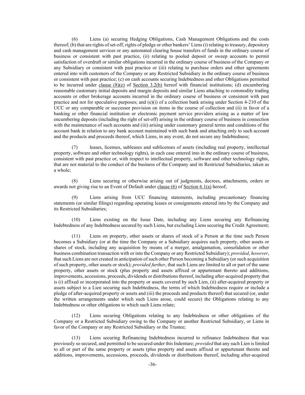 -36- (6) Liens (a) securing Hedging Obligations, Cash Management Obligations and the costs thereof; (b) that are rights of set-off, rights of pledge or other bankers’ Liens (i) relating to treasury, depository and cash management services or any automated clearing house transfers of funds in the ordinary course of business or consistent with past practice, (ii) relating to pooled deposit or sweep accounts to permit satisfaction of overdraft or similar obligations incurred in the ordinary course of business of the Company or any Subsidiary or consistent with past practice or (iii) relating to purchase orders and other agreements entered into with customers of the Company or any Restricted Subsidiary in the ordinary course of business or consistent with past practice; (c) on cash accounts securing Indebtedness and other Obligations permitted to be incurred under clause (8)(e) of Section 3.2(b) hereof with financial institutions; (d) encumbering reasonable customary initial deposits and margin deposits and similar Liens attaching to commodity trading accounts or other brokerage accounts incurred in the ordinary course of business or consistent with past practice and not for speculative purposes; and (e)(i) of a collection bank arising under Section 4-210 of the UCC or any comparable or successor provision on items in the course of collection and (ii) in favor of a banking or other financial institution or electronic payment service providers arising as a matter of law encumbering deposits (including the right of set-off) arising in the ordinary course of business in connection with the maintenance of such accounts and (iii) arising under customary general terms and conditions of the account bank in relation to any bank account maintained with such bank and attaching only to such account and the products and proceeds thereof, which Liens, in any event, do not secure any Indebtedness; (7) leases, licenses, subleases and sublicenses of assets (including real property, intellectual property, software and other technology rights), in each case entered into in the ordinary course of business, consistent with past practice or, with respect to intellectual property, software and other technology rights, that are not material to the conduct of the business of the Company and its Restricted Subsidiaries, taken as a whole; (8) Liens securing or otherwise arising out of judgments, decrees, attachments, orders or awards not giving rise to an Event of Default under clause (6) of Section 6.1(a) hereof; (9) Liens arising from UCC financing statements, including precautionary financing statements (or similar filings) regarding operating leases or consignments entered into by the Company and its Restricted Subsidiaries; (10) Liens existing on the Issue Date, including any Liens securing any Refinancing Indebtedness of any Indebtedness secured by such Liens, but excluding Liens securing the Credit Agreement; (11) Liens on property, other assets or shares of stock of a Person at the time such Person becomes a Subsidiary (or at the time the Company or a Subsidiary acquires such property, other assets or shares of stock, including any acquisition by means of a merger, amalgamation, consolidation or other business combination transaction with or into the Company or any Restricted Subsidiary); provided, however, that such Liens are not created in anticipation of such other Person becoming a Subsidiary (or such acquisition of such property, other assets or stock); provided further, that such Liens are limited to all or part of the same property, other assets or stock (plus property and assets affixed or appurtenant thereto and additions, improvements, accessions, proceeds, dividends or distributions thereof, including after-acquired property that is (i) affixed or incorporated into the property or assets covered by such Lien, (ii) after-acquired property or assets subject to a Lien securing such Indebtedness, the terms of which Indebtedness require or include a pledge of after-acquired property or assets and (iii) the proceeds and products thereof) that secured (or, under the written arrangements under which such Liens arose, could secure) the Obligations relating to any Indebtedness or other obligations to which such Liens relate; (12) Liens securing Obligations relating to any Indebtedness or other obligations of the Company or a Restricted Subsidiary owing to the Company or another Restricted Subsidiary, or Liens in favor of the Company or any Restricted Subsidiary or the Trustee; (13) Liens securing Refinancing Indebtedness incurred to refinance Indebtedness that was previously so secured, and permitted to be secured under this Indenture; provided that any such Lien is limited to all or part of the same property or assets (plus property and assets affixed or appurtenant thereto and additions, improvements, accessions, proceeds, dividends or distributions thereof, including after-acquired