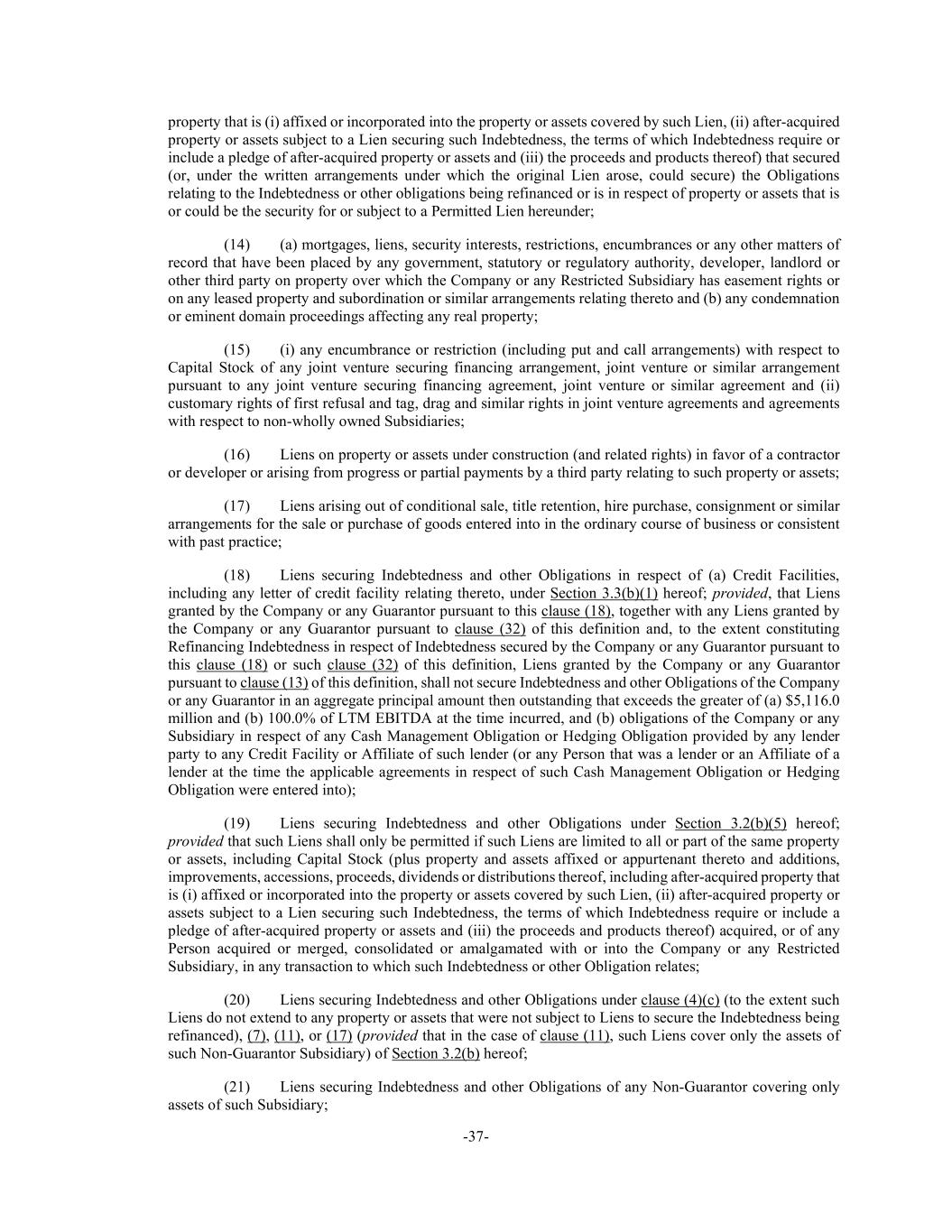 -37- property that is (i) affixed or incorporated into the property or assets covered by such Lien, (ii) after-acquired property or assets subject to a Lien securing such Indebtedness, the terms of which Indebtedness require or include a pledge of after-acquired property or assets and (iii) the proceeds and products thereof) that secured (or, under the written arrangements under which the original Lien arose, could secure) the Obligations relating to the Indebtedness or other obligations being refinanced or is in respect of property or assets that is or could be the security for or subject to a Permitted Lien hereunder; (14) (a) mortgages, liens, security interests, restrictions, encumbrances or any other matters of record that have been placed by any government, statutory or regulatory authority, developer, landlord or other third party on property over which the Company or any Restricted Subsidiary has easement rights or on any leased property and subordination or similar arrangements relating thereto and (b) any condemnation or eminent domain proceedings affecting any real property; (15) (i) any encumbrance or restriction (including put and call arrangements) with respect to Capital Stock of any joint venture securing financing arrangement, joint venture or similar arrangement pursuant to any joint venture securing financing agreement, joint venture or similar agreement and (ii) customary rights of first refusal and tag, drag and similar rights in joint venture agreements and agreements with respect to non-wholly owned Subsidiaries; (16) Liens on property or assets under construction (and related rights) in favor of a contractor or developer or arising from progress or partial payments by a third party relating to such property or assets; (17) Liens arising out of conditional sale, title retention, hire purchase, consignment or similar arrangements for the sale or purchase of goods entered into in the ordinary course of business or consistent with past practice; (18) Liens securing Indebtedness and other Obligations in respect of (a) Credit Facilities, including any letter of credit facility relating thereto, under Section 3.3(b)(1) hereof; provided, that Liens granted by the Company or any Guarantor pursuant to this clause (18), together with any Liens granted by the Company or any Guarantor pursuant to clause (32) of this definition and, to the extent constituting Refinancing Indebtedness in respect of Indebtedness secured by the Company or any Guarantor pursuant to this clause (18) or such clause (32) of this definition, Liens granted by the Company or any Guarantor pursuant to clause (13) of this definition, shall not secure Indebtedness and other Obligations of the Company or any Guarantor in an aggregate principal amount then outstanding that exceeds the greater of (a) $5,116.0 million and (b) 100.0% of LTM EBITDA at the time incurred, and (b) obligations of the Company or any Subsidiary in respect of any Cash Management Obligation or Hedging Obligation provided by any lender party to any Credit Facility or Affiliate of such lender (or any Person that was a lender or an Affiliate of a lender at the time the applicable agreements in respect of such Cash Management Obligation or Hedging Obligation were entered into); (19) Liens securing Indebtedness and other Obligations under Section 3.2(b)(5) hereof; provided that such Liens shall only be permitted if such Liens are limited to all or part of the same property or assets, including Capital Stock (plus property and assets affixed or appurtenant thereto and additions, improvements, accessions, proceeds, dividends or distributions thereof, including after-acquired property that is (i) affixed or incorporated into the property or assets covered by such Lien, (ii) after-acquired property or assets subject to a Lien securing such Indebtedness, the terms of which Indebtedness require or include a pledge of after-acquired property or assets and (iii) the proceeds and products thereof) acquired, or of any Person acquired or merged, consolidated or amalgamated with or into the Company or any Restricted Subsidiary, in any transaction to which such Indebtedness or other Obligation relates; (20) Liens securing Indebtedness and other Obligations under clause (4)(c) (to the extent such Liens do not extend to any property or assets that were not subject to Liens to secure the Indebtedness being refinanced), (7), (11), or (17) (provided that in the case of clause (11), such Liens cover only the assets of such Non-Guarantor Subsidiary) of Section 3.2(b) hereof; (21) Liens securing Indebtedness and other Obligations of any Non-Guarantor covering only assets of such Subsidiary;