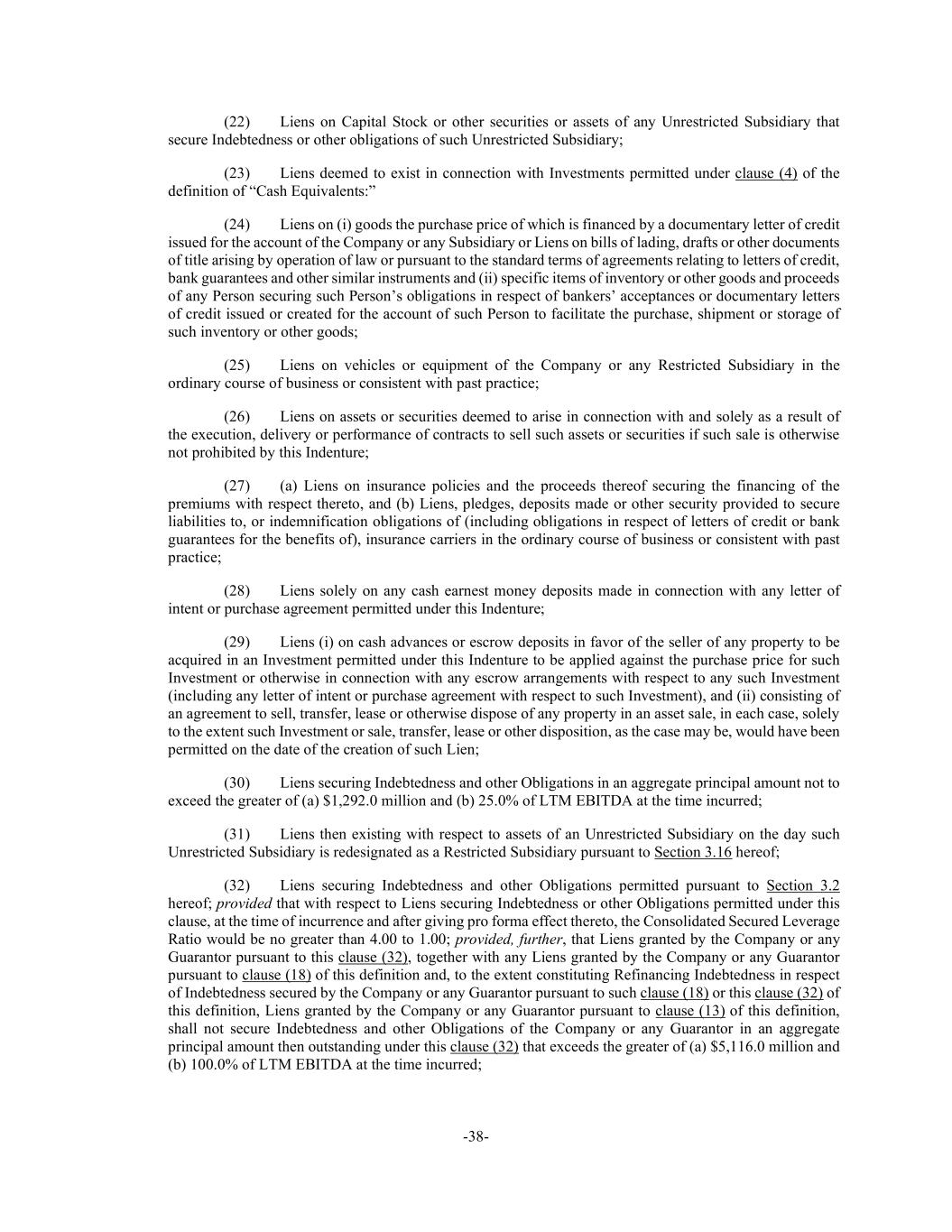 -38- (22) Liens on Capital Stock or other securities or assets of any Unrestricted Subsidiary that secure Indebtedness or other obligations of such Unrestricted Subsidiary; (23) Liens deemed to exist in connection with Investments permitted under clause (4) of the definition of “Cash Equivalents:” (24) Liens on (i) goods the purchase price of which is financed by a documentary letter of credit issued for the account of the Company or any Subsidiary or Liens on bills of lading, drafts or other documents of title arising by operation of law or pursuant to the standard terms of agreements relating to letters of credit, bank guarantees and other similar instruments and (ii) specific items of inventory or other goods and proceeds of any Person securing such Person’s obligations in respect of bankers’ acceptances or documentary letters of credit issued or created for the account of such Person to facilitate the purchase, shipment or storage of such inventory or other goods; (25) Liens on vehicles or equipment of the Company or any Restricted Subsidiary in the ordinary course of business or consistent with past practice; (26) Liens on assets or securities deemed to arise in connection with and solely as a result of the execution, delivery or performance of contracts to sell such assets or securities if such sale is otherwise not prohibited by this Indenture; (27) (a) Liens on insurance policies and the proceeds thereof securing the financing of the premiums with respect thereto, and (b) Liens, pledges, deposits made or other security provided to secure liabilities to, or indemnification obligations of (including obligations in respect of letters of credit or bank guarantees for the benefits of), insurance carriers in the ordinary course of business or consistent with past practice; (28) Liens solely on any cash earnest money deposits made in connection with any letter of intent or purchase agreement permitted under this Indenture; (29) Liens (i) on cash advances or escrow deposits in favor of the seller of any property to be acquired in an Investment permitted under this Indenture to be applied against the purchase price for such Investment or otherwise in connection with any escrow arrangements with respect to any such Investment (including any letter of intent or purchase agreement with respect to such Investment), and (ii) consisting of an agreement to sell, transfer, lease or otherwise dispose of any property in an asset sale, in each case, solely to the extent such Investment or sale, transfer, lease or other disposition, as the case may be, would have been permitted on the date of the creation of such Lien; (30) Liens securing Indebtedness and other Obligations in an aggregate principal amount not to exceed the greater of (a) $1,292.0 million and (b) 25.0% of LTM EBITDA at the time incurred; (31) Liens then existing with respect to assets of an Unrestricted Subsidiary on the day such Unrestricted Subsidiary is redesignated as a Restricted Subsidiary pursuant to Section 3.16 hereof; (32) Liens securing Indebtedness and other Obligations permitted pursuant to Section 3.2 hereof; provided that with respect to Liens securing Indebtedness or other Obligations permitted under this clause, at the time of incurrence and after giving pro forma effect thereto, the Consolidated Secured Leverage Ratio would be no greater than 4.00 to 1.00; provided, further, that Liens granted by the Company or any Guarantor pursuant to this clause (32), together with any Liens granted by the Company or any Guarantor pursuant to clause (18) of this definition and, to the extent constituting Refinancing Indebtedness in respect of Indebtedness secured by the Company or any Guarantor pursuant to such clause (18) or this clause (32) of this definition, Liens granted by the Company or any Guarantor pursuant to clause (13) of this definition, shall not secure Indebtedness and other Obligations of the Company or any Guarantor in an aggregate principal amount then outstanding under this clause (32) that exceeds the greater of (a) $5,116.0 million and (b) 100.0% of LTM EBITDA at the time incurred;