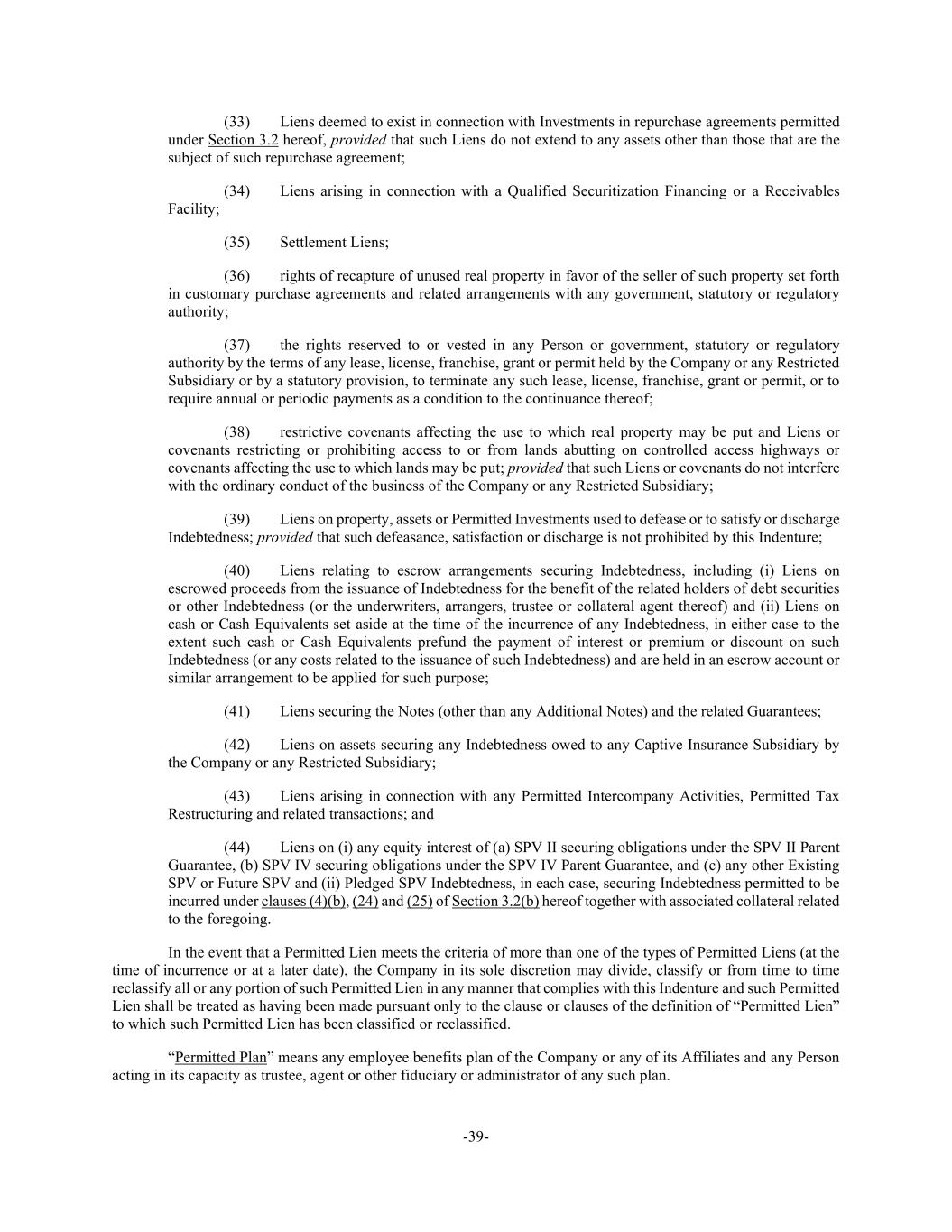 -39- (33) Liens deemed to exist in connection with Investments in repurchase agreements permitted under Section 3.2 hereof, provided that such Liens do not extend to any assets other than those that are the subject of such repurchase agreement; (34) Liens arising in connection with a Qualified Securitization Financing or a Receivables Facility; (35) Settlement Liens; (36) rights of recapture of unused real property in favor of the seller of such property set forth in customary purchase agreements and related arrangements with any government, statutory or regulatory authority; (37) the rights reserved to or vested in any Person or government, statutory or regulatory authority by the terms of any lease, license, franchise, grant or permit held by the Company or any Restricted Subsidiary or by a statutory provision, to terminate any such lease, license, franchise, grant or permit, or to require annual or periodic payments as a condition to the continuance thereof; (38) restrictive covenants affecting the use to which real property may be put and Liens or covenants restricting or prohibiting access to or from lands abutting on controlled access highways or covenants affecting the use to which lands may be put; provided that such Liens or covenants do not interfere with the ordinary conduct of the business of the Company or any Restricted Subsidiary; (39) Liens on property, assets or Permitted Investments used to defease or to satisfy or discharge Indebtedness; provided that such defeasance, satisfaction or discharge is not prohibited by this Indenture; (40) Liens relating to escrow arrangements securing Indebtedness, including (i) Liens on escrowed proceeds from the issuance of Indebtedness for the benefit of the related holders of debt securities or other Indebtedness (or the underwriters, arrangers, trustee or collateral agent thereof) and (ii) Liens on cash or Cash Equivalents set aside at the time of the incurrence of any Indebtedness, in either case to the extent such cash or Cash Equivalents prefund the payment of interest or premium or discount on such Indebtedness (or any costs related to the issuance of such Indebtedness) and are held in an escrow account or similar arrangement to be applied for such purpose; (41) Liens securing the Notes (other than any Additional Notes) and the related Guarantees; (42) Liens on assets securing any Indebtedness owed to any Captive Insurance Subsidiary by the Company or any Restricted Subsidiary; (43) Liens arising in connection with any Permitted Intercompany Activities, Permitted Tax Restructuring and related transactions; and (44) Liens on (i) any equity interest of (a) SPV II securing obligations under the SPV II Parent Guarantee, (b) SPV IV securing obligations under the SPV IV Parent Guarantee, and (c) any other Existing SPV or Future SPV and (ii) Pledged SPV Indebtedness, in each case, securing Indebtedness permitted to be incurred under clauses (4)(b), (24) and (25) of Section 3.2(b) hereof together with associated collateral related to the foregoing. In the event that a Permitted Lien meets the criteria of more than one of the types of Permitted Liens (at the time of incurrence or at a later date), the Company in its sole discretion may divide, classify or from time to time reclassify all or any portion of such Permitted Lien in any manner that complies with this Indenture and such Permitted Lien shall be treated as having been made pursuant only to the clause or clauses of the definition of “Permitted Lien” to which such Permitted Lien has been classified or reclassified. “Permitted Plan” means any employee benefits plan of the Company or any of its Affiliates and any Person acting in its capacity as trustee, agent or other fiduciary or administrator of any such plan.