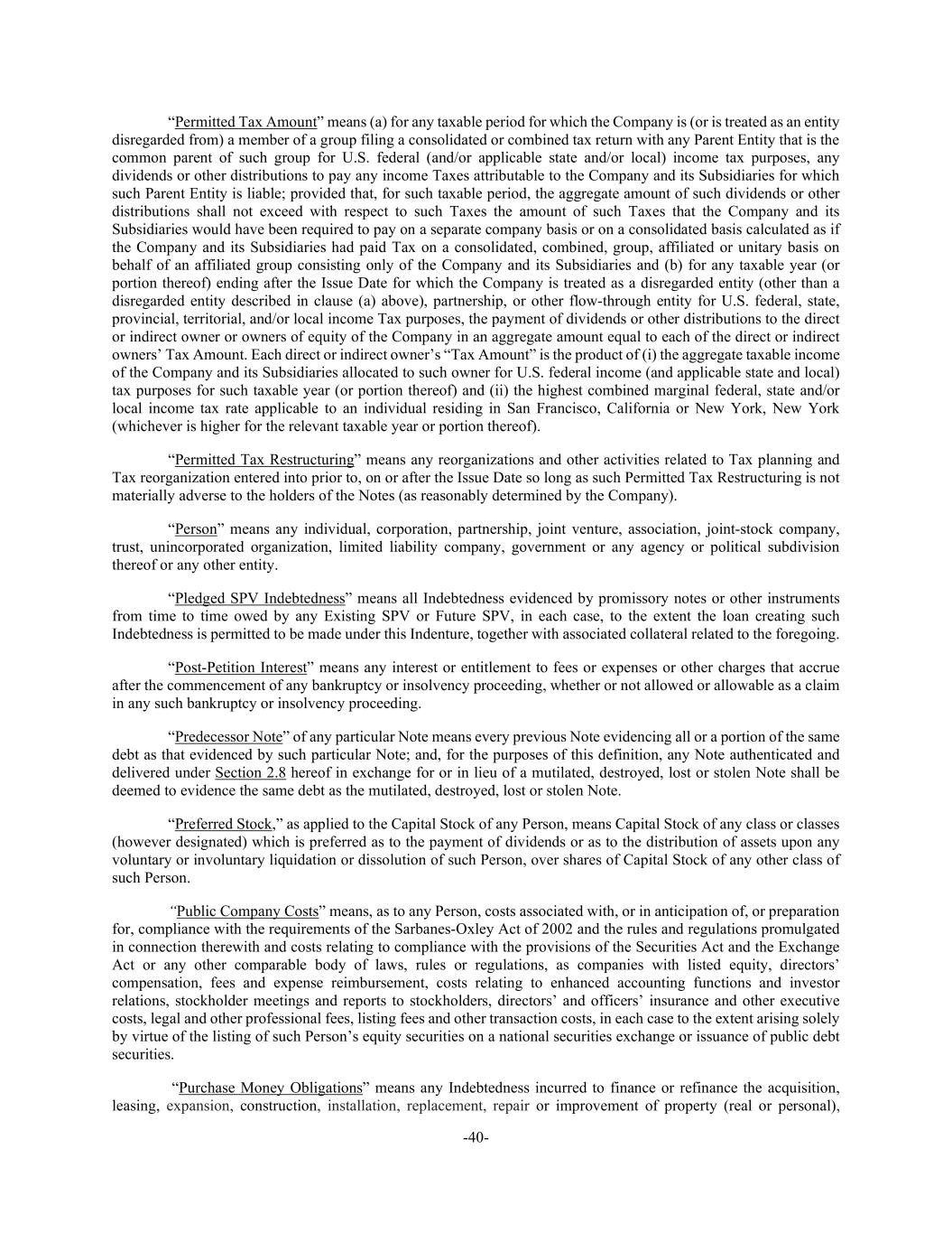 -40- “Permitted Tax Amount” means (a) for any taxable period for which the Company is (or is treated as an entity disregarded from) a member of a group filing a consolidated or combined tax return with any Parent Entity that is the common parent of such group for U.S. federal (and/or applicable state and/or local) income tax purposes, any dividends or other distributions to pay any income Taxes attributable to the Company and its Subsidiaries for which such Parent Entity is liable; provided that, for such taxable period, the aggregate amount of such dividends or other distributions shall not exceed with respect to such Taxes the amount of such Taxes that the Company and its Subsidiaries would have been required to pay on a separate company basis or on a consolidated basis calculated as if the Company and its Subsidiaries had paid Tax on a consolidated, combined, group, affiliated or unitary basis on behalf of an affiliated group consisting only of the Company and its Subsidiaries and (b) for any taxable year (or portion thereof) ending after the Issue Date for which the Company is treated as a disregarded entity (other than a disregarded entity described in clause (a) above), partnership, or other flow-through entity for U.S. federal, state, provincial, territorial, and/or local income Tax purposes, the payment of dividends or other distributions to the direct or indirect owner or owners of equity of the Company in an aggregate amount equal to each of the direct or indirect owners’ Tax Amount. Each direct or indirect owner’s “Tax Amount” is the product of (i) the aggregate taxable income of the Company and its Subsidiaries allocated to such owner for U.S. federal income (and applicable state and local) tax purposes for such taxable year (or portion thereof) and (ii) the highest combined marginal federal, state and/or local income tax rate applicable to an individual residing in San Francisco, California or New York, New York (whichever is higher for the relevant taxable year or portion thereof). “Permitted Tax Restructuring” means any reorganizations and other activities related to Tax planning and Tax reorganization entered into prior to, on or after the Issue Date so long as such Permitted Tax Restructuring is not materially adverse to the holders of the Notes (as reasonably determined by the Company). “Person” means any individual, corporation, partnership, joint venture, association, joint-stock company, trust, unincorporated organization, limited liability company, government or any agency or political subdivision thereof or any other entity. “Pledged SPV Indebtedness” means all Indebtedness evidenced by promissory notes or other instruments from time to time owed by any Existing SPV or Future SPV, in each case, to the extent the loan creating such Indebtedness is permitted to be made under this Indenture, together with associated collateral related to the foregoing. “Post-Petition Interest” means any interest or entitlement to fees or expenses or other charges that accrue after the commencement of any bankruptcy or insolvency proceeding, whether or not allowed or allowable as a claim in any such bankruptcy or insolvency proceeding. “Predecessor Note” of any particular Note means every previous Note evidencing all or a portion of the same debt as that evidenced by such particular Note; and, for the purposes of this definition, any Note authenticated and delivered under Section 2.8 hereof in exchange for or in lieu of a mutilated, destroyed, lost or stolen Note shall be deemed to evidence the same debt as the mutilated, destroyed, lost or stolen Note. “Preferred Stock,” as applied to the Capital Stock of any Person, means Capital Stock of any class or classes (however designated) which is preferred as to the payment of dividends or as to the distribution of assets upon any voluntary or involuntary liquidation or dissolution of such Person, over shares of Capital Stock of any other class of such Person. “Public Company Costs” means, as to any Person, costs associated with, or in anticipation of, or preparation for, compliance with the requirements of the Sarbanes-Oxley Act of 2002 and the rules and regulations promulgated in connection therewith and costs relating to compliance with the provisions of the Securities Act and the Exchange Act or any other comparable body of laws, rules or regulations, as companies with listed equity, directors’ compensation, fees and expense reimbursement, costs relating to enhanced accounting functions and investor relations, stockholder meetings and reports to stockholders, directors’ and officers’ insurance and other executive costs, legal and other professional fees, listing fees and other transaction costs, in each case to the extent arising solely by virtue of the listing of such Person’s equity securities on a national securities exchange or issuance of public debt securities. “Purchase Money Obligations” means any Indebtedness incurred to finance or refinance the acquisition, leasing, expansion, construction, installation, replacement, repair or improvement of property (real or personal),