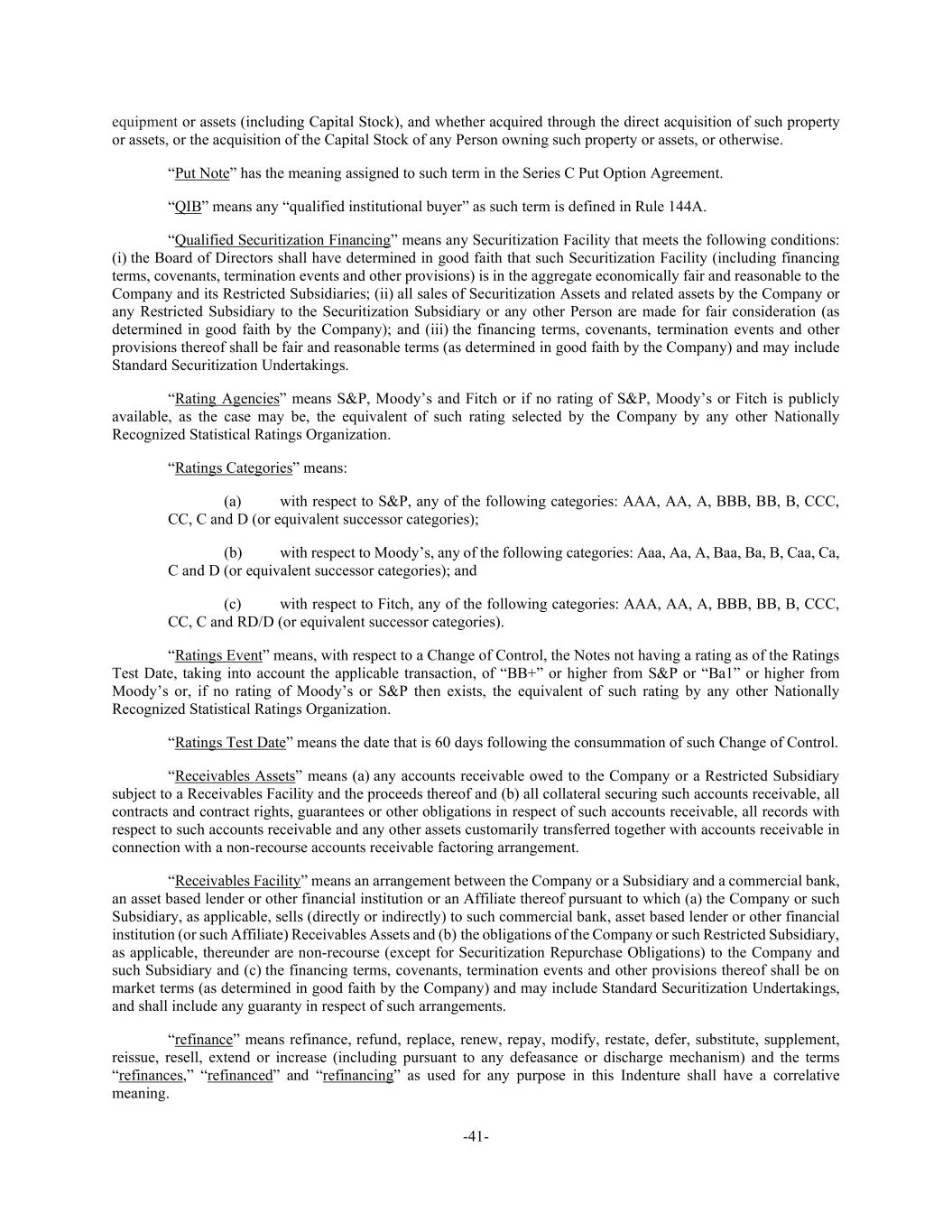 -41- equipment or assets (including Capital Stock), and whether acquired through the direct acquisition of such property or assets, or the acquisition of the Capital Stock of any Person owning such property or assets, or otherwise. “Put Note” has the meaning assigned to such term in the Series C Put Option Agreement. “QIB” means any “qualified institutional buyer” as such term is defined in Rule 144A. “Qualified Securitization Financing” means any Securitization Facility that meets the following conditions: (i) the Board of Directors shall have determined in good faith that such Securitization Facility (including financing terms, covenants, termination events and other provisions) is in the aggregate economically fair and reasonable to the Company and its Restricted Subsidiaries; (ii) all sales of Securitization Assets and related assets by the Company or any Restricted Subsidiary to the Securitization Subsidiary or any other Person are made for fair consideration (as determined in good faith by the Company); and (iii) the financing terms, covenants, termination events and other provisions thereof shall be fair and reasonable terms (as determined in good faith by the Company) and may include Standard Securitization Undertakings. “Rating Agencies” means S&P, Moody’s and Fitch or if no rating of S&P, Moody’s or Fitch is publicly available, as the case may be, the equivalent of such rating selected by the Company by any other Nationally Recognized Statistical Ratings Organization. “Ratings Categories” means: (a) with respect to S&P, any of the following categories: AAA, AA, A, BBB, BB, B, CCC, CC, C and D (or equivalent successor categories); (b) with respect to Moody’s, any of the following categories: Aaa, Aa, A, Baa, Ba, B, Caa, Ca, C and D (or equivalent successor categories); and (c) with respect to Fitch, any of the following categories: AAA, AA, A, BBB, BB, B, CCC, CC, C and RD/D (or equivalent successor categories). “Ratings Event” means, with respect to a Change of Control, the Notes not having a rating as of the Ratings Test Date, taking into account the applicable transaction, of “BB+” or higher from S&P or “Ba1” or higher from Moody’s or, if no rating of Moody’s or S&P then exists, the equivalent of such rating by any other Nationally Recognized Statistical Ratings Organization. “Ratings Test Date” means the date that is 60 days following the consummation of such Change of Control. “Receivables Assets” means (a) any accounts receivable owed to the Company or a Restricted Subsidiary subject to a Receivables Facility and the proceeds thereof and (b) all collateral securing such accounts receivable, all contracts and contract rights, guarantees or other obligations in respect of such accounts receivable, all records with respect to such accounts receivable and any other assets customarily transferred together with accounts receivable in connection with a non-recourse accounts receivable factoring arrangement. “Receivables Facility” means an arrangement between the Company or a Subsidiary and a commercial bank, an asset based lender or other financial institution or an Affiliate thereof pursuant to which (a) the Company or such Subsidiary, as applicable, sells (directly or indirectly) to such commercial bank, asset based lender or other financial institution (or such Affiliate) Receivables Assets and (b) the obligations of the Company or such Restricted Subsidiary, as applicable, thereunder are non-recourse (except for Securitization Repurchase Obligations) to the Company and such Subsidiary and (c) the financing terms, covenants, termination events and other provisions thereof shall be on market terms (as determined in good faith by the Company) and may include Standard Securitization Undertakings, and shall include any guaranty in respect of such arrangements. “refinance” means refinance, refund, replace, renew, repay, modify, restate, defer, substitute, supplement, reissue, resell, extend or increase (including pursuant to any defeasance or discharge mechanism) and the terms “refinances,” “refinanced” and “refinancing” as used for any purpose in this Indenture shall have a correlative meaning.