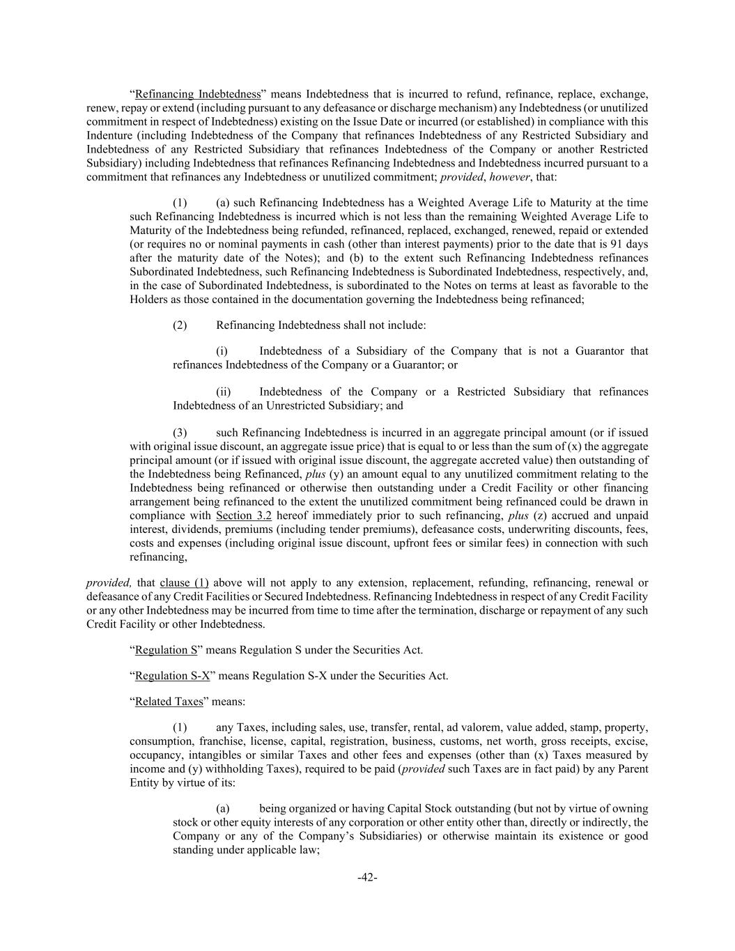 -42- “Refinancing Indebtedness” means Indebtedness that is incurred to refund, refinance, replace, exchange, renew, repay or extend (including pursuant to any defeasance or discharge mechanism) any Indebtedness (or unutilized commitment in respect of Indebtedness) existing on the Issue Date or incurred (or established) in compliance with this Indenture (including Indebtedness of the Company that refinances Indebtedness of any Restricted Subsidiary and Indebtedness of any Restricted Subsidiary that refinances Indebtedness of the Company or another Restricted Subsidiary) including Indebtedness that refinances Refinancing Indebtedness and Indebtedness incurred pursuant to a commitment that refinances any Indebtedness or unutilized commitment; provided, however, that: (1) (a) such Refinancing Indebtedness has a Weighted Average Life to Maturity at the time such Refinancing Indebtedness is incurred which is not less than the remaining Weighted Average Life to Maturity of the Indebtedness being refunded, refinanced, replaced, exchanged, renewed, repaid or extended (or requires no or nominal payments in cash (other than interest payments) prior to the date that is 91 days after the maturity date of the Notes); and (b) to the extent such Refinancing Indebtedness refinances Subordinated Indebtedness, such Refinancing Indebtedness is Subordinated Indebtedness, respectively, and, in the case of Subordinated Indebtedness, is subordinated to the Notes on terms at least as favorable to the Holders as those contained in the documentation governing the Indebtedness being refinanced; (2) Refinancing Indebtedness shall not include: (i) Indebtedness of a Subsidiary of the Company that is not a Guarantor that refinances Indebtedness of the Company or a Guarantor; or (ii) Indebtedness of the Company or a Restricted Subsidiary that refinances Indebtedness of an Unrestricted Subsidiary; and (3) such Refinancing Indebtedness is incurred in an aggregate principal amount (or if issued with original issue discount, an aggregate issue price) that is equal to or less than the sum of (x) the aggregate principal amount (or if issued with original issue discount, the aggregate accreted value) then outstanding of the Indebtedness being Refinanced, plus (y) an amount equal to any unutilized commitment relating to the Indebtedness being refinanced or otherwise then outstanding under a Credit Facility or other financing arrangement being refinanced to the extent the unutilized commitment being refinanced could be drawn in compliance with Section 3.2 hereof immediately prior to such refinancing, plus (z) accrued and unpaid interest, dividends, premiums (including tender premiums), defeasance costs, underwriting discounts, fees, costs and expenses (including original issue discount, upfront fees or similar fees) in connection with such refinancing, provided, that clause (1) above will not apply to any extension, replacement, refunding, refinancing, renewal or defeasance of any Credit Facilities or Secured Indebtedness. Refinancing Indebtedness in respect of any Credit Facility or any other Indebtedness may be incurred from time to time after the termination, discharge or repayment of any such Credit Facility or other Indebtedness. “Regulation S” means Regulation S under the Securities Act. “Regulation S-X” means Regulation S-X under the Securities Act. “Related Taxes” means: (1) any Taxes, including sales, use, transfer, rental, ad valorem, value added, stamp, property, consumption, franchise, license, capital, registration, business, customs, net worth, gross receipts, excise, occupancy, intangibles or similar Taxes and other fees and expenses (other than (x) Taxes measured by income and (y) withholding Taxes), required to be paid (provided such Taxes are in fact paid) by any Parent Entity by virtue of its: (a) being organized or having Capital Stock outstanding (but not by virtue of owning stock or other equity interests of any corporation or other entity other than, directly or indirectly, the Company or any of the Company’s Subsidiaries) or otherwise maintain its existence or good standing under applicable law;