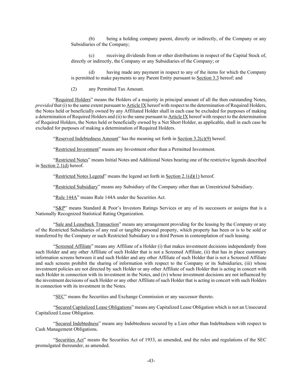 -43- (b) being a holding company parent, directly or indirectly, of the Company or any Subsidiaries of the Company; (c) receiving dividends from or other distributions in respect of the Capital Stock of, directly or indirectly, the Company or any Subsidiaries of the Company; or (d) having made any payment in respect to any of the items for which the Company is permitted to make payments to any Parent Entity pursuant to Section 3.3 hereof; and (2) any Permitted Tax Amount. “Required Holders” means the Holders of a majority in principal amount of all the then outstanding Notes, provided that (i) to the same extent pursuant to Article IX hereof with respect to the determination of Required Holders, the Notes held or beneficially owned by any Affiliated Holder shall in each case be excluded for purposes of making a determination of Required Holders and (ii) to the same pursuant to Article IX hereof with respect to the determination of Required Holders, the Notes held or beneficially owned by a Net Short Holder, as applicable, shall in each case be excluded for purposes of making a determination of Required Holders. “Reserved Indebtedness Amount” has the meaning set forth in Section 3.2(c)(9) hereof. “Restricted Investment” means any Investment other than a Permitted Investment. “Restricted Notes” means Initial Notes and Additional Notes bearing one of the restrictive legends described in Section 2.1(d) hereof. “Restricted Notes Legend” means the legend set forth in Section 2.1(d)(1) hereof. “Restricted Subsidiary” means any Subsidiary of the Company other than an Unrestricted Subsidiary. “Rule 144A” means Rule 144A under the Securities Act. “S&P” means Standard & Poor’s Investors Ratings Services or any of its successors or assigns that is a Nationally Recognized Statistical Rating Organization. “Sale and Leaseback Transaction” means any arrangement providing for the leasing by the Company or any of the Restricted Subsidiaries of any real or tangible personal property, which property has been or is to be sold or transferred by the Company or such Restricted Subsidiary to a third Person in contemplation of such leasing. “Screened Affiliate” means any Affiliate of a Holder (i) that makes investment decisions independently from such Holder and any other Affiliate of such Holder that is not a Screened Affiliate, (ii) that has in place customary information screens between it and such Holder and any other Affiliate of such Holder that is not a Screened Affiliate and such screens prohibit the sharing of information with respect to the Company or its Subsidiaries, (iii) whose investment policies are not directed by such Holder or any other Affiliate of such Holder that is acting in concert with such Holder in connection with its investment in the Notes, and (iv) whose investment decisions are not influenced by the investment decisions of such Holder or any other Affiliate of such Holder that is acting in concert with such Holders in connection with its investment in the Notes. “SEC” means the Securities and Exchange Commission or any successor thereto. “Secured Capitalized Lease Obligations” means any Capitalized Lease Obligation which is not an Unsecured Capitalized Lease Obligation. “Secured Indebtedness” means any Indebtedness secured by a Lien other than Indebtedness with respect to Cash Management Obligations. “Securities Act” means the Securities Act of 1933, as amended, and the rules and regulations of the SEC promulgated thereunder, as amended.