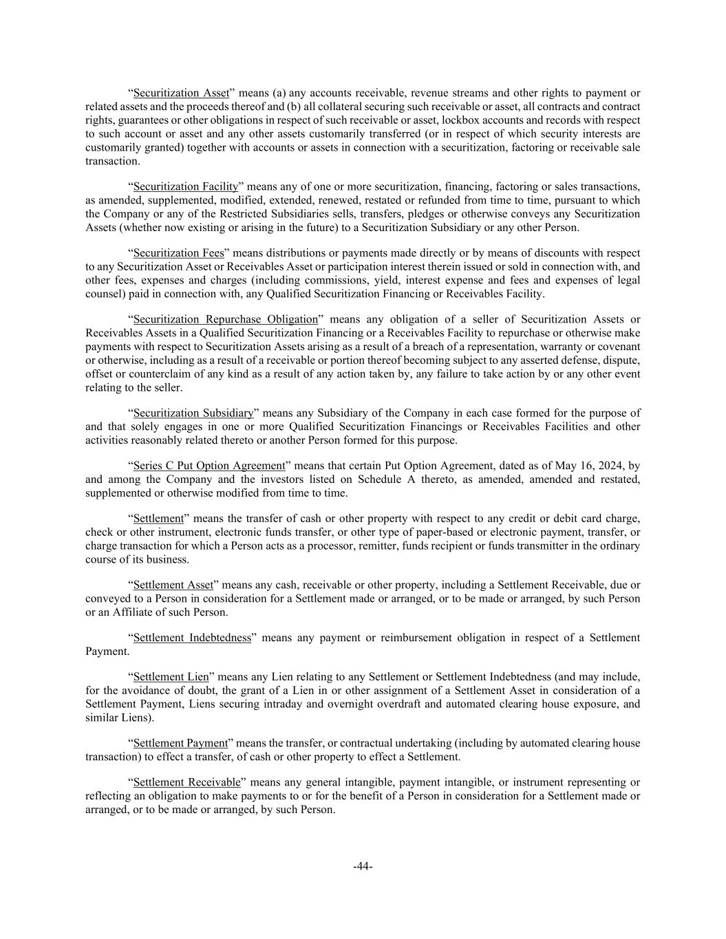 -44- “Securitization Asset” means (a) any accounts receivable, revenue streams and other rights to payment or related assets and the proceeds thereof and (b) all collateral securing such receivable or asset, all contracts and contract rights, guarantees or other obligations in respect of such receivable or asset, lockbox accounts and records with respect to such account or asset and any other assets customarily transferred (or in respect of which security interests are customarily granted) together with accounts or assets in connection with a securitization, factoring or receivable sale transaction. “Securitization Facility” means any of one or more securitization, financing, factoring or sales transactions, as amended, supplemented, modified, extended, renewed, restated or refunded from time to time, pursuant to which the Company or any of the Restricted Subsidiaries sells, transfers, pledges or otherwise conveys any Securitization Assets (whether now existing or arising in the future) to a Securitization Subsidiary or any other Person. “Securitization Fees” means distributions or payments made directly or by means of discounts with respect to any Securitization Asset or Receivables Asset or participation interest therein issued or sold in connection with, and other fees, expenses and charges (including commissions, yield, interest expense and fees and expenses of legal counsel) paid in connection with, any Qualified Securitization Financing or Receivables Facility. “Securitization Repurchase Obligation” means any obligation of a seller of Securitization Assets or Receivables Assets in a Qualified Securitization Financing or a Receivables Facility to repurchase or otherwise make payments with respect to Securitization Assets arising as a result of a breach of a representation, warranty or covenant or otherwise, including as a result of a receivable or portion thereof becoming subject to any asserted defense, dispute, offset or counterclaim of any kind as a result of any action taken by, any failure to take action by or any other event relating to the seller. “Securitization Subsidiary” means any Subsidiary of the Company in each case formed for the purpose of and that solely engages in one or more Qualified Securitization Financings or Receivables Facilities and other activities reasonably related thereto or another Person formed for this purpose. “Series C Put Option Agreement” means that certain Put Option Agreement, dated as of May 16, 2024, by and among the Company and the investors listed on Schedule A thereto, as amended, amended and restated, supplemented or otherwise modified from time to time. “Settlement” means the transfer of cash or other property with respect to any credit or debit card charge, check or other instrument, electronic funds transfer, or other type of paper-based or electronic payment, transfer, or charge transaction for which a Person acts as a processor, remitter, funds recipient or funds transmitter in the ordinary course of its business. “Settlement Asset” means any cash, receivable or other property, including a Settlement Receivable, due or conveyed to a Person in consideration for a Settlement made or arranged, or to be made or arranged, by such Person or an Affiliate of such Person. “Settlement Indebtedness” means any payment or reimbursement obligation in respect of a Settlement Payment. “Settlement Lien” means any Lien relating to any Settlement or Settlement Indebtedness (and may include, for the avoidance of doubt, the grant of a Lien in or other assignment of a Settlement Asset in consideration of a Settlement Payment, Liens securing intraday and overnight overdraft and automated clearing house exposure, and similar Liens). “Settlement Payment” means the transfer, or contractual undertaking (including by automated clearing house transaction) to effect a transfer, of cash or other property to effect a Settlement. “Settlement Receivable” means any general intangible, payment intangible, or instrument representing or reflecting an obligation to make payments to or for the benefit of a Person in consideration for a Settlement made or arranged, or to be made or arranged, by such Person.