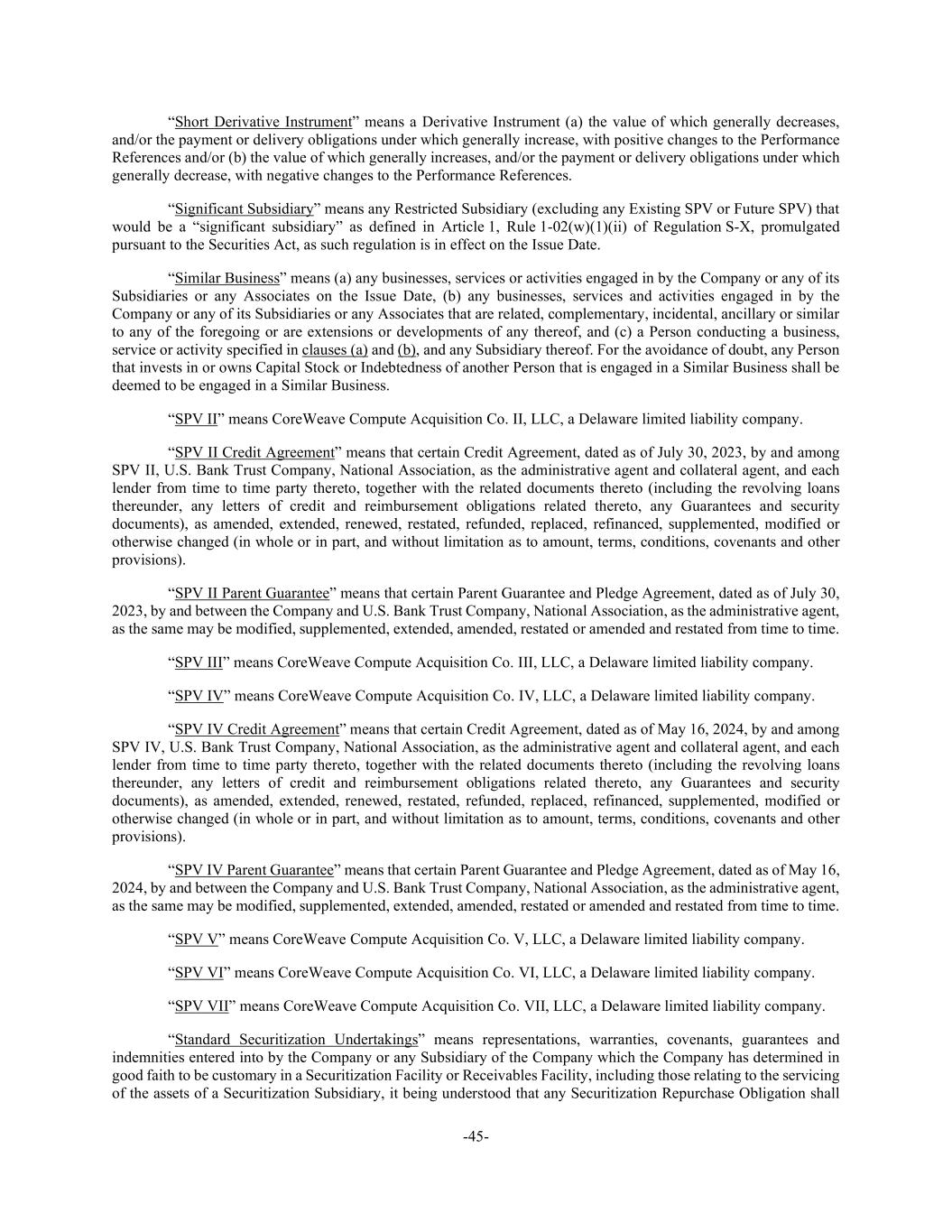 -45- “Short Derivative Instrument” means a Derivative Instrument (a) the value of which generally decreases, and/or the payment or delivery obligations under which generally increase, with positive changes to the Performance References and/or (b) the value of which generally increases, and/or the payment or delivery obligations under which generally decrease, with negative changes to the Performance References. “Significant Subsidiary” means any Restricted Subsidiary (excluding any Existing SPV or Future SPV) that would be a “significant subsidiary” as defined in Article 1, Rule 1-02(w)(1)(ii) of Regulation S-X, promulgated pursuant to the Securities Act, as such regulation is in effect on the Issue Date. “Similar Business” means (a) any businesses, services or activities engaged in by the Company or any of its Subsidiaries or any Associates on the Issue Date, (b) any businesses, services and activities engaged in by the Company or any of its Subsidiaries or any Associates that are related, complementary, incidental, ancillary or similar to any of the foregoing or are extensions or developments of any thereof, and (c) a Person conducting a business, service or activity specified in clauses (a) and (b), and any Subsidiary thereof. For the avoidance of doubt, any Person that invests in or owns Capital Stock or Indebtedness of another Person that is engaged in a Similar Business shall be deemed to be engaged in a Similar Business. “SPV II” means CoreWeave Compute Acquisition Co. II, LLC, a Delaware limited liability company. “SPV II Credit Agreement” means that certain Credit Agreement, dated as of July 30, 2023, by and among SPV II, U.S. Bank Trust Company, National Association, as the administrative agent and collateral agent, and each lender from time to time party thereto, together with the related documents thereto (including the revolving loans thereunder, any letters of credit and reimbursement obligations related thereto, any Guarantees and security documents), as amended, extended, renewed, restated, refunded, replaced, refinanced, supplemented, modified or otherwise changed (in whole or in part, and without limitation as to amount, terms, conditions, covenants and other provisions). “SPV II Parent Guarantee” means that certain Parent Guarantee and Pledge Agreement, dated as of July 30, 2023, by and between the Company and U.S. Bank Trust Company, National Association, as the administrative agent, as the same may be modified, supplemented, extended, amended, restated or amended and restated from time to time. “SPV III” means CoreWeave Compute Acquisition Co. III, LLC, a Delaware limited liability company. “SPV IV” means CoreWeave Compute Acquisition Co. IV, LLC, a Delaware limited liability company. “SPV IV Credit Agreement” means that certain Credit Agreement, dated as of May 16, 2024, by and among SPV IV, U.S. Bank Trust Company, National Association, as the administrative agent and collateral agent, and each lender from time to time party thereto, together with the related documents thereto (including the revolving loans thereunder, any letters of credit and reimbursement obligations related thereto, any Guarantees and security documents), as amended, extended, renewed, restated, refunded, replaced, refinanced, supplemented, modified or otherwise changed (in whole or in part, and without limitation as to amount, terms, conditions, covenants and other provisions). “SPV IV Parent Guarantee” means that certain Parent Guarantee and Pledge Agreement, dated as of May 16, 2024, by and between the Company and U.S. Bank Trust Company, National Association, as the administrative agent, as the same may be modified, supplemented, extended, amended, restated or amended and restated from time to time. “SPV V” means CoreWeave Compute Acquisition Co. V, LLC, a Delaware limited liability company. “SPV VI” means CoreWeave Compute Acquisition Co. VI, LLC, a Delaware limited liability company. “SPV VII” means CoreWeave Compute Acquisition Co. VII, LLC, a Delaware limited liability company. “Standard Securitization Undertakings” means representations, warranties, covenants, guarantees and indemnities entered into by the Company or any Subsidiary of the Company which the Company has determined in good faith to be customary in a Securitization Facility or Receivables Facility, including those relating to the servicing of the assets of a Securitization Subsidiary, it being understood that any Securitization Repurchase Obligation shall