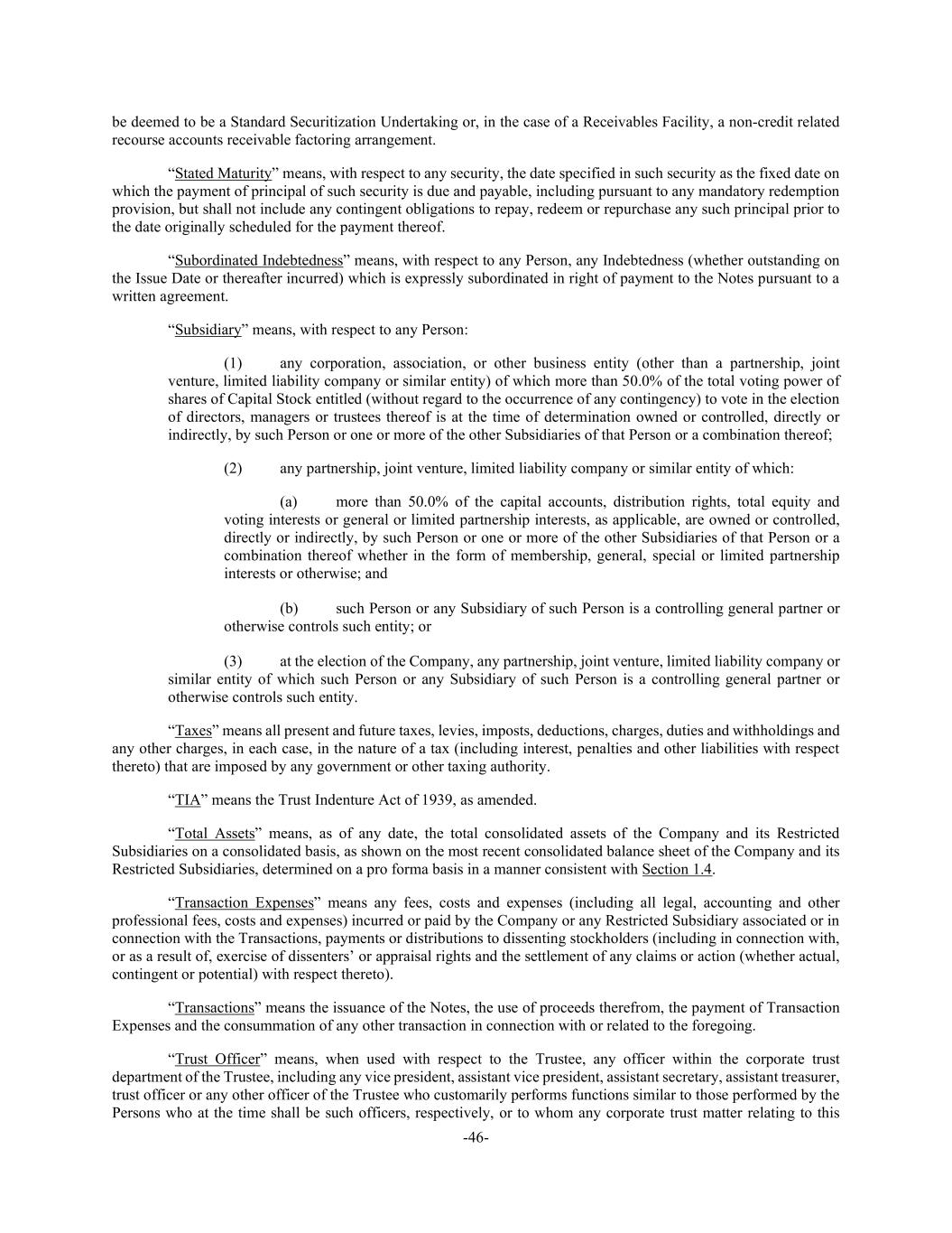 -46- be deemed to be a Standard Securitization Undertaking or, in the case of a Receivables Facility, a non-credit related recourse accounts receivable factoring arrangement. “Stated Maturity” means, with respect to any security, the date specified in such security as the fixed date on which the payment of principal of such security is due and payable, including pursuant to any mandatory redemption provision, but shall not include any contingent obligations to repay, redeem or repurchase any such principal prior to the date originally scheduled for the payment thereof. “Subordinated Indebtedness” means, with respect to any Person, any Indebtedness (whether outstanding on the Issue Date or thereafter incurred) which is expressly subordinated in right of payment to the Notes pursuant to a written agreement. “Subsidiary” means, with respect to any Person: (1) any corporation, association, or other business entity (other than a partnership, joint venture, limited liability company or similar entity) of which more than 50.0% of the total voting power of shares of Capital Stock entitled (without regard to the occurrence of any contingency) to vote in the election of directors, managers or trustees thereof is at the time of determination owned or controlled, directly or indirectly, by such Person or one or more of the other Subsidiaries of that Person or a combination thereof; (2) any partnership, joint venture, limited liability company or similar entity of which: (a) more than 50.0% of the capital accounts, distribution rights, total equity and voting interests or general or limited partnership interests, as applicable, are owned or controlled, directly or indirectly, by such Person or one or more of the other Subsidiaries of that Person or a combination thereof whether in the form of membership, general, special or limited partnership interests or otherwise; and (b) such Person or any Subsidiary of such Person is a controlling general partner or otherwise controls such entity; or (3) at the election of the Company, any partnership, joint venture, limited liability company or similar entity of which such Person or any Subsidiary of such Person is a controlling general partner or otherwise controls such entity. “Taxes” means all present and future taxes, levies, imposts, deductions, charges, duties and withholdings and any other charges, in each case, in the nature of a tax (including interest, penalties and other liabilities with respect thereto) that are imposed by any government or other taxing authority. “TIA” means the Trust Indenture Act of 1939, as amended. “Total Assets” means, as of any date, the total consolidated assets of the Company and its Restricted Subsidiaries on a consolidated basis, as shown on the most recent consolidated balance sheet of the Company and its Restricted Subsidiaries, determined on a pro forma basis in a manner consistent with Section 1.4. “Transaction Expenses” means any fees, costs and expenses (including all legal, accounting and other professional fees, costs and expenses) incurred or paid by the Company or any Restricted Subsidiary associated or in connection with the Transactions, payments or distributions to dissenting stockholders (including in connection with, or as a result of, exercise of dissenters’ or appraisal rights and the settlement of any claims or action (whether actual, contingent or potential) with respect thereto). “Transactions” means the issuance of the Notes, the use of proceeds therefrom, the payment of Transaction Expenses and the consummation of any other transaction in connection with or related to the foregoing. “Trust Officer” means, when used with respect to the Trustee, any officer within the corporate trust department of the Trustee, including any vice president, assistant vice president, assistant secretary, assistant treasurer, trust officer or any other officer of the Trustee who customarily performs functions similar to those performed by the Persons who at the time shall be such officers, respectively, or to whom any corporate trust matter relating to this