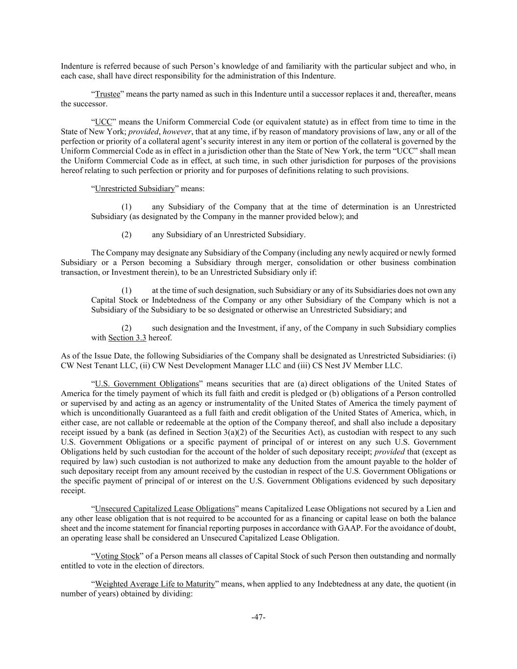 -47- Indenture is referred because of such Person’s knowledge of and familiarity with the particular subject and who, in each case, shall have direct responsibility for the administration of this Indenture. “Trustee” means the party named as such in this Indenture until a successor replaces it and, thereafter, means the successor. “UCC” means the Uniform Commercial Code (or equivalent statute) as in effect from time to time in the State of New York; provided, however, that at any time, if by reason of mandatory provisions of law, any or all of the perfection or priority of a collateral agent’s security interest in any item or portion of the collateral is governed by the Uniform Commercial Code as in effect in a jurisdiction other than the State of New York, the term “UCC” shall mean the Uniform Commercial Code as in effect, at such time, in such other jurisdiction for purposes of the provisions hereof relating to such perfection or priority and for purposes of definitions relating to such provisions. “Unrestricted Subsidiary” means: (1) any Subsidiary of the Company that at the time of determination is an Unrestricted Subsidiary (as designated by the Company in the manner provided below); and (2) any Subsidiary of an Unrestricted Subsidiary. The Company may designate any Subsidiary of the Company (including any newly acquired or newly formed Subsidiary or a Person becoming a Subsidiary through merger, consolidation or other business combination transaction, or Investment therein), to be an Unrestricted Subsidiary only if: (1) at the time of such designation, such Subsidiary or any of its Subsidiaries does not own any Capital Stock or Indebtedness of the Company or any other Subsidiary of the Company which is not a Subsidiary of the Subsidiary to be so designated or otherwise an Unrestricted Subsidiary; and (2) such designation and the Investment, if any, of the Company in such Subsidiary complies with Section 3.3 hereof. As of the Issue Date, the following Subsidiaries of the Company shall be designated as Unrestricted Subsidiaries: (i) CW Nest Tenant LLC, (ii) CW Nest Development Manager LLC and (iii) CS Nest JV Member LLC. “U.S. Government Obligations” means securities that are (a) direct obligations of the United States of America for the timely payment of which its full faith and credit is pledged or (b) obligations of a Person controlled or supervised by and acting as an agency or instrumentality of the United States of America the timely payment of which is unconditionally Guaranteed as a full faith and credit obligation of the United States of America, which, in either case, are not callable or redeemable at the option of the Company thereof, and shall also include a depositary receipt issued by a bank (as defined in Section 3(a)(2) of the Securities Act), as custodian with respect to any such U.S. Government Obligations or a specific payment of principal of or interest on any such U.S. Government Obligations held by such custodian for the account of the holder of such depositary receipt; provided that (except as required by law) such custodian is not authorized to make any deduction from the amount payable to the holder of such depositary receipt from any amount received by the custodian in respect of the U.S. Government Obligations or the specific payment of principal of or interest on the U.S. Government Obligations evidenced by such depositary receipt. “Unsecured Capitalized Lease Obligations” means Capitalized Lease Obligations not secured by a Lien and any other lease obligation that is not required to be accounted for as a financing or capital lease on both the balance sheet and the income statement for financial reporting purposes in accordance with GAAP. For the avoidance of doubt, an operating lease shall be considered an Unsecured Capitalized Lease Obligation. “Voting Stock” of a Person means all classes of Capital Stock of such Person then outstanding and normally entitled to vote in the election of directors. “Weighted Average Life to Maturity” means, when applied to any Indebtedness at any date, the quotient (in number of years) obtained by dividing: