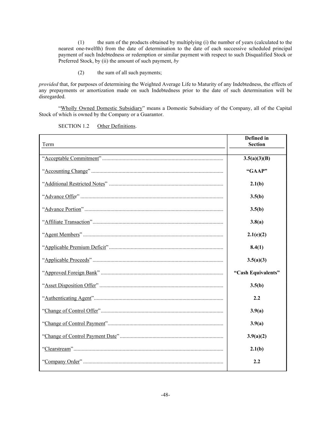 -48- (1) the sum of the products obtained by multiplying (i) the number of years (calculated to the nearest one-twelfth) from the date of determination to the date of each successive scheduled principal payment of such Indebtedness or redemption or similar payment with respect to such Disqualified Stock or Preferred Stock, by (ii) the amount of such payment, by (2) the sum of all such payments; provided that, for purposes of determining the Weighted Average Life to Maturity of any Indebtedness, the effects of any prepayments or amortization made on such Indebtedness prior to the date of such determination will be disregarded. “Wholly Owned Domestic Subsidiary” means a Domestic Subsidiary of the Company, all of the Capital Stock of which is owned by the Company or a Guarantor. SECTION 1.2 Other Definitions. Term Defined in Section “Acceptable Commitment” ......................................................................................... 3.5(a)(3)(B) “Accounting Change” ................................................................................................. “GAAP” “Additional Restricted Notes” .................................................................................... 2.1(b) “Advance Offer” ......................................................................................................... 3.5(b) “Advance Portion” ...................................................................................................... 3.5(b) “Affiliate Transaction” ................................................................................................ 3.8(a) “Agent Members” ....................................................................................................... 2.1(e)(2) “Applicable Premium Deficit” .................................................................................... 8.4(1) “Applicable Proceeds” ................................................................................................ 3.5(a)(3) “Approved Foreign Bank” .......................................................................................... “Cash Equivalents” “Asset Disposition Offer” ........................................................................................... 3.5(b) “Authenticating Agent” ............................................................................................... 2.2 “Change of Control Offer” .......................................................................................... 3.9(a) “Change of Control Payment” ..................................................................................... 3.9(a) “Change of Control Payment Date” ............................................................................ 3.9(a)(2) “Clearstream” .............................................................................................................. 2.1(b) “Company Order” ....................................................................................................... 2.2
