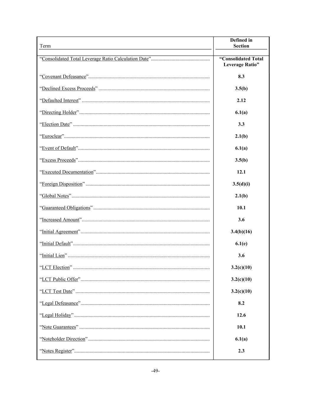 -49- Term Defined in Section “Consolidated Total Leverage Ratio Calculation Date” .............................................. “Consolidated Total Leverage Ratio” “Covenant Defeasance”............................................................................................... 8.3 “Declined Excess Proceeds” ....................................................................................... 3.5(b) “Defaulted Interest” .................................................................................................... 2.12 “Directing Holder” ...................................................................................................... 6.1(a) “Election Date” ........................................................................................................... 3.3 “Euroclear” .................................................................................................................. 2.1(b) “Event of Default” ....................................................................................................... 6.1(a) “Excess Proceeds” ....................................................................................................... 3.5(b) “Executed Documentation” ......................................................................................... 12.1 “Foreign Disposition” ................................................................................................. 3.5(d)(i) “Global Notes” ............................................................................................................ 2.1(b) “Guaranteed Obligations” ........................................................................................... 10.1 “Increased Amount” .................................................................................................... 3.6 “Initial Agreement” ..................................................................................................... 3.4(b)(16) “Initial Default” ........................................................................................................... 6.1(e) “Initial Lien” ............................................................................................................... 3.6 “LCT Election” ........................................................................................................... 3.2(c)(10) “LCT Public Offer” ..................................................................................................... 3.2(c)(10) “LCT Test Date” ......................................................................................................... 3.2(c)(10) “Legal Defeasance” ..................................................................................................... 8.2 “Legal Holiday” .......................................................................................................... 12.6 “Note Guarantees” ...................................................................................................... 10.1 “Noteholder Direction” ............................................................................................... 6.1(a) “Notes Register”.......................................................................................................... 2.3