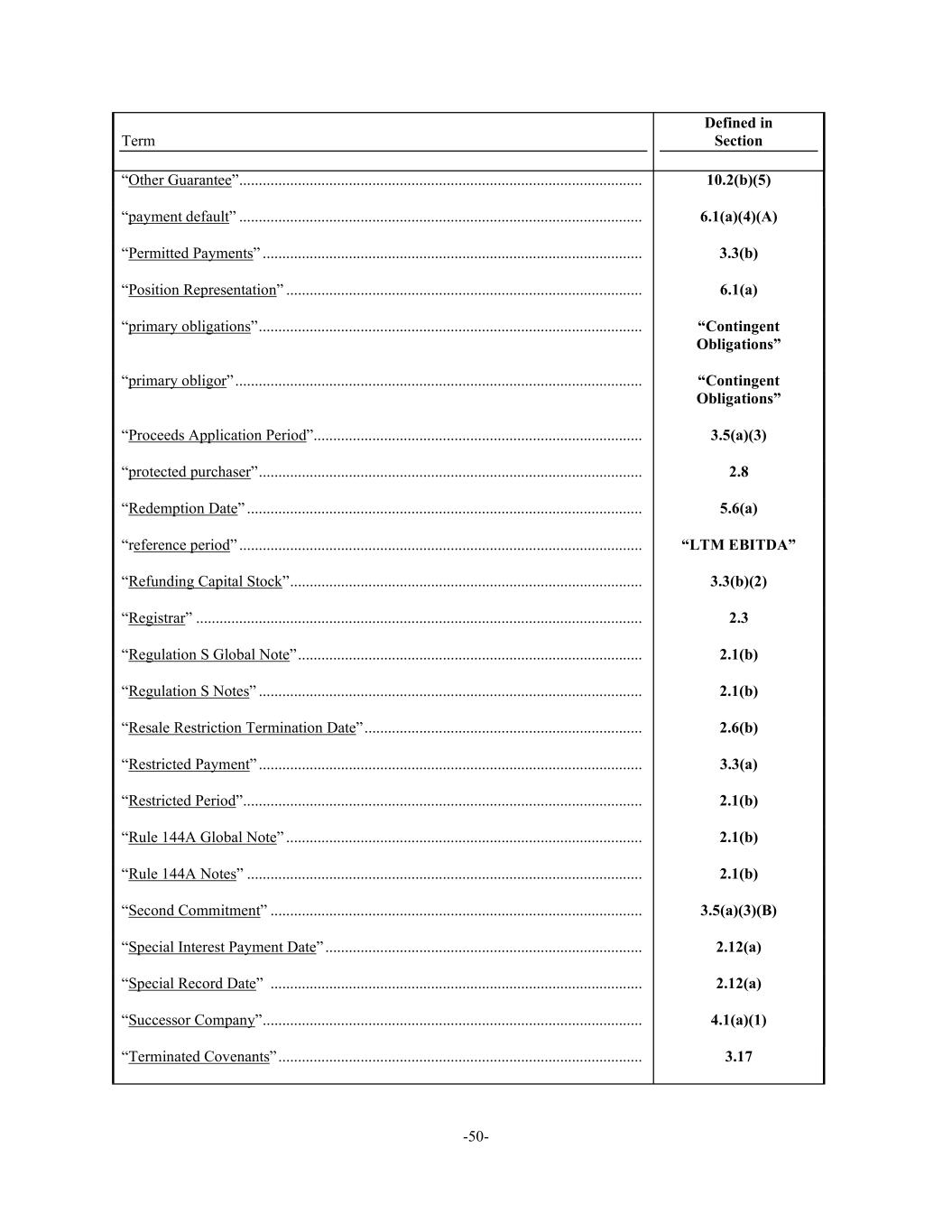 -50- Term Defined in Section “Other Guarantee” ....................................................................................................... 10.2(b)(5) “payment default” ....................................................................................................... 6.1(a)(4)(A) “Permitted Payments” ................................................................................................. 3.3(b) “Position Representation” ........................................................................................... 6.1(a) “primary obligations” .................................................................................................. “Contingent Obligations” “primary obligor” ........................................................................................................ “Contingent Obligations” “Proceeds Application Period” .................................................................................... 3.5(a)(3) “protected purchaser” .................................................................................................. 2.8 “Redemption Date” ..................................................................................................... 5.6(a) “reference period” ....................................................................................................... “LTM EBITDA” “Refunding Capital Stock” .......................................................................................... 3.3(b)(2) “Registrar” .................................................................................................................. 2.3 “Regulation S Global Note” ........................................................................................ 2.1(b) “Regulation S Notes” .................................................................................................. 2.1(b) “Resale Restriction Termination Date” ....................................................................... 2.6(b) “Restricted Payment” .................................................................................................. 3.3(a) “Restricted Period” ...................................................................................................... 2.1(b) “Rule 144A Global Note” ........................................................................................... 2.1(b) “Rule 144A Notes” ..................................................................................................... 2.1(b) “Second Commitment” ............................................................................................... 3.5(a)(3)(B) “Special Interest Payment Date” ................................................................................. 2.12(a) “Special Record Date” ............................................................................................... 2.12(a) “Successor Company” ................................................................................................. 4.1(a)(1) “Terminated Covenants” ............................................................................................. 3.17