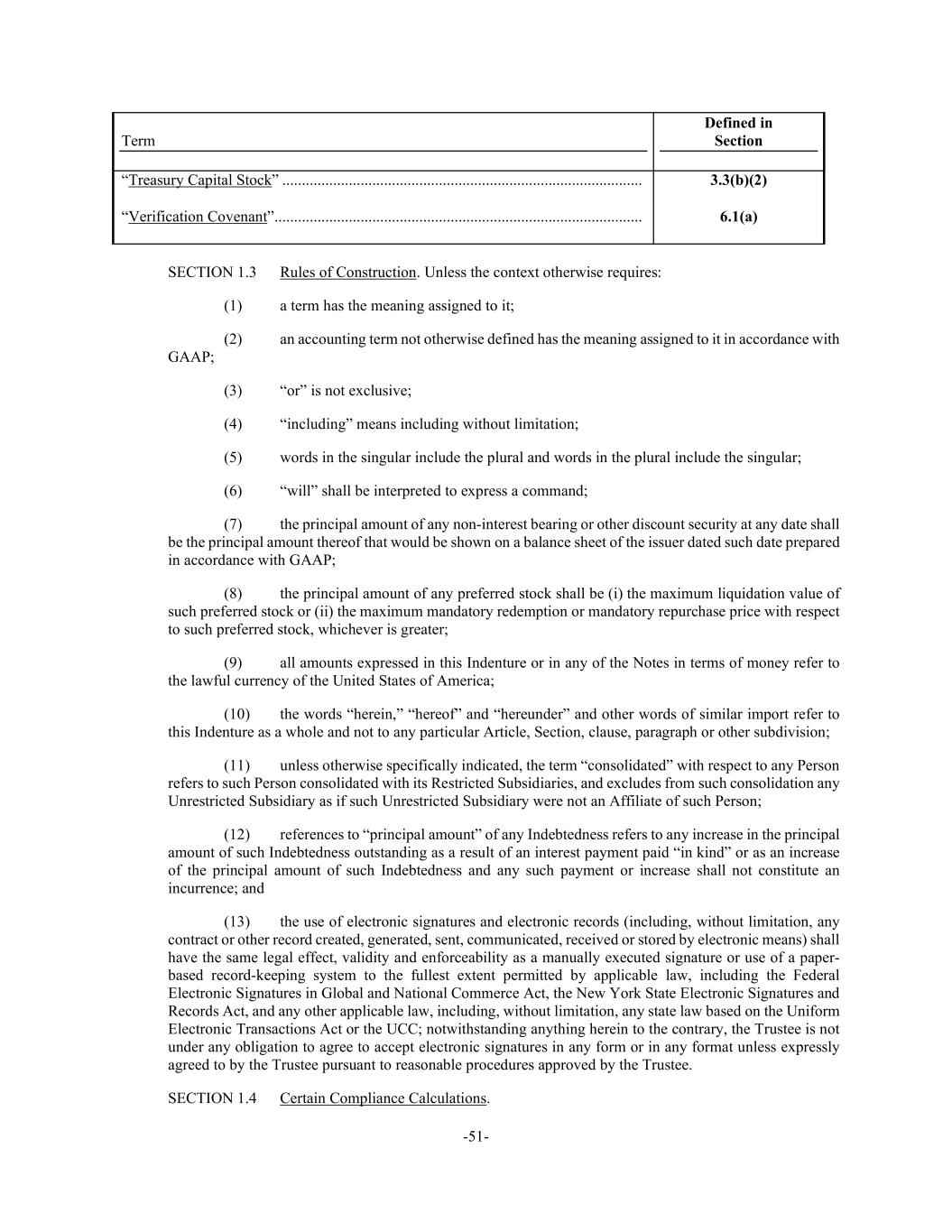 -51- Term Defined in Section “Treasury Capital Stock” ............................................................................................ 3.3(b)(2) “Verification Covenant” .............................................................................................. 6.1(a) SECTION 1.3 Rules of Construction. Unless the context otherwise requires: (1) a term has the meaning assigned to it; (2) an accounting term not otherwise defined has the meaning assigned to it in accordance with GAAP; (3) “or” is not exclusive; (4) “including” means including without limitation; (5) words in the singular include the plural and words in the plural include the singular; (6) “will” shall be interpreted to express a command; (7) the principal amount of any non-interest bearing or other discount security at any date shall be the principal amount thereof that would be shown on a balance sheet of the issuer dated such date prepared in accordance with GAAP; (8) the principal amount of any preferred stock shall be (i) the maximum liquidation value of such preferred stock or (ii) the maximum mandatory redemption or mandatory repurchase price with respect to such preferred stock, whichever is greater; (9) all amounts expressed in this Indenture or in any of the Notes in terms of money refer to the lawful currency of the United States of America; (10) the words “herein,” “hereof” and “hereunder” and other words of similar import refer to this Indenture as a whole and not to any particular Article, Section, clause, paragraph or other subdivision; (11) unless otherwise specifically indicated, the term “consolidated” with respect to any Person refers to such Person consolidated with its Restricted Subsidiaries, and excludes from such consolidation any Unrestricted Subsidiary as if such Unrestricted Subsidiary were not an Affiliate of such Person; (12) references to “principal amount” of any Indebtedness refers to any increase in the principal amount of such Indebtedness outstanding as a result of an interest payment paid “in kind” or as an increase of the principal amount of such Indebtedness and any such payment or increase shall not constitute an incurrence; and (13) the use of electronic signatures and electronic records (including, without limitation, any contract or other record created, generated, sent, communicated, received or stored by electronic means) shall have the same legal effect, validity and enforceability as a manually executed signature or use of a paper- based record-keeping system to the fullest extent permitted by applicable law, including the Federal Electronic Signatures in Global and National Commerce Act, the New York State Electronic Signatures and Records Act, and any other applicable law, including, without limitation, any state law based on the Uniform Electronic Transactions Act or the UCC; notwithstanding anything herein to the contrary, the Trustee is not under any obligation to agree to accept electronic signatures in any form or in any format unless expressly agreed to by the Trustee pursuant to reasonable procedures approved by the Trustee. SECTION 1.4 Certain Compliance Calculations.