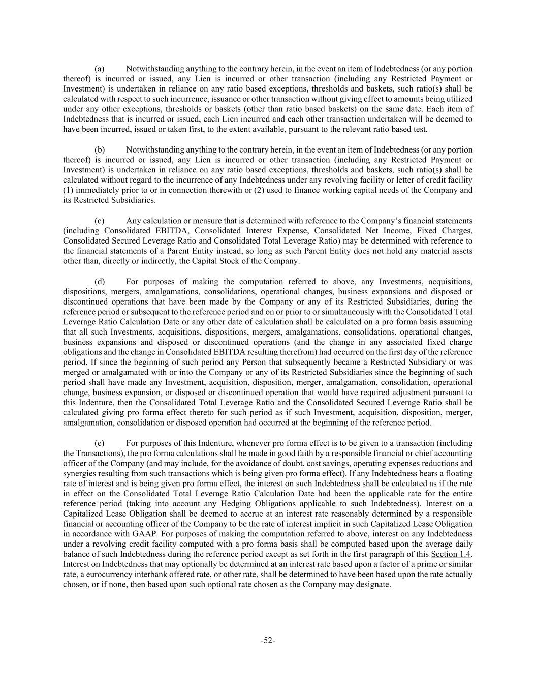 -52- (a) Notwithstanding anything to the contrary herein, in the event an item of Indebtedness (or any portion thereof) is incurred or issued, any Lien is incurred or other transaction (including any Restricted Payment or Investment) is undertaken in reliance on any ratio based exceptions, thresholds and baskets, such ratio(s) shall be calculated with respect to such incurrence, issuance or other transaction without giving effect to amounts being utilized under any other exceptions, thresholds or baskets (other than ratio based baskets) on the same date. Each item of Indebtedness that is incurred or issued, each Lien incurred and each other transaction undertaken will be deemed to have been incurred, issued or taken first, to the extent available, pursuant to the relevant ratio based test. (b) Notwithstanding anything to the contrary herein, in the event an item of Indebtedness (or any portion thereof) is incurred or issued, any Lien is incurred or other transaction (including any Restricted Payment or Investment) is undertaken in reliance on any ratio based exceptions, thresholds and baskets, such ratio(s) shall be calculated without regard to the incurrence of any Indebtedness under any revolving facility or letter of credit facility (1) immediately prior to or in connection therewith or (2) used to finance working capital needs of the Company and its Restricted Subsidiaries. (c) Any calculation or measure that is determined with reference to the Company’s financial statements (including Consolidated EBITDA, Consolidated Interest Expense, Consolidated Net Income, Fixed Charges, Consolidated Secured Leverage Ratio and Consolidated Total Leverage Ratio) may be determined with reference to the financial statements of a Parent Entity instead, so long as such Parent Entity does not hold any material assets other than, directly or indirectly, the Capital Stock of the Company. (d) For purposes of making the computation referred to above, any Investments, acquisitions, dispositions, mergers, amalgamations, consolidations, operational changes, business expansions and disposed or discontinued operations that have been made by the Company or any of its Restricted Subsidiaries, during the reference period or subsequent to the reference period and on or prior to or simultaneously with the Consolidated Total Leverage Ratio Calculation Date or any other date of calculation shall be calculated on a pro forma basis assuming that all such Investments, acquisitions, dispositions, mergers, amalgamations, consolidations, operational changes, business expansions and disposed or discontinued operations (and the change in any associated fixed charge obligations and the change in Consolidated EBITDA resulting therefrom) had occurred on the first day of the reference period. If since the beginning of such period any Person that subsequently became a Restricted Subsidiary or was merged or amalgamated with or into the Company or any of its Restricted Subsidiaries since the beginning of such period shall have made any Investment, acquisition, disposition, merger, amalgamation, consolidation, operational change, business expansion, or disposed or discontinued operation that would have required adjustment pursuant to this Indenture, then the Consolidated Total Leverage Ratio and the Consolidated Secured Leverage Ratio shall be calculated giving pro forma effect thereto for such period as if such Investment, acquisition, disposition, merger, amalgamation, consolidation or disposed operation had occurred at the beginning of the reference period. (e) For purposes of this Indenture, whenever pro forma effect is to be given to a transaction (including the Transactions), the pro forma calculations shall be made in good faith by a responsible financial or chief accounting officer of the Company (and may include, for the avoidance of doubt, cost savings, operating expenses reductions and synergies resulting from such transactions which is being given pro forma effect). If any Indebtedness bears a floating rate of interest and is being given pro forma effect, the interest on such Indebtedness shall be calculated as if the rate in effect on the Consolidated Total Leverage Ratio Calculation Date had been the applicable rate for the entire reference period (taking into account any Hedging Obligations applicable to such Indebtedness). Interest on a Capitalized Lease Obligation shall be deemed to accrue at an interest rate reasonably determined by a responsible financial or accounting officer of the Company to be the rate of interest implicit in such Capitalized Lease Obligation in accordance with GAAP. For purposes of making the computation referred to above, interest on any Indebtedness under a revolving credit facility computed with a pro forma basis shall be computed based upon the average daily balance of such Indebtedness during the reference period except as set forth in the first paragraph of this Section 1.4. Interest on Indebtedness that may optionally be determined at an interest rate based upon a factor of a prime or similar rate, a eurocurrency interbank offered rate, or other rate, shall be determined to have been based upon the rate actually chosen, or if none, then based upon such optional rate chosen as the Company may designate.
