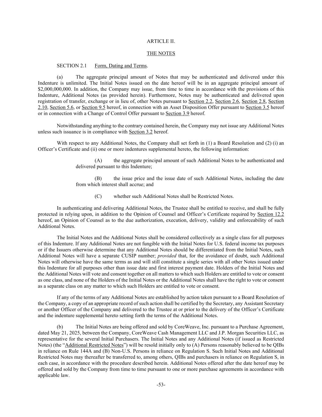 -53- ARTICLE II. THE NOTES SECTION 2.1 Form, Dating and Terms. (a) The aggregate principal amount of Notes that may be authenticated and delivered under this Indenture is unlimited. The Initial Notes issued on the date hereof will be in an aggregate principal amount of $2,000,000,000. In addition, the Company may issue, from time to time in accordance with the provisions of this Indenture, Additional Notes (as provided herein). Furthermore, Notes may be authenticated and delivered upon registration of transfer, exchange or in lieu of, other Notes pursuant to Section 2.2, Section 2.6, Section 2.8, Section 2.10, Section 5.6, or Section 9.5 hereof, in connection with an Asset Disposition Offer pursuant to Section 3.5 hereof or in connection with a Change of Control Offer pursuant to Section 3.9 hereof. Notwithstanding anything to the contrary contained herein, the Company may not issue any Additional Notes unless such issuance is in compliance with Section 3.2 hereof. With respect to any Additional Notes, the Company shall set forth in (1) a Board Resolution and (2) (i) an Officer’s Certificate and (ii) one or more indentures supplemental hereto, the following information: (A) the aggregate principal amount of such Additional Notes to be authenticated and delivered pursuant to this Indenture; (B) the issue price and the issue date of such Additional Notes, including the date from which interest shall accrue; and (C) whether such Additional Notes shall be Restricted Notes. In authenticating and delivering Additional Notes, the Trustee shall be entitled to receive, and shall be fully protected in relying upon, in addition to the Opinion of Counsel and Officer’s Certificate required by Section 12.2 hereof, an Opinion of Counsel as to the due authorization, execution, delivery, validity and enforceability of such Additional Notes. The Initial Notes and the Additional Notes shall be considered collectively as a single class for all purposes of this Indenture. If any Additional Notes are not fungible with the Initial Notes for U.S. federal income tax purposes or if the Issuers otherwise determine that any Additional Notes should be differentiated from the Initial Notes, such Additional Notes will have a separate CUSIP number; provided that, for the avoidance of doubt, such Additional Notes will otherwise have the same terms as and will still constitute a single series with all other Notes issued under this Indenture for all purposes other than issue date and first interest payment date. Holders of the Initial Notes and the Additional Notes will vote and consent together on all matters to which such Holders are entitled to vote or consent as one class, and none of the Holders of the Initial Notes or the Additional Notes shall have the right to vote or consent as a separate class on any matter to which such Holders are entitled to vote or consent. If any of the terms of any Additional Notes are established by action taken pursuant to a Board Resolution of the Company, a copy of an appropriate record of such action shall be certified by the Secretary, any Assistant Secretary or another Officer of the Company and delivered to the Trustee at or prior to the delivery of the Officer’s Certificate and the indenture supplemental hereto setting forth the terms of the Additional Notes. (b) The Initial Notes are being offered and sold by CoreWeave, Inc. pursuant to a Purchase Agreement, dated May 21, 2025, between the Company, CoreWeave Cash Management LLC and J.P. Morgan Securities LLC, as representative for the several Initial Purchasers. The Initial Notes and any Additional Notes (if issued as Restricted Notes) (the “Additional Restricted Notes”) will be resold initially only to (A) Persons reasonably believed to be QIBs in reliance on Rule 144A and (B) Non-U.S. Persons in reliance on Regulation S. Such Initial Notes and Additional Restricted Notes may thereafter be transferred to, among others, QIBs and purchasers in reliance on Regulation S, in each case, in accordance with the procedure described herein. Additional Notes offered after the date hereof may be offered and sold by the Company from time to time pursuant to one or more purchase agreements in accordance with applicable law.