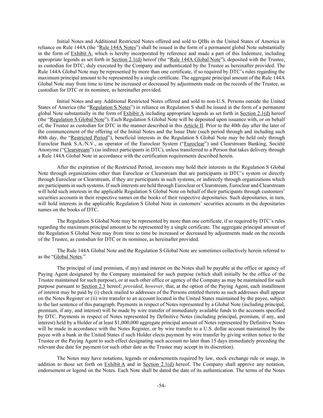 -54- Initial Notes and Additional Restricted Notes offered and sold to QIBs in the United States of America in reliance on Rule 144A (the “Rule 144A Notes”) shall be issued in the form of a permanent global Note substantially in the form of Exhibit A, which is hereby incorporated by reference and made a part of this Indenture, including appropriate legends as set forth in Section 2.1(d) hereof (the “Rule 144A Global Note”), deposited with the Trustee, as custodian for DTC, duly executed by the Company and authenticated by the Trustee as hereinafter provided. The Rule 144A Global Note may be represented by more than one certificate, if so required by DTC’s rules regarding the maximum principal amount to be represented by a single certificate. The aggregate principal amount of the Rule 144A Global Note may from time to time be increased or decreased by adjustments made on the records of the Trustee, as custodian for DTC or its nominee, as hereinafter provided. Initial Notes and any Additional Restricted Notes offered and sold to non-U.S. Persons outside the United States of America (the “Regulation S Notes”) in reliance on Regulation S shall be issued in the form of a permanent global Note substantially in the form of Exhibit A including appropriate legends as set forth in Section 2.1(d) hereof (the “Regulation S Global Note”). Each Regulation S Global Note will be deposited upon issuance with, or on behalf of, the Trustee as custodian for DTC in the manner described in this Article II. Prior to the 40th day after the later of the commencement of the offering of the Initial Notes and the Issue Date (such period through and including such 40th day, the “Restricted Period”), beneficial interests in the Regulation S Global Note may be held only through Euroclear Bank S.A./N.V., as operator of the Euroclear System (“Euroclear”) and Clearstream Banking, Société Anonyme (“Clearstream”) (as indirect participants in DTC), unless transferred to a Person that takes delivery through a Rule 144A Global Note in accordance with the certification requirements described herein. After the expiration of the Restricted Period, investors may hold their interests in the Regulation S Global Note through organizations other than Euroclear or Clearstream that are participants in DTC’s system or directly through Euroclear or Clearstream, if they are participants in such systems, or indirectly through organizations which are participants in such systems. If such interests are held through Euroclear or Clearstream, Euroclear and Clearstream will hold such interests in the applicable Regulation S Global Note on behalf of their participants through customers’ securities accounts in their respective names on the books of their respective depositaries. Such depositaries, in turn, will hold interests in the applicable Regulation S Global Note in customers’ securities accounts in the depositaries names on the books of DTC. The Regulation S Global Note may be represented by more than one certificate, if so required by DTC’s rules regarding the maximum principal amount to be represented by a single certificate. The aggregate principal amount of the Regulation S Global Note may from time to time be increased or decreased by adjustments made on the records of the Trustee, as custodian for DTC or its nominee, as hereinafter provided. The Rule 144A Global Note and the Regulation S Global Note are sometimes collectively herein referred to as the “Global Notes.” The principal of (and premium, if any) and interest on the Notes shall be payable at the office or agency of Paying Agent designated by the Company maintained for such purpose (which shall initially be the office of the Trustee maintained for such purpose), or at such other office or agency of the Company as may be maintained for such purpose pursuant to Section 2.3 hereof; provided, however, that, at the option of the Paying Agent, each installment of interest may be paid by (i) check mailed to addresses of the Persons entitled thereto as such addresses shall appear on the Notes Register or (ii) wire transfer to an account located in the United States maintained by the payee, subject to the last sentence of this paragraph. Payments in respect of Notes represented by a Global Note (including principal, premium, if any, and interest) will be made by wire transfer of immediately available funds to the accounts specified by DTC. Payments in respect of Notes represented by Definitive Notes (including principal, premium, if any, and interest) held by a Holder of at least $1,000,000 aggregate principal amount of Notes represented by Definitive Notes will be made in accordance with the Notes Register, or by wire transfer to a U.S. dollar account maintained by the payee with a bank in the United States if such Holder elects payment by wire transfer by giving written notice to the Trustee or the Paying Agent to such effect designating such account no later than 15 days immediately preceding the relevant due date for payment (or such other date as the Trustee may accept in its discretion). The Notes may have notations, legends or endorsements required by law, stock exchange rule or usage, in addition to those set forth on Exhibit A and in Section 2.1(d) hereof. The Company shall approve any notation, endorsement or legend on the Notes. Each Note shall be dated the date of its authentication. The terms of the Notes