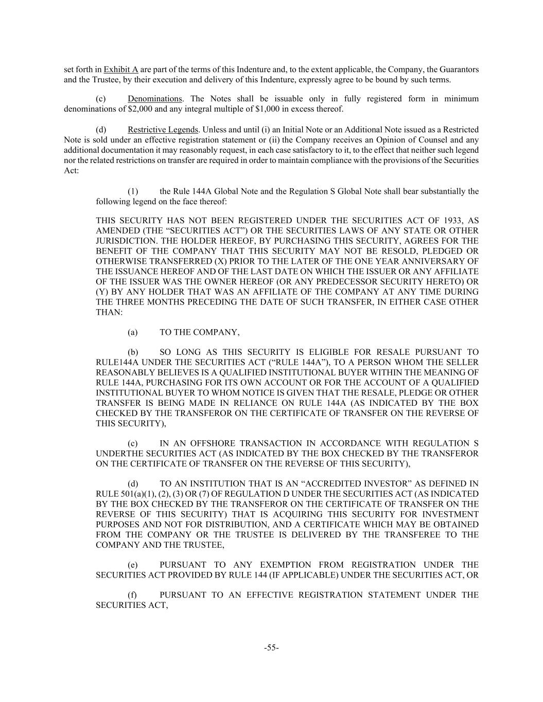 -55- set forth in Exhibit A are part of the terms of this Indenture and, to the extent applicable, the Company, the Guarantors and the Trustee, by their execution and delivery of this Indenture, expressly agree to be bound by such terms. (c) Denominations. The Notes shall be issuable only in fully registered form in minimum denominations of $2,000 and any integral multiple of $1,000 in excess thereof. (d) Restrictive Legends. Unless and until (i) an Initial Note or an Additional Note issued as a Restricted Note is sold under an effective registration statement or (ii) the Company receives an Opinion of Counsel and any additional documentation it may reasonably request, in each case satisfactory to it, to the effect that neither such legend nor the related restrictions on transfer are required in order to maintain compliance with the provisions of the Securities Act: (1) the Rule 144A Global Note and the Regulation S Global Note shall bear substantially the following legend on the face thereof: THIS SECURITY HAS NOT BEEN REGISTERED UNDER THE SECURITIES ACT OF 1933, AS AMENDED (THE “SECURITIES ACT”) OR THE SECURITIES LAWS OF ANY STATE OR OTHER JURISDICTION. THE HOLDER HEREOF, BY PURCHASING THIS SECURITY, AGREES FOR THE BENEFIT OF THE COMPANY THAT THIS SECURITY MAY NOT BE RESOLD, PLEDGED OR OTHERWISE TRANSFERRED (X) PRIOR TO THE LATER OF THE ONE YEAR ANNIVERSARY OF THE ISSUANCE HEREOF AND OF THE LAST DATE ON WHICH THE ISSUER OR ANY AFFILIATE OF THE ISSUER WAS THE OWNER HEREOF (OR ANY PREDECESSOR SECURITY HERETO) OR (Y) BY ANY HOLDER THAT WAS AN AFFILIATE OF THE COMPANY AT ANY TIME DURING THE THREE MONTHS PRECEDING THE DATE OF SUCH TRANSFER, IN EITHER CASE OTHER THAN: (a) TO THE COMPANY, (b) SO LONG AS THIS SECURITY IS ELIGIBLE FOR RESALE PURSUANT TO RULE144A UNDER THE SECURITIES ACT (“RULE 144A”), TO A PERSON WHOM THE SELLER REASONABLY BELIEVES IS A QUALIFIED INSTITUTIONAL BUYER WITHIN THE MEANING OF RULE 144A, PURCHASING FOR ITS OWN ACCOUNT OR FOR THE ACCOUNT OF A QUALIFIED INSTITUTIONAL BUYER TO WHOM NOTICE IS GIVEN THAT THE RESALE, PLEDGE OR OTHER TRANSFER IS BEING MADE IN RELIANCE ON RULE 144A (AS INDICATED BY THE BOX CHECKED BY THE TRANSFEROR ON THE CERTIFICATE OF TRANSFER ON THE REVERSE OF THIS SECURITY), (c) IN AN OFFSHORE TRANSACTION IN ACCORDANCE WITH REGULATION S UNDERTHE SECURITIES ACT (AS INDICATED BY THE BOX CHECKED BY THE TRANSFEROR ON THE CERTIFICATE OF TRANSFER ON THE REVERSE OF THIS SECURITY), (d) TO AN INSTITUTION THAT IS AN “ACCREDITED INVESTOR” AS DEFINED IN RULE 501(a)(1), (2), (3) OR (7) OF REGULATION D UNDER THE SECURITIES ACT (AS INDICATED BY THE BOX CHECKED BY THE TRANSFEROR ON THE CERTIFICATE OF TRANSFER ON THE REVERSE OF THIS SECURITY) THAT IS ACQUIRING THIS SECURITY FOR INVESTMENT PURPOSES AND NOT FOR DISTRIBUTION, AND A CERTIFICATE WHICH MAY BE OBTAINED FROM THE COMPANY OR THE TRUSTEE IS DELIVERED BY THE TRANSFEREE TO THE COMPANY AND THE TRUSTEE, (e) PURSUANT TO ANY EXEMPTION FROM REGISTRATION UNDER THE SECURITIES ACT PROVIDED BY RULE 144 (IF APPLICABLE) UNDER THE SECURITIES ACT, OR (f) PURSUANT TO AN EFFECTIVE REGISTRATION STATEMENT UNDER THE SECURITIES ACT,